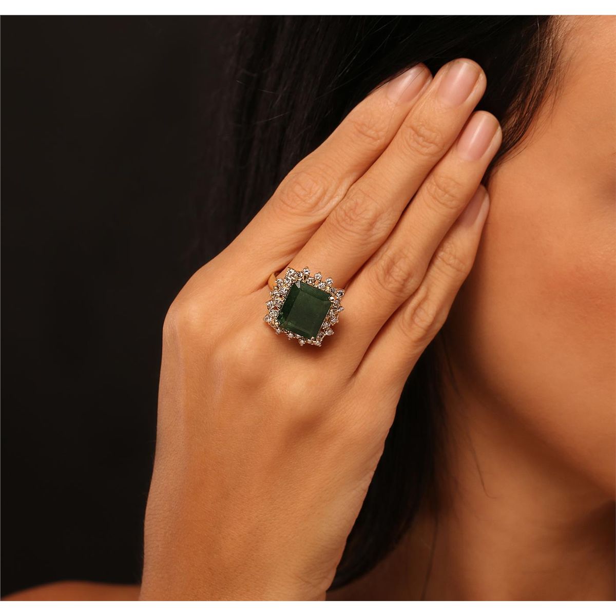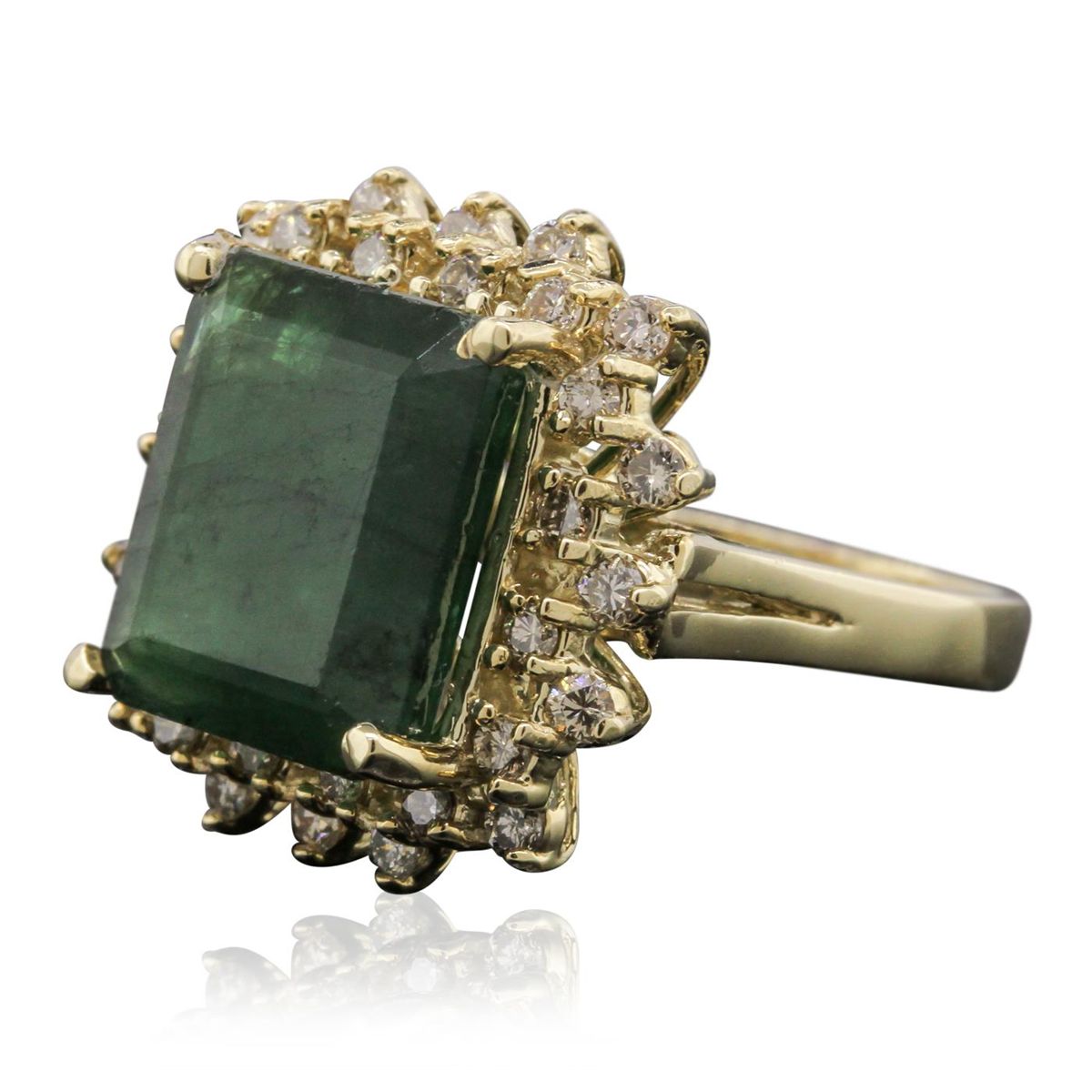 One electronically tested 14KT yellow gold ladies cast emerald and diamond ring with a bright polish finish. Condition is new, good workmanship. The featured emerald is set within a diamond lattice gallery, supported by split shoulders and completed by a three millimeter wide band. Identified with markings of "14K". Containing: One prong set rectangular step cut natural emerald, measuring 14.00 x 11.85 x 7.40mm, 8%. bulge factor, approximate weight of 10.82ct., clarity is severely included, type III, medium, very slightly grayish, very slightly bluish green color, (GIA vslbG 5/3), cut is good. Transmitting light very diffusely, opaque. Naturally occurring internal & external characteristics are present. Indications of oil residue. Colored Stone Grading Report attached. Graded in the setting. Thirty-Two prong set round brilliant cut diamonds, measuring 2.10 - 1.80 x 1.17mm (depth est.) approximate. Total Weight of 32 Stones = 0.96ct. Faint secondary color throughout. Graded in the setting. Clarity: SI-1 to I-1. Color: J - M. Total Weight of Colored Stones 10.82ct. Total Weight of Diamonds 0.96ct. Total Weight of Ring 9.90 grams. AIG Appraised at $5,940.00.