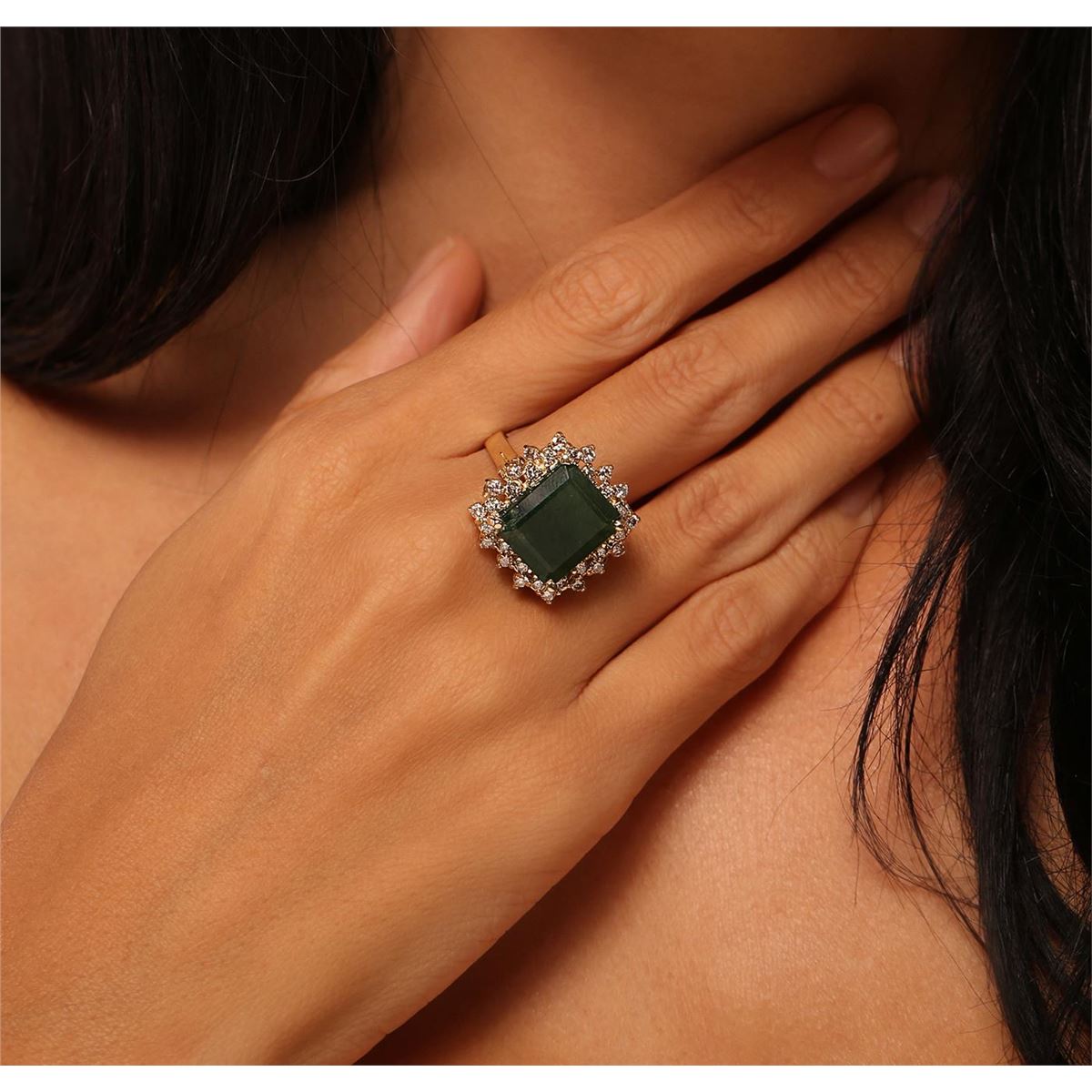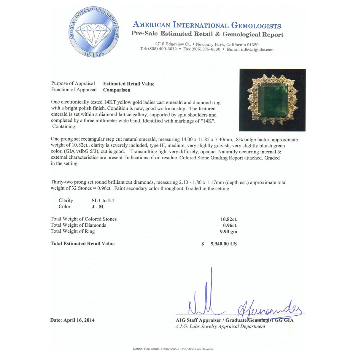 One electronically tested 14KT yellow gold ladies cast emerald and diamond ring with a bright polish finish. Condition is new, good workmanship. The featured emerald is set within a diamond lattice gallery, supported by split shoulders and completed by a three millimeter wide band. Identified with markings of "14K". Containing: One prong set rectangular step cut natural emerald, measuring 14.00 x 11.85 x 7.40mm, 8%. bulge factor, approximate weight of 10.82ct., clarity is severely included, type III, medium, very slightly grayish, very slightly bluish green color, (GIA vslbG 5/3), cut is good. Transmitting light very diffusely, opaque. Naturally occurring internal & external characteristics are present. Indications of oil residue. Colored Stone Grading Report attached. Graded in the setting. Thirty-Two prong set round brilliant cut diamonds, measuring 2.10 - 1.80 x 1.17mm (depth est.) approximate. Total Weight of 32 Stones = 0.96ct. Faint secondary color throughout. Graded in the setting. Clarity: SI-1 to I-1. Color: J - M. Total Weight of Colored Stones 10.82ct. Total Weight of Diamonds 0.96ct. Total Weight of Ring 9.90 grams. AIG Appraised at $5,940.00.