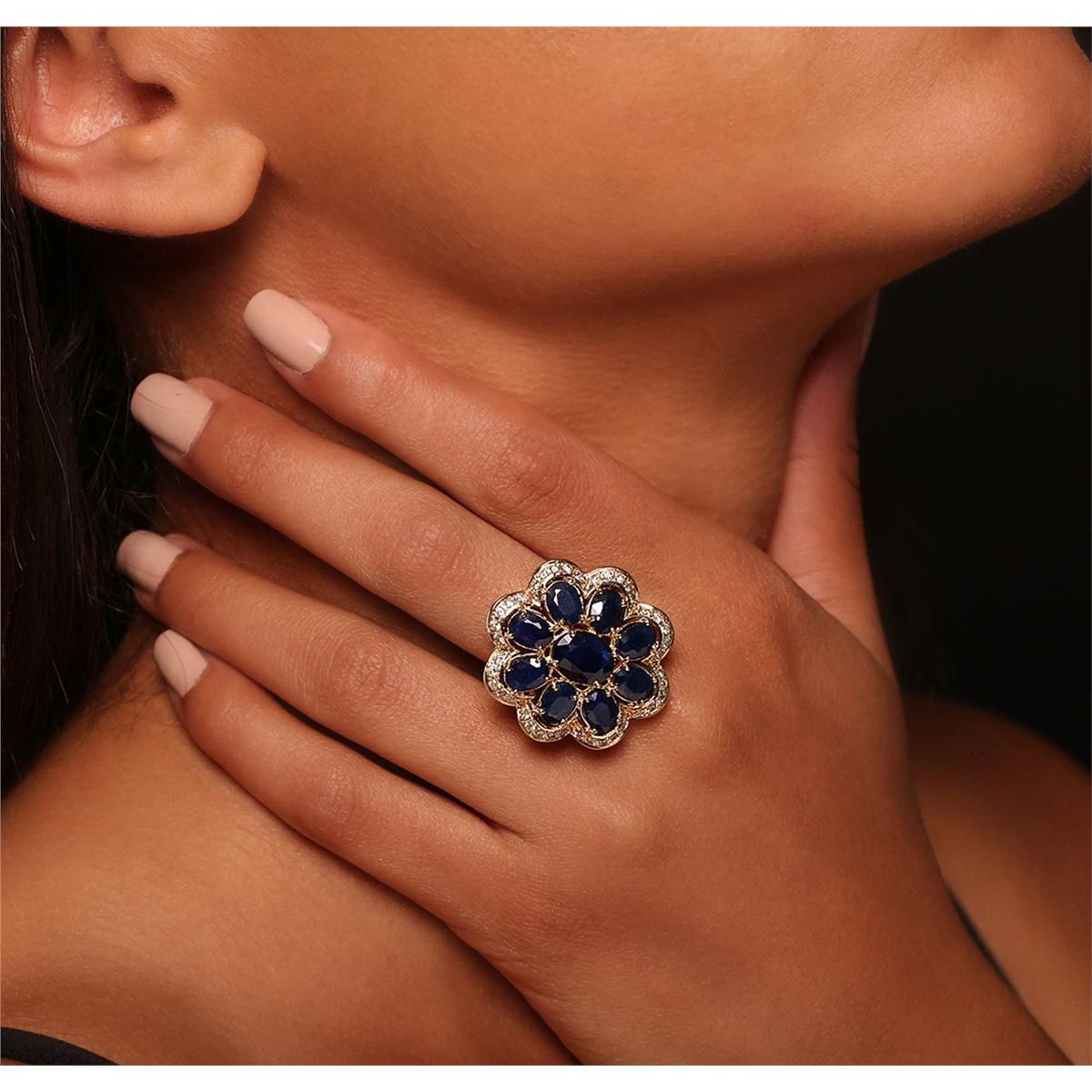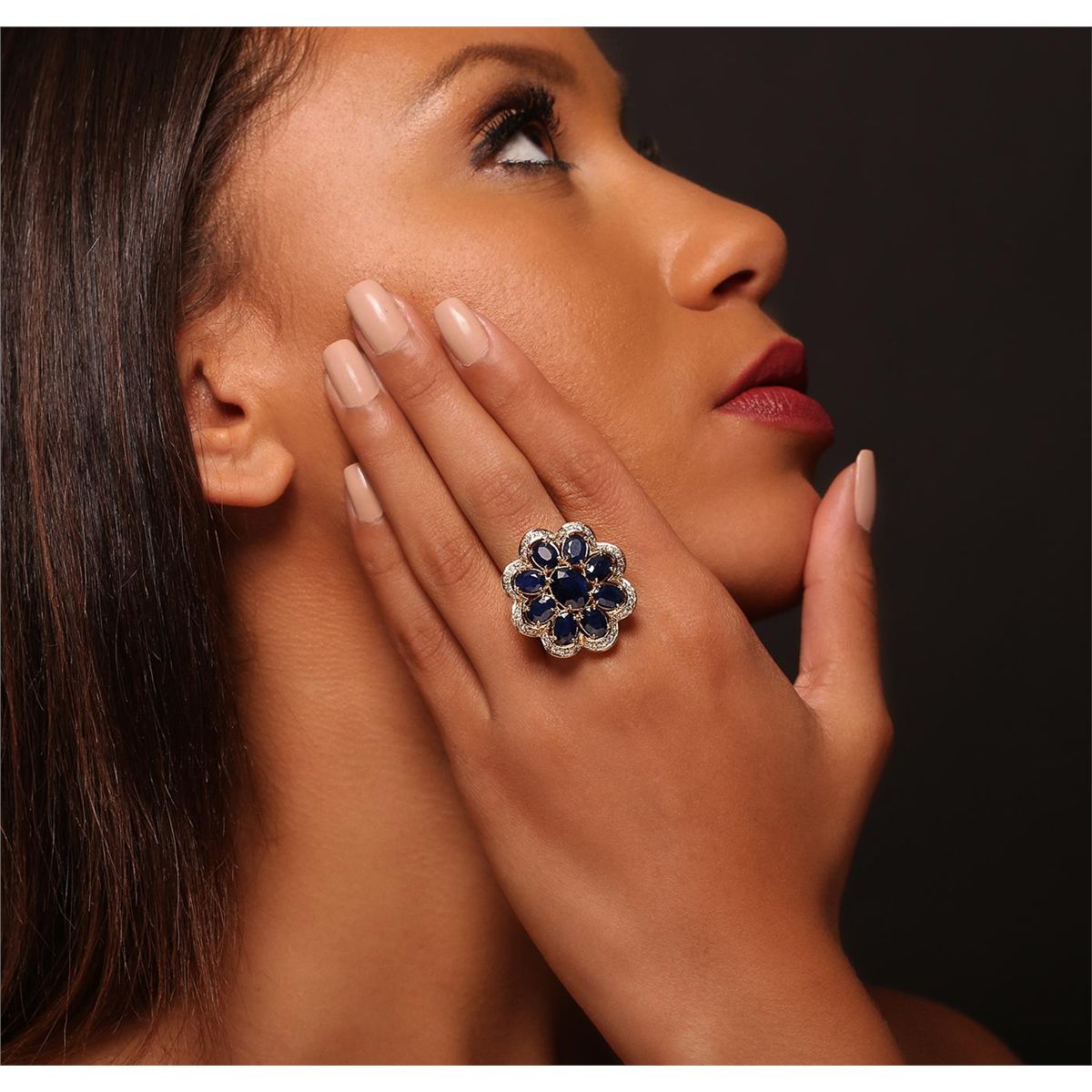 One electronically tested 14KT yellow gold ladies cast sapphire and diamond ring with a bright polish finish. Condition is new, good workmanship. The ring features a sapphire floret set within a stylized diamond bezel, completed by a three millimeter wide band. Identified with markings of "K14". Containing: One prong set oval mixed cut natural blue sapphire, measuring 10.00 x 8.00 x 4.70mm, 5%. bulge factor, approximate weight of 3.30ct., clarity is severely included, type II, dark, very slightly grayish, violetish blue color, (GIA vB 7/3), cut is good. Transmitting light very diffusely, opaque. Naturally occurring internal & external characteristics are present. Indications of multiple laboratory enhancements, including high temperature heat treatment and diffusion treatment. Graded in the setting. Eight prong set oval mixed cut natural blue sapphires, measuring 7.00 x 5.00 x 3.25mm, approximate. Total Weight of 7.52ct., clarity is heavily included, type II, medium dark, very slightly grayish, violetish blue color, (GIA vB 6/3), cut is good. Transmitting light diffusely translucent. Naturally occurring internal & external characteristics are present, including partial color zoning. Measurements & the color grade are an average for the group. Indications of multiple laboratory enhancements, including high temperature heat treatment and diffusion treatment. Graded in the setting. Forty bead set round brilliant cut diamonds, measuring 1.70 - 1.60 x 0.99mm (depth est.) approximate. Total Weight of 40 Stones = 0.75ct. Graded in the setting. Clarity: VS-2 to SI-2. Color: G - I. Total Weight of Colored Stones 10.82ct. Total Weight of Diamonds 0.75ct. Total Weight of Ring 15.58 grams. AIG Appraised at $7,140.00.