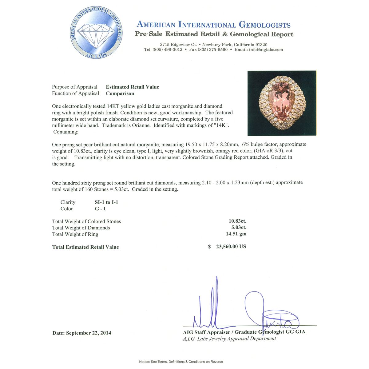 One electronically tested 14KT yellow gold ladies cast morganite and diamond ring with a bright polish finish. The featured morganite is set within an elaborate diamond set curvature, completed by a five millimeter wide band. Trademark is Orianne. Identified with markings of "14K". Condition is new, good workmanship. Containing: One prong set pear brilliant cut natural morganite, measuring 19.50 x 11.75 x 8.20mm, 6% bulge factor, approximate weight of 10.83ct., clarity is eye clean, type I, light, very slightly brownish, orangy red color, (GIA oR 3/3), cut is good. Transmitting light with no distortion, transparent. Colored Stone Grading Report attached. Graded in the setting. One Hundred Sixty prong set round brilliant cut diamonds, measuring 2.10 - 2.00 x 1.23mm (depth est.) approximate total weight of 160 Stones = 5.03ct. Graded in the setting. Clarity: SI-1 to I-1. Color: G - I. Total Weight of Colored Stones 10.83ct. Total Weight of Diamonds 5.03ct. Total Weight of Ring 14.51 grams. AIG Appraised at $23,560.00.