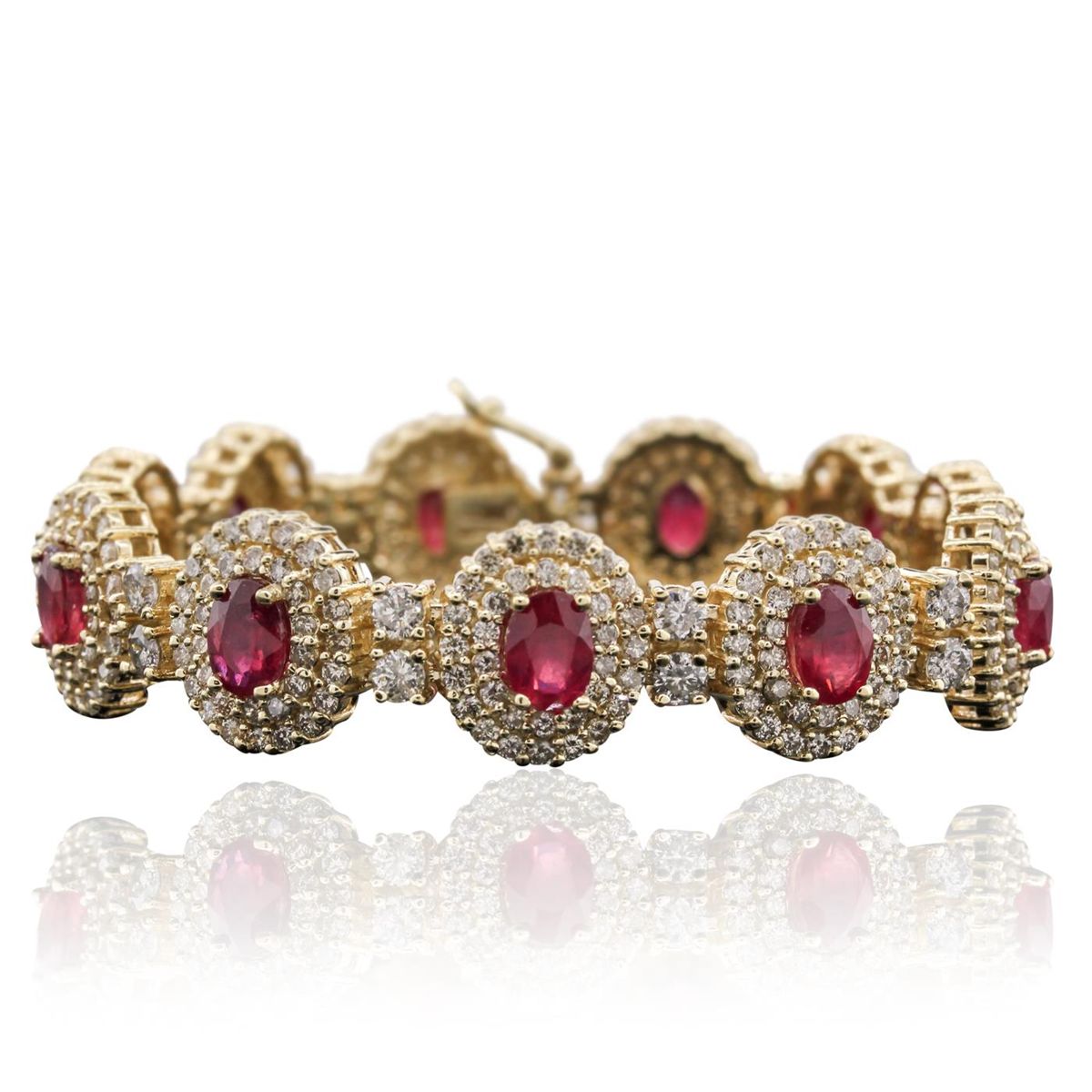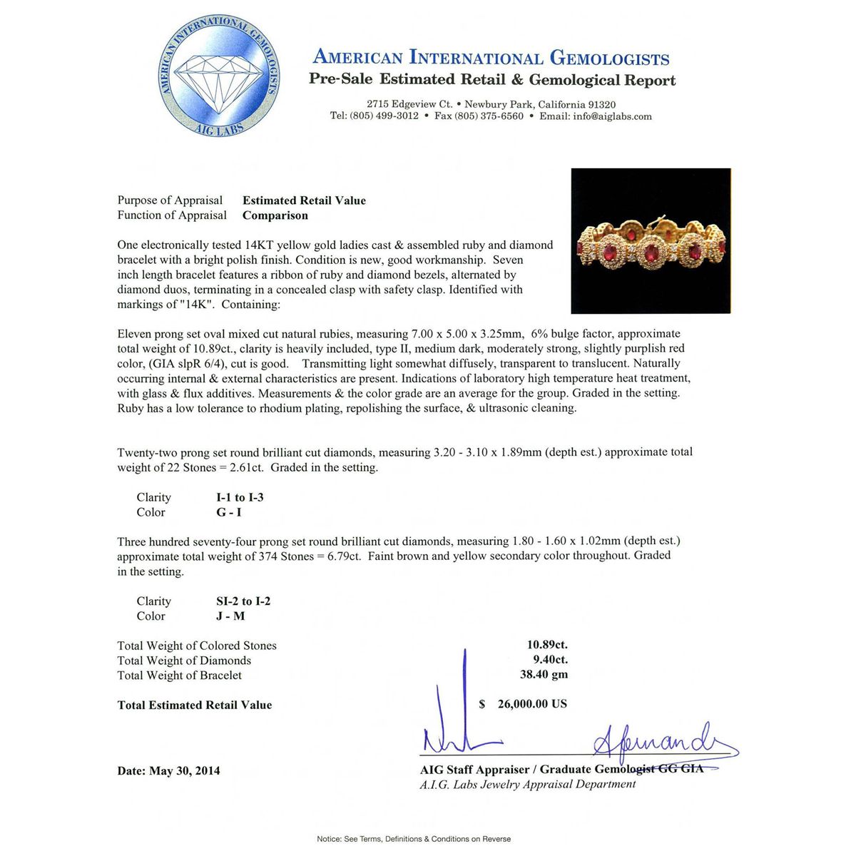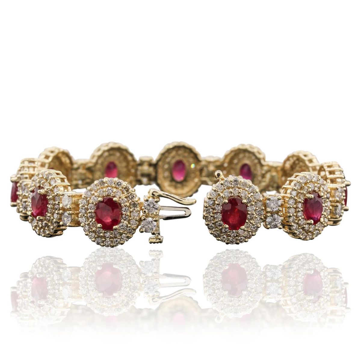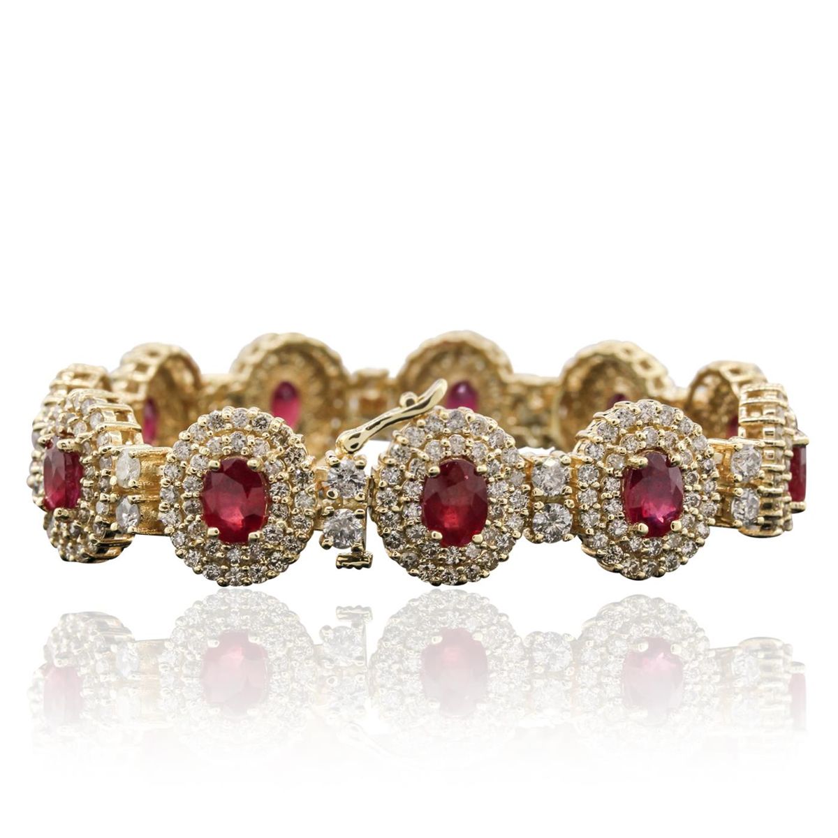 One electronically tested 14KT yellow gold ladies cast & assembled ruby and diamond bracelet with a bright polish finish. Condition is new, good workmanship. Seven inch length bracelet features a ribbon of ruby and diamond bezels, alternated by diamond duos, terminating in a concealed clasp with safety clasp. Identified with markings of "14K". Containing: Eleven prong set oval mixed cut natural rubies, measuring 7.00 x 5.00 x 3.25mm, 6%. bulge factor, approximate. Total Weight of 10.89ct., clarity is heavily included, type II, medium dark, moderately strong, slightly purplish red color, (GIA slpR 6/4), cut is good. Transmitting light somewhat diffusely, transparent to translucent. Naturally occurring internal & external characteristics are present. Indications of laboratory high temperature heat treatment, with glass & flux additives. Measurements & the color grade are an average for the group. Graded in the setting. Ruby has a low tolerance to rhodium plating, repolishing the surface, & ultrasonic cleaning. Twenty-Two prong set round brilliant cut diamonds, measuring 3.20 - 3.10 x 1.89mm (depth est.) approximate. Total Weight of 22 Stones = 2.61ct. Graded in the setting. Clarity: I-1 to I-3. Color: G - I Three Hundred Seventy-Four prong set round brilliant cut diamonds, measuring 1.80 - 1.60 x 1.02mm (depth est.) approximate. Total Weight of 374 Stones = 6.79ct. Faint brown and yellow secondary color throughout. Graded in the setting. Clarity: SI-2 to I-2. Color: J - M. Total Weight of Colored Stones 10.89ct. Total Weight of Diamonds 9.40ct. Total Weight of Bracelet 38.40 grams. AIG Appraised at $26,000.00.