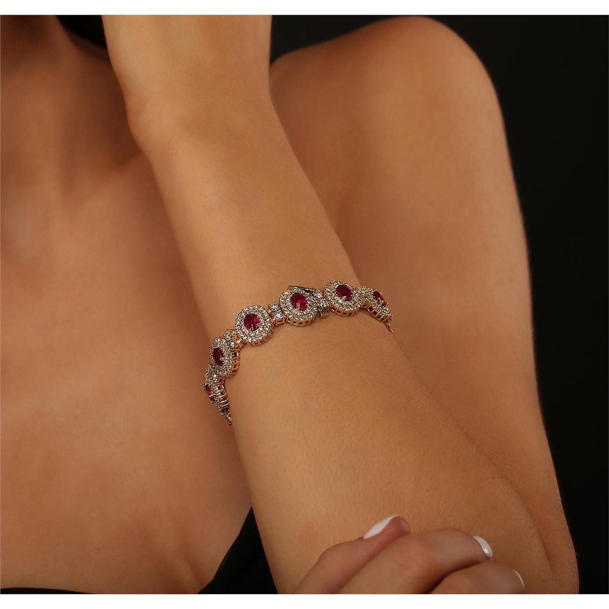 One electronically tested 14KT yellow gold ladies cast & assembled ruby and diamond bracelet with a bright polish finish. Condition is new, good workmanship. Seven inch length bracelet features a ribbon of ruby and diamond bezels, alternated by diamond duos, terminating in a concealed clasp with safety clasp. Identified with markings of "14K". Containing: Eleven prong set oval mixed cut natural rubies, measuring 7.00 x 5.00 x 3.25mm, 6%. bulge factor, approximate. Total Weight of 10.89ct., clarity is heavily included, type II, medium dark, moderately strong, slightly purplish red color, (GIA slpR 6/4), cut is good. Transmitting light somewhat diffusely, transparent to translucent. Naturally occurring internal & external characteristics are present. Indications of laboratory high temperature heat treatment, with glass & flux additives. Measurements & the color grade are an average for the group. Graded in the setting. Ruby has a low tolerance to rhodium plating, repolishing the surface, & ultrasonic cleaning. Twenty-Two prong set round brilliant cut diamonds, measuring 3.20 - 3.10 x 1.89mm (depth est.) approximate. Total Weight of 22 Stones = 2.61ct. Graded in the setting. Clarity: I-1 to I-3. Color: G - I Three Hundred Seventy-Four prong set round brilliant cut diamonds, measuring 1.80 - 1.60 x 1.02mm (depth est.) approximate. Total Weight of 374 Stones = 6.79ct. Faint brown and yellow secondary color throughout. Graded in the setting. Clarity: SI-2 to I-2. Color: J - M. Total Weight of Colored Stones 10.89ct. Total Weight of Diamonds 9.40ct. Total Weight of Bracelet 38.40 grams. AIG Appraised at $26,000.00.