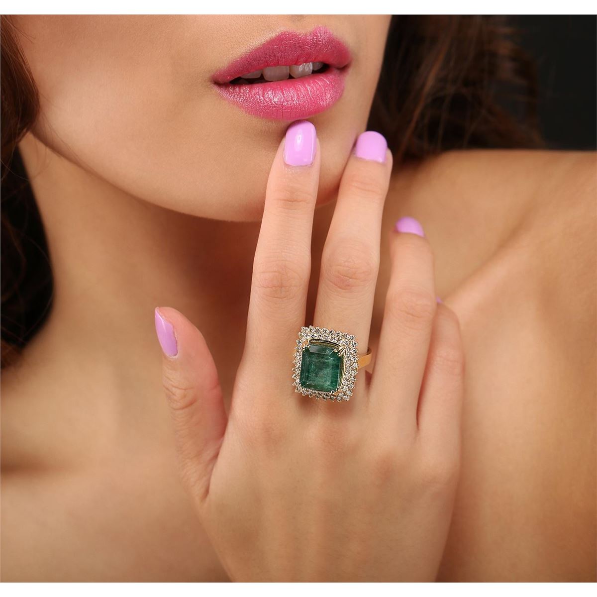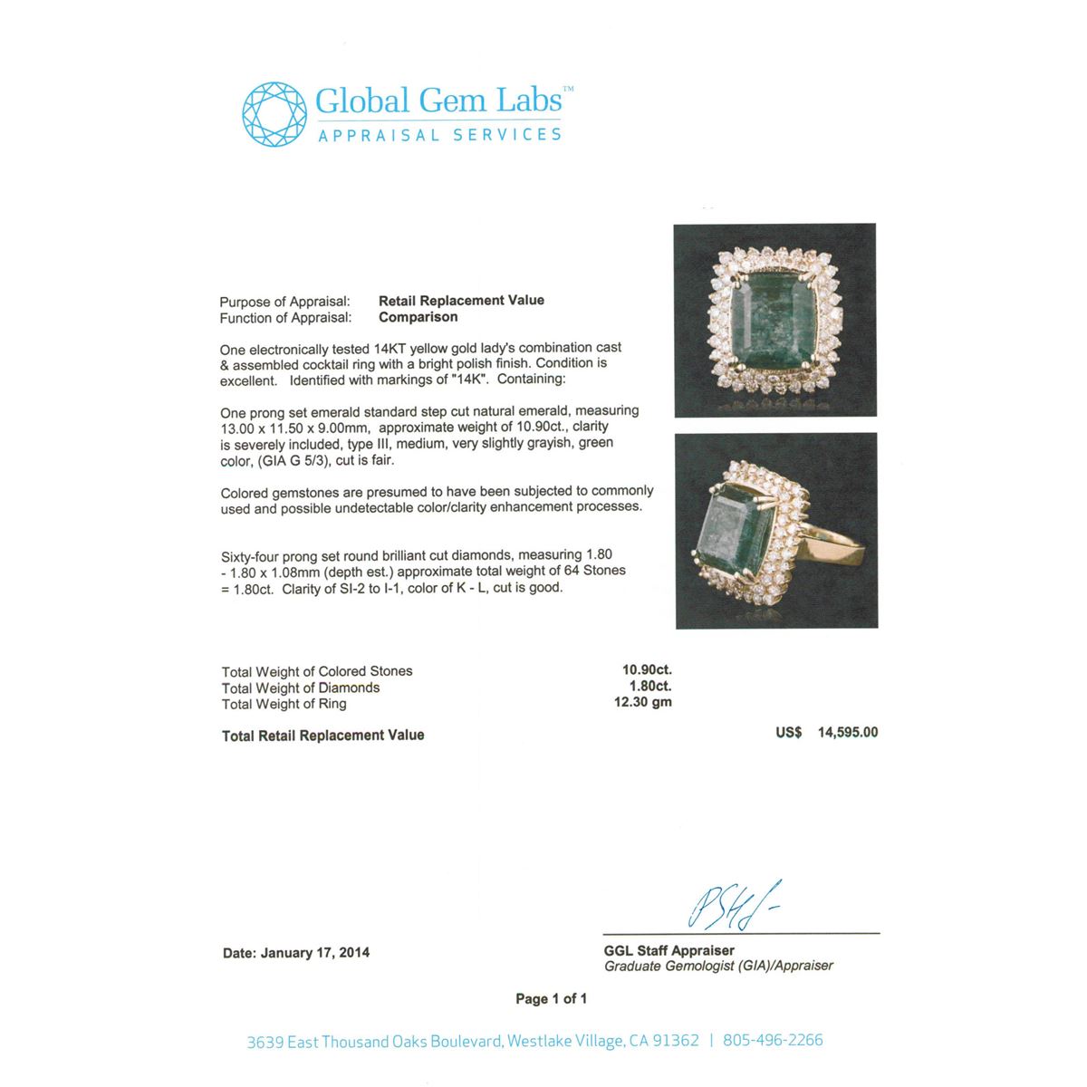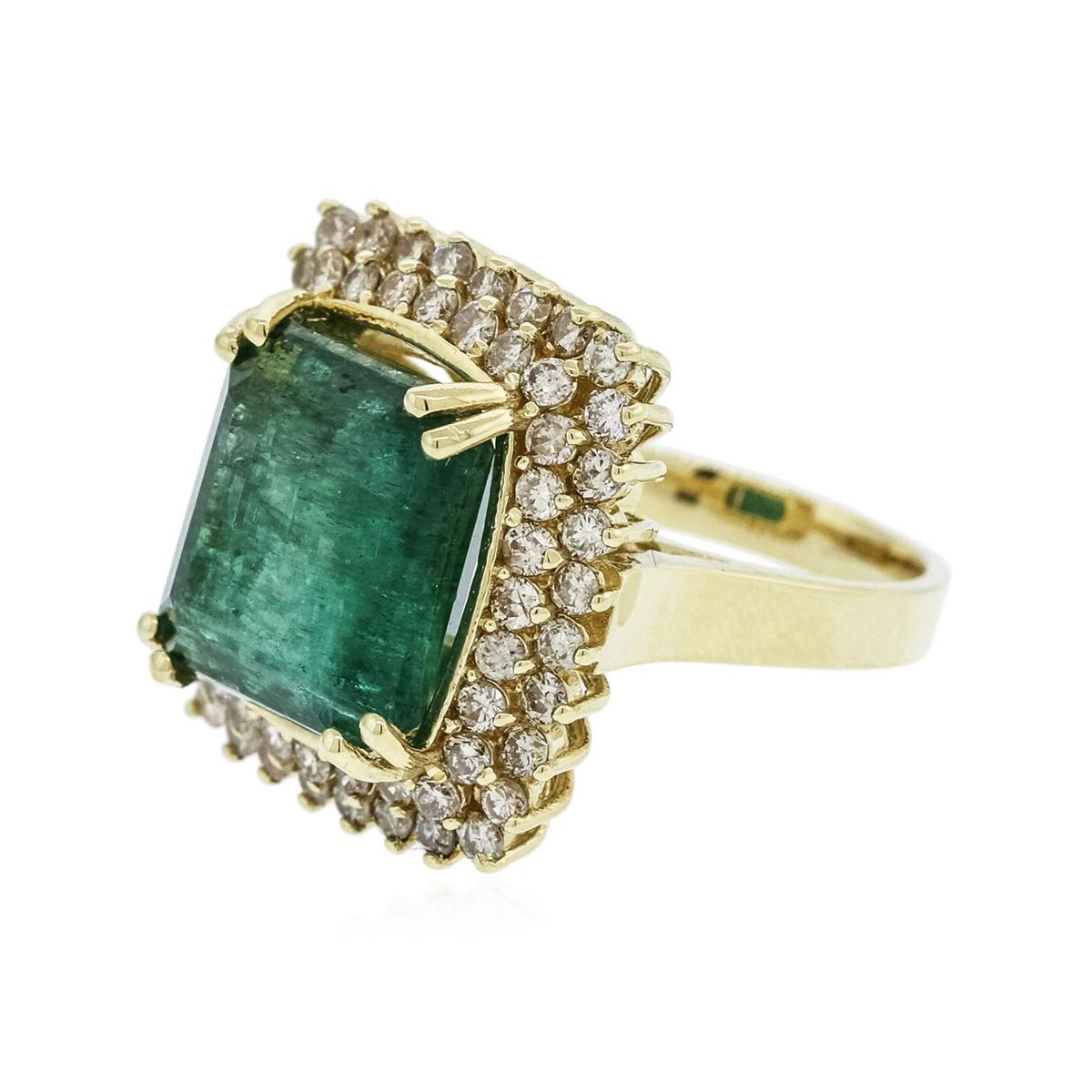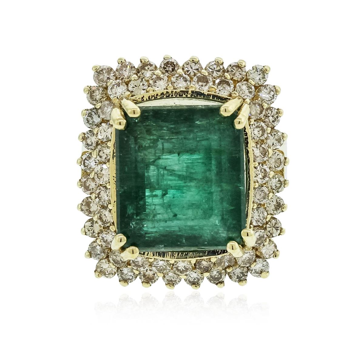 One electronically tested 14KT yellow gold Ladies combination cast & assembled cocktail ring with a bright polish finish. Identified with markings of "14K". Condition is excellent. Containing: One prong set emerald standard step cut natural emerald, measuring 13.00 x 11.50 x 9.00mm, approximate weight of 10.90ct., clarity is severely included, type III, medium, very slightly grayish, green color, (GIA G 5/3), cut is fair. Colored gemstones are presumed to have been subjected to commonly used and possible undetectable color/clarity enhancement processes. Sixty-Four prong set round brilliant cut diamonds, measuring 1.80 - 1.80 x 1.08mm (depth est.) approximate total weight of 64 Stones = 1.80ct. Clarity of SI-2 to I-1, Color of K - L, Cut is Good. Total Weight of Colored Stones 10.90ct. Total Weight of Diamonds 1.80ct. Total Weight of Ring 12.30gm. GGL Appraised at $14,595.00.