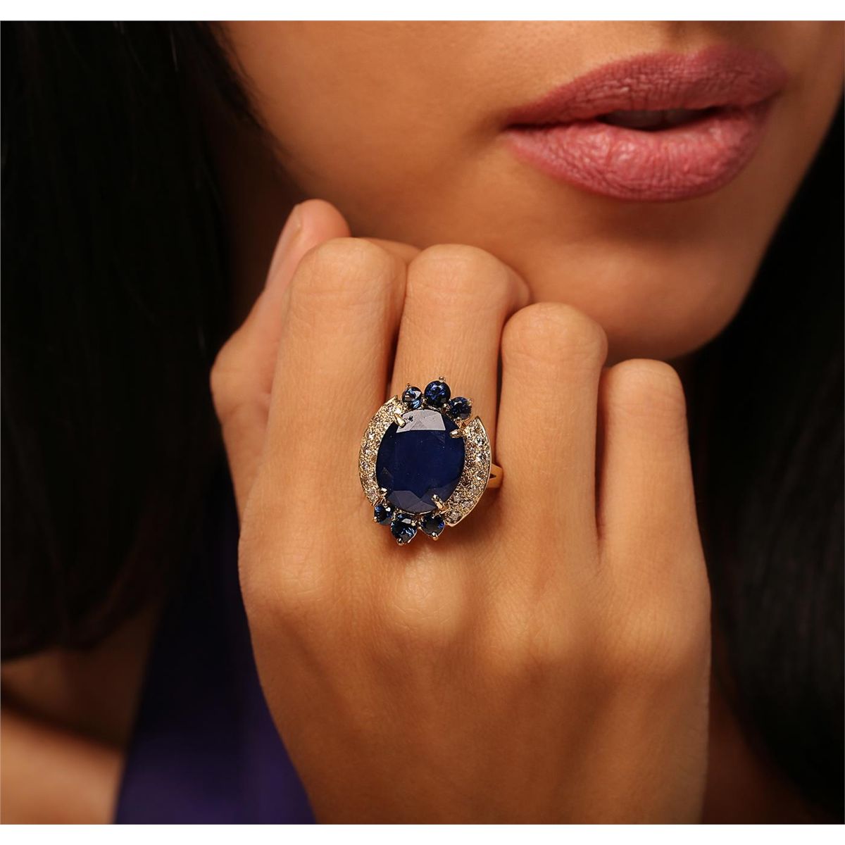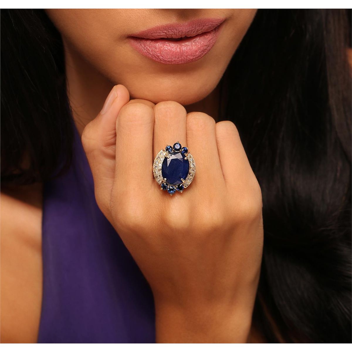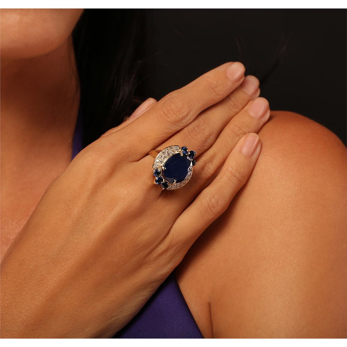 One electronically tested 14KT yellow gold Ladies combination cast & assembled ring with a bright polish finish. Condition is new. Identified with markings of "K14". Containing: One prong set oval modified brilliant cut natural blue sapphire, measuring 15.24 x 12.68 x 5.90mm, approximate weight of 9.20ct., clarity is heavily included, type II, medium dark, moderately strong, blue color, (GIA B 6/4), cut is good. Six prong set round modified brilliant cut natural blue sapphires, measuring 3.90 - 3.50 x 2.41 mm, approximate. Total Weight of 1.74ct., clarity is eye clean, type II, medium dark, moderately strong, blue color, (GIA B 6/4), cut is very good. Colored gemstones are presumed to have been subjected to commonly used color/clarity enhancement processes. Twenty-Two prong set round brilliant cut diamonds, measuring 1.80 - 1.80 x 1.08mm (depth est.) approximate. Total Weight of 22 Stones = 0.47ct. Clarity: I-1. Color: L - M, Cut is Good. Total Weight of Colored Stones 10.94ct. Total Weight of Diamonds 0.47ct. Total Weight of Ring 8.30 grams. GGL Appraised at $7,375.00.