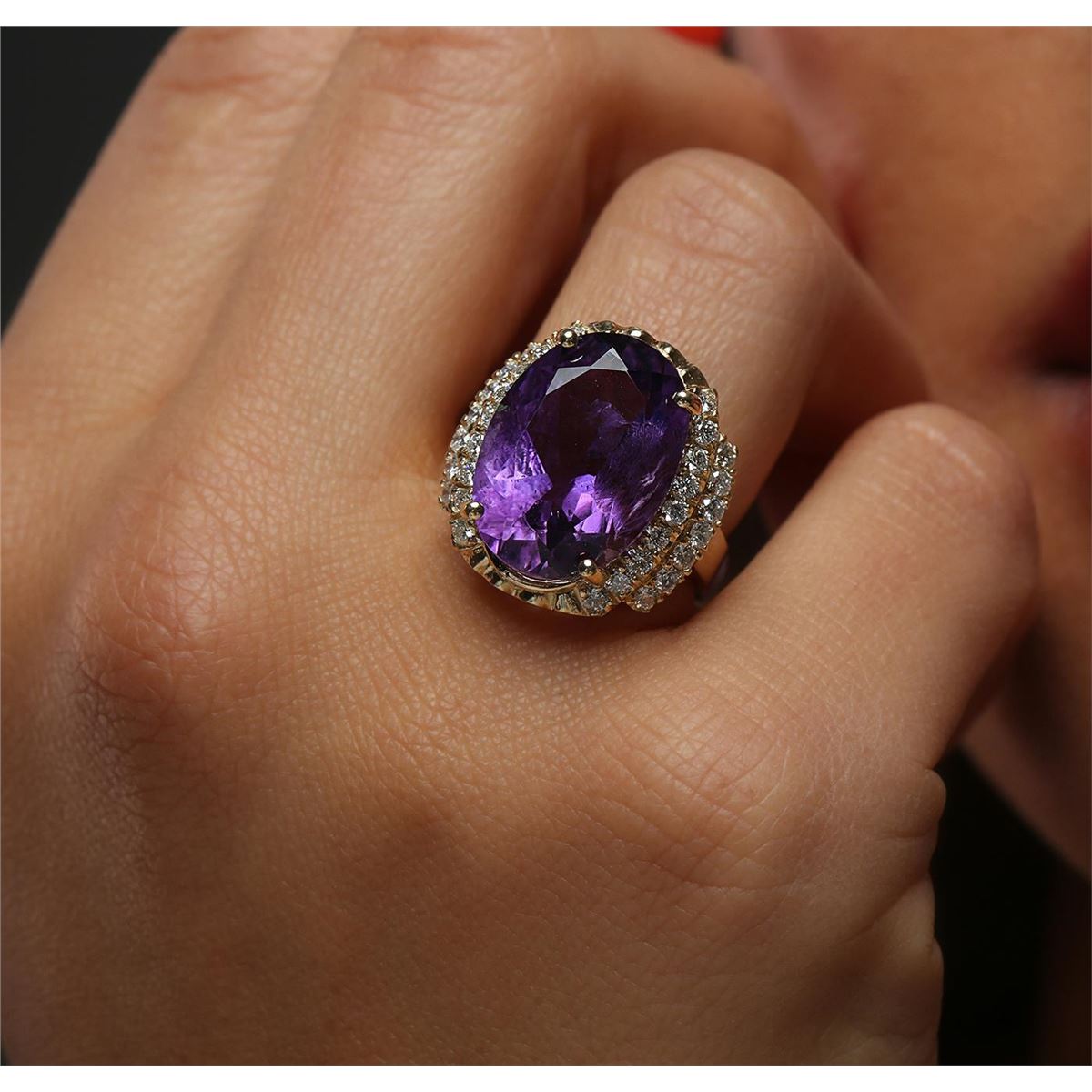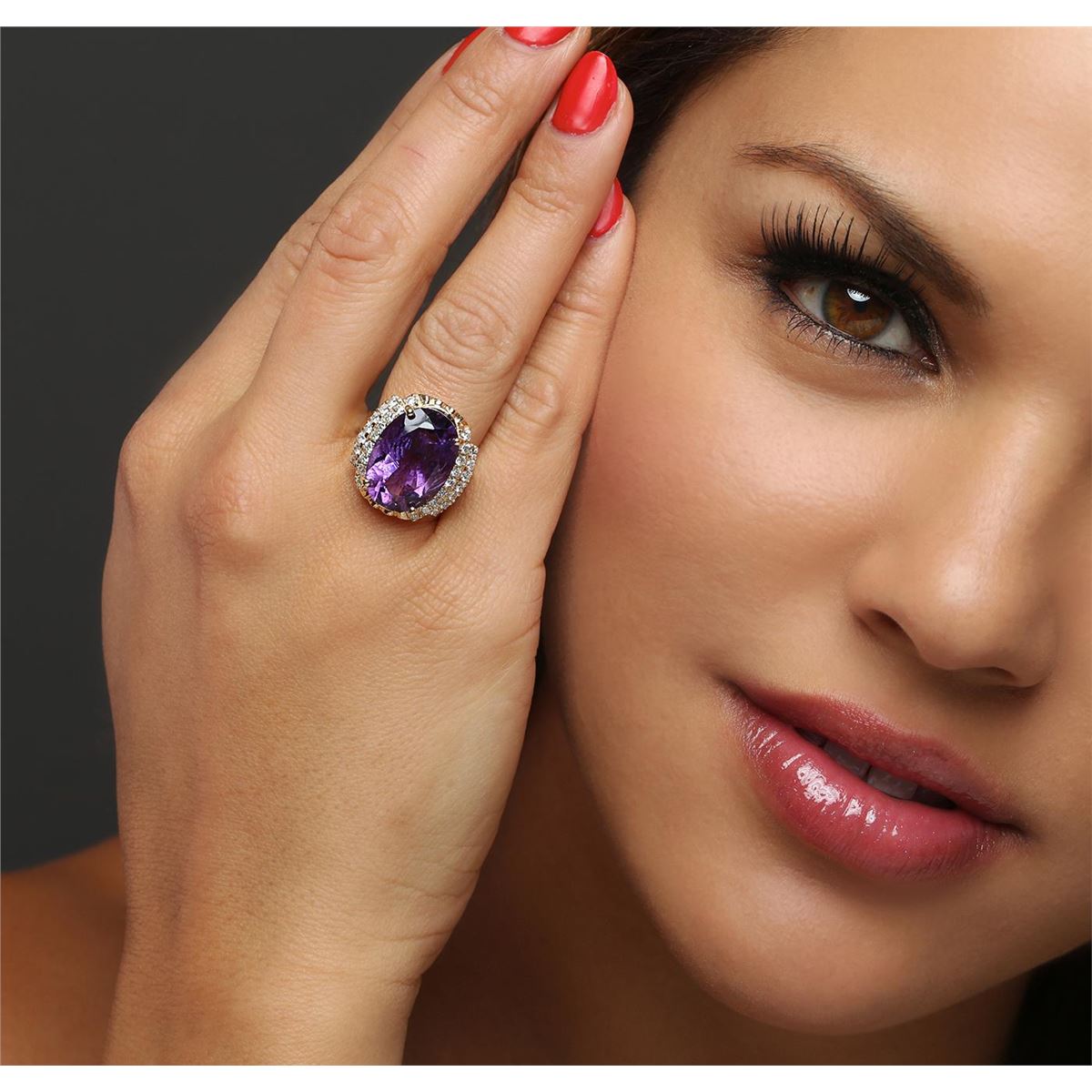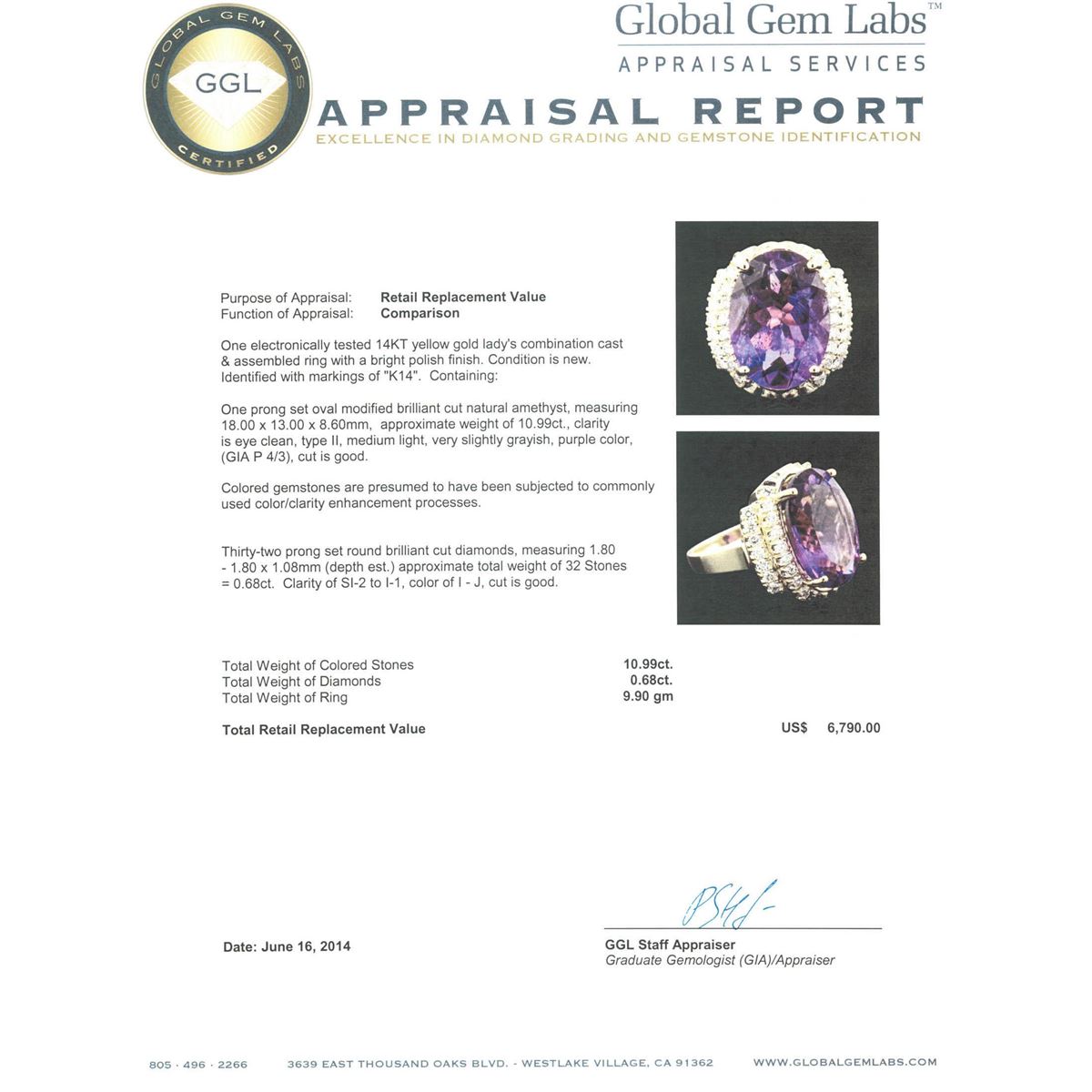 One electronically tested 14KT yellow gold Ladies combination cast & assembled ring with a bright polish finish. Condition is new. Identified with markings of "K14". Containing: One prong set oval modified brilliant cut natural amethyst, measuring 18.00 x 13.00 x 8.60mm, approximate weight of 10.99ct., clarity is eye clean, type II, medium light, very slightly grayish, purple color, (GIA P 4/3), cut is good. Colored gemstones are presumed to have been subjected to commonly used color/clarity enhancement processes. Thirty-Two prong set round brilliant cut diamonds, measuring 1.80 - 1.80 x 1.08mm (depth est.) approximate. Total Weight of 32 Stones = 0.68ct. Clarity: SI-2 to I-1. Color: I - J, Cut is Good. Total Weight of Colored Stones 10.99ct. Total Weight of Diamonds 0.68ct. Total Weight of Ring 9.90 grams. GGL Appraised at $6,790.00.