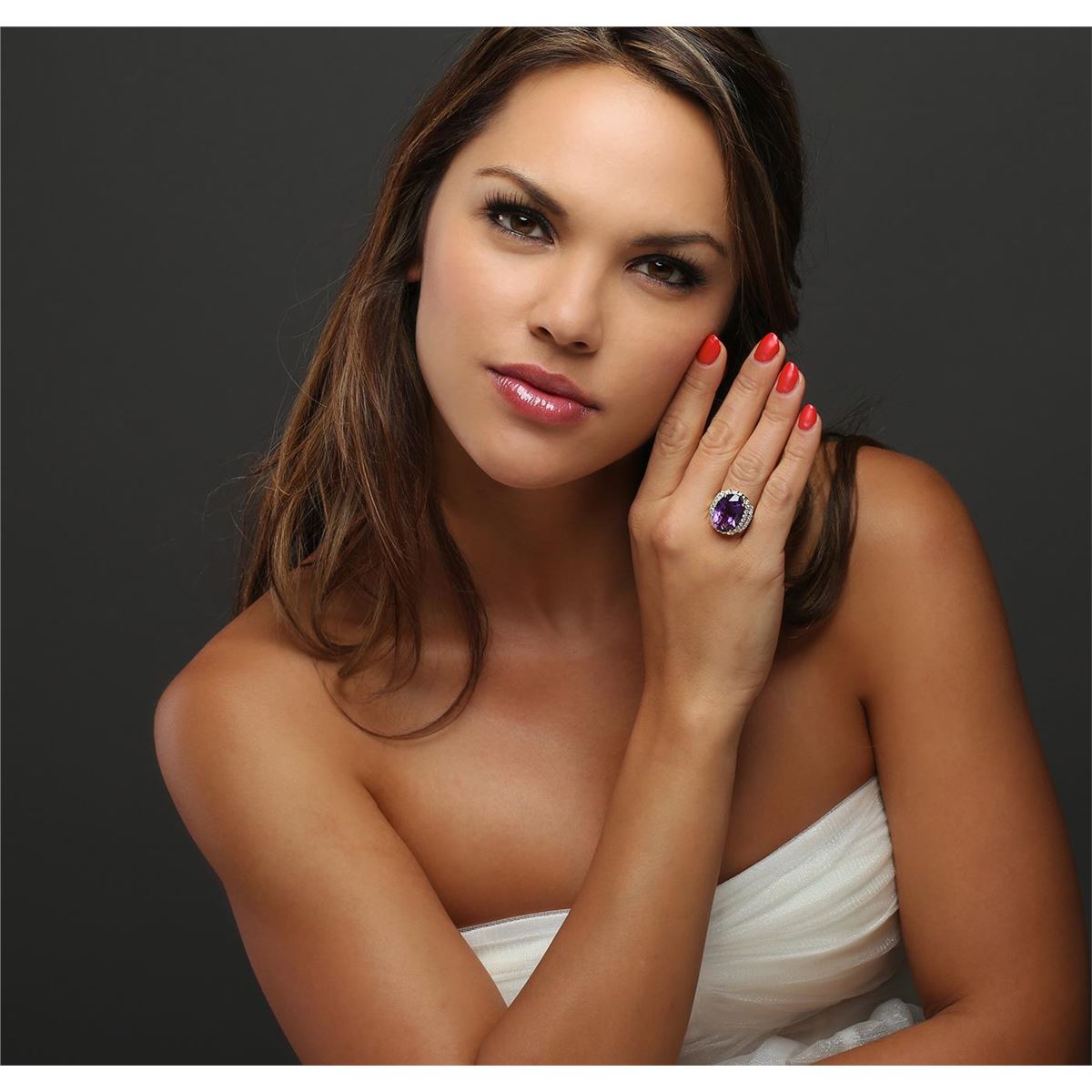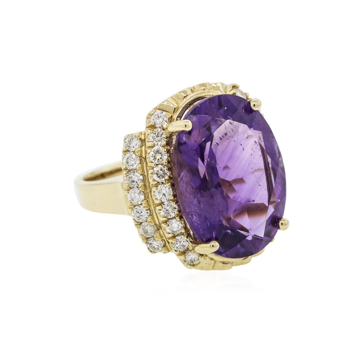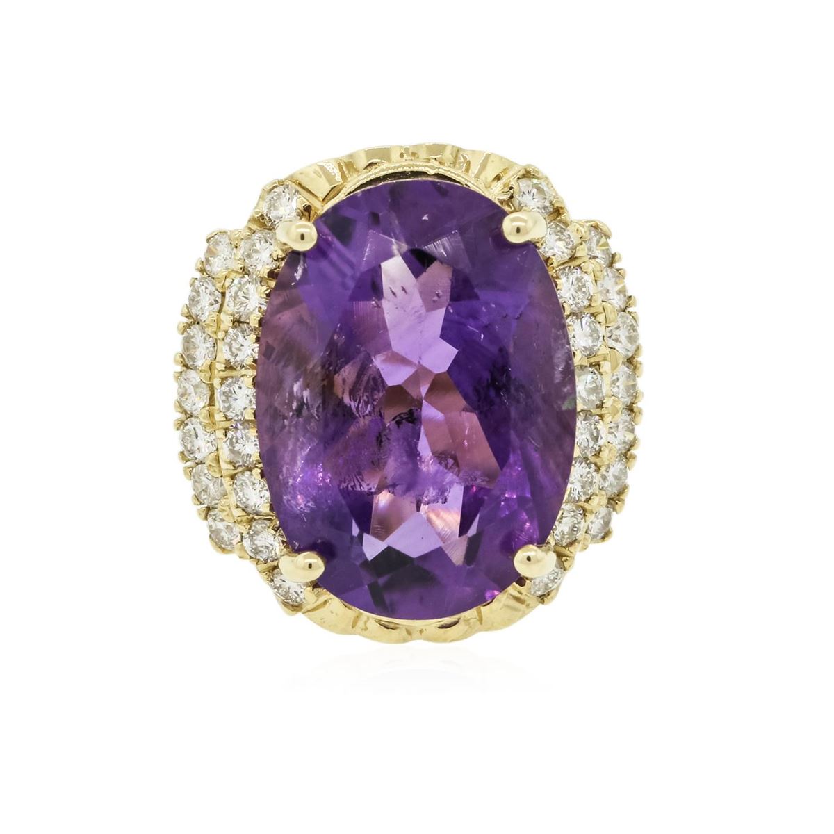 One electronically tested 14KT yellow gold Ladies combination cast & assembled ring with a bright polish finish. Condition is new. Identified with markings of "K14". Containing: One prong set oval modified brilliant cut natural amethyst, measuring 18.00 x 13.00 x 8.60mm, approximate weight of 10.99ct., clarity is eye clean, type II, medium light, very slightly grayish, purple color, (GIA P 4/3), cut is good. Colored gemstones are presumed to have been subjected to commonly used color/clarity enhancement processes. Thirty-Two prong set round brilliant cut diamonds, measuring 1.80 - 1.80 x 1.08mm (depth est.) approximate. Total Weight of 32 Stones = 0.68ct. Clarity: SI-2 to I-1. Color: I - J, Cut is Good. Total Weight of Colored Stones 10.99ct. Total Weight of Diamonds 0.68ct. Total Weight of Ring 9.90 grams. GGL Appraised at $6,790.00.