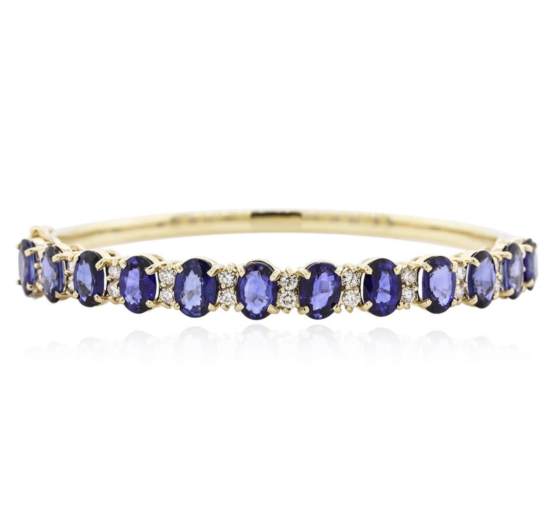 One electronically tested 14KT yellow gold ladies cast sapphire and diamond bangle bracelet with a hidden box clasp with safety closer with a bright polish finish. Identified with markings of "14K". Condition is new. Containing: Twelve prong set oval modified brilliant cut natural blue sapphires, measuring 7.00. x 5.50 x 3.58mm, approximate total weight of 11.10ct., clarity is eye clean, type II, medium light, moderately strong, blue color, (GIA B 4/4), cut is good. Twenty-Six prong set round brilliant cut diamonds, measuring 2.00. - 2.00. x 1.20mm (depth est.) approximate total weight of 26 Stones = 0.87ct. Clarity: SI-1. Color: I - J, Cut is Good. Colored gemstones are presumed to have been subjected to commonly used enhancement processes. All diamonds and colored gemstones are graded in the mounting, unless otherwise stated. Total Weight of Colored Stones 11.10ct. Total Weight of Diamonds 0.87ct. Total Weight of Bangle Bracelet 20.40 grams. GGL Appraised at $6,160.00.