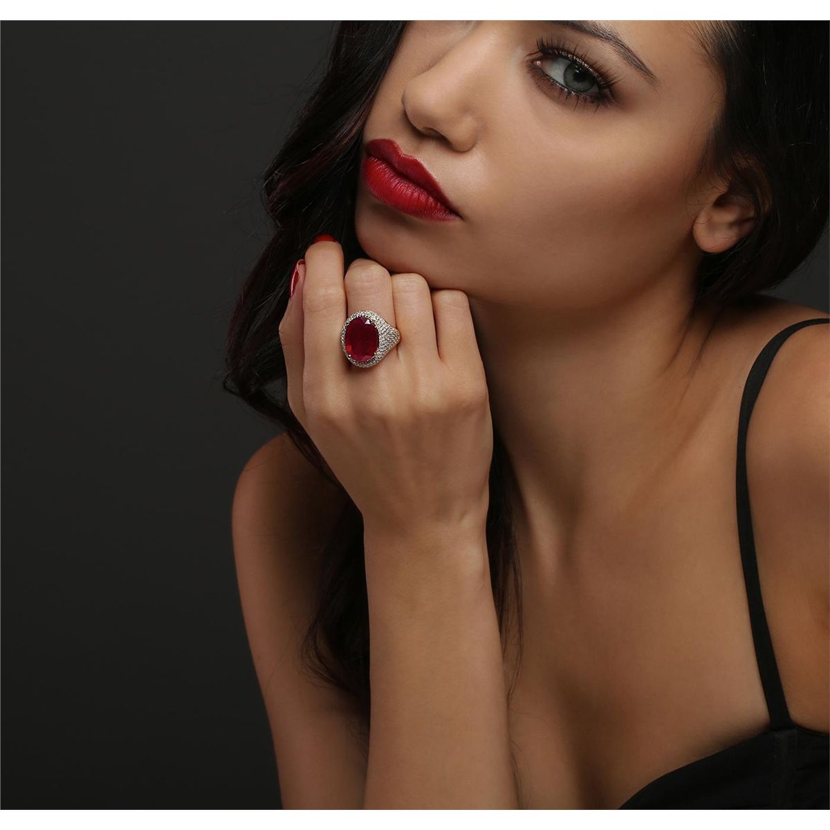 One electronically tested 14KT yellow gold ladies cast ruby and diamond ring with a bright polish finish. The featured ruby is set within an elaborate diamond set curvature, completed by a three and one-half millimeter wide band. Trademark is Orianne. Identified with markings of "14K". Condition is new, good workmanship. Containing: One prong set oval mixed cut natural ruby, measuring 16.80 x 12.80 x 5.80mm, 10% bulge factor, approximate weight of 11.18ct., clarity is heavily included, type II, medium dark, very slightly brownish, slightly purplish red color, (GIA slpR 6/3), cut is good. Transmitting light somewhat diffusely, transparent to translucent. Naturally occurring internal & external characteristics are present. Indications of laboratory high temperature heat treatment, with glass & flux additives. Graded in the setting. Ruby has a low tolerance to rhodium plating, repolishing the surface, & ultrasonic cleaning. Two Hundred Thirty-Five prong set round brilliant cut diamonds, measuring 1.40 - 1.30 x 0.81mm (depth est.) approximate total weight of 235 Stones = 2.21ct. Graded in the setting. Clarity: I-2 to I-3. Color: H - I. Total Weight of Colored Stones 11.18ct. Total Weight of Diamonds 2.21ct. Total Weight of Ring 9.47 grams. AIG Appraised at $8,035.00.