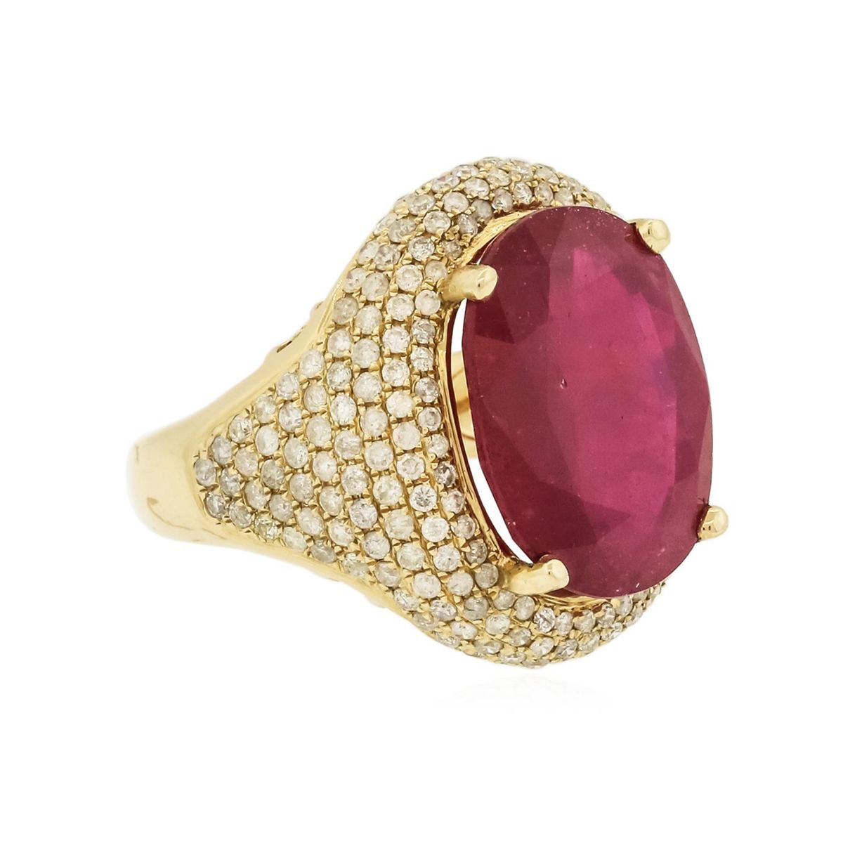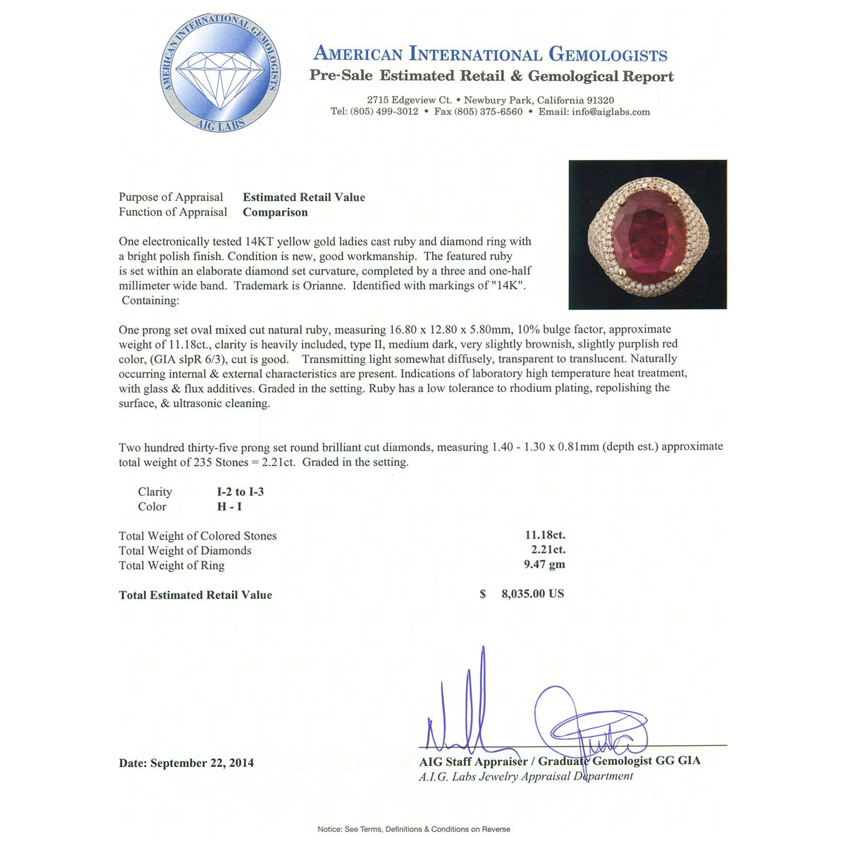 One electronically tested 14KT yellow gold ladies cast ruby and diamond ring with a bright polish finish. The featured ruby is set within an elaborate diamond set curvature, completed by a three and one-half millimeter wide band. Trademark is Orianne. Identified with markings of "14K". Condition is new, good workmanship. Containing: One prong set oval mixed cut natural ruby, measuring 16.80 x 12.80 x 5.80mm, 10% bulge factor, approximate weight of 11.18ct., clarity is heavily included, type II, medium dark, very slightly brownish, slightly purplish red color, (GIA slpR 6/3), cut is good. Transmitting light somewhat diffusely, transparent to translucent. Naturally occurring internal & external characteristics are present. Indications of laboratory high temperature heat treatment, with glass & flux additives. Graded in the setting. Ruby has a low tolerance to rhodium plating, repolishing the surface, & ultrasonic cleaning. Two Hundred Thirty-Five prong set round brilliant cut diamonds, measuring 1.40 - 1.30 x 0.81mm (depth est.) approximate total weight of 235 Stones = 2.21ct. Graded in the setting. Clarity: I-2 to I-3. Color: H - I. Total Weight of Colored Stones 11.18ct. Total Weight of Diamonds 2.21ct. Total Weight of Ring 9.47 grams. AIG Appraised at $8,035.00.