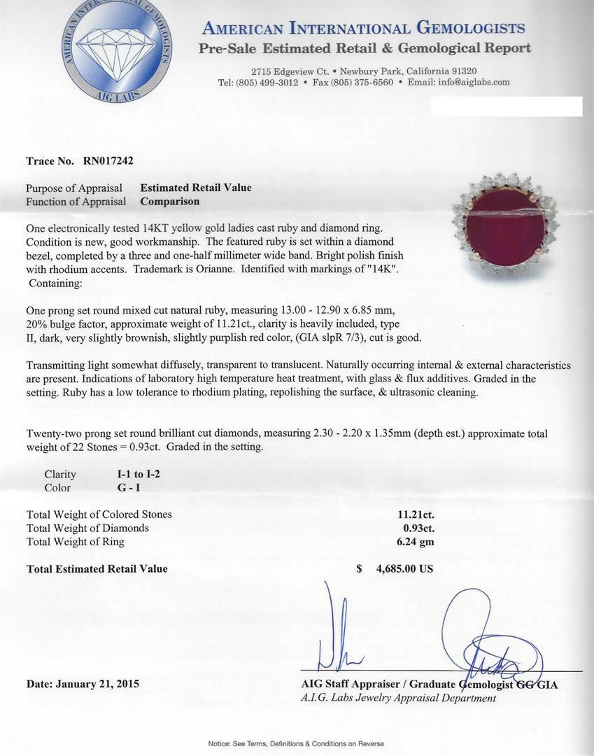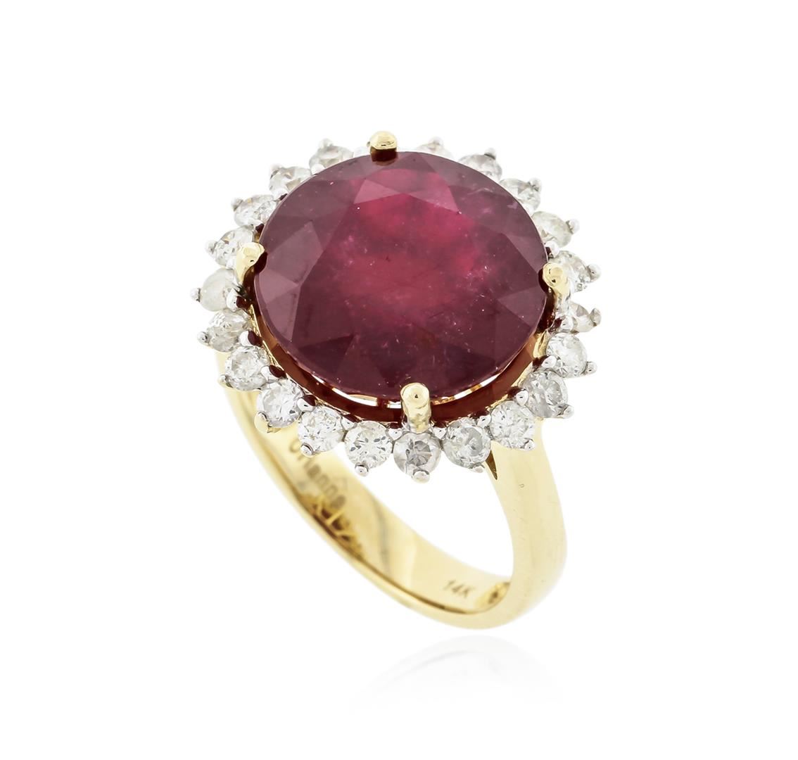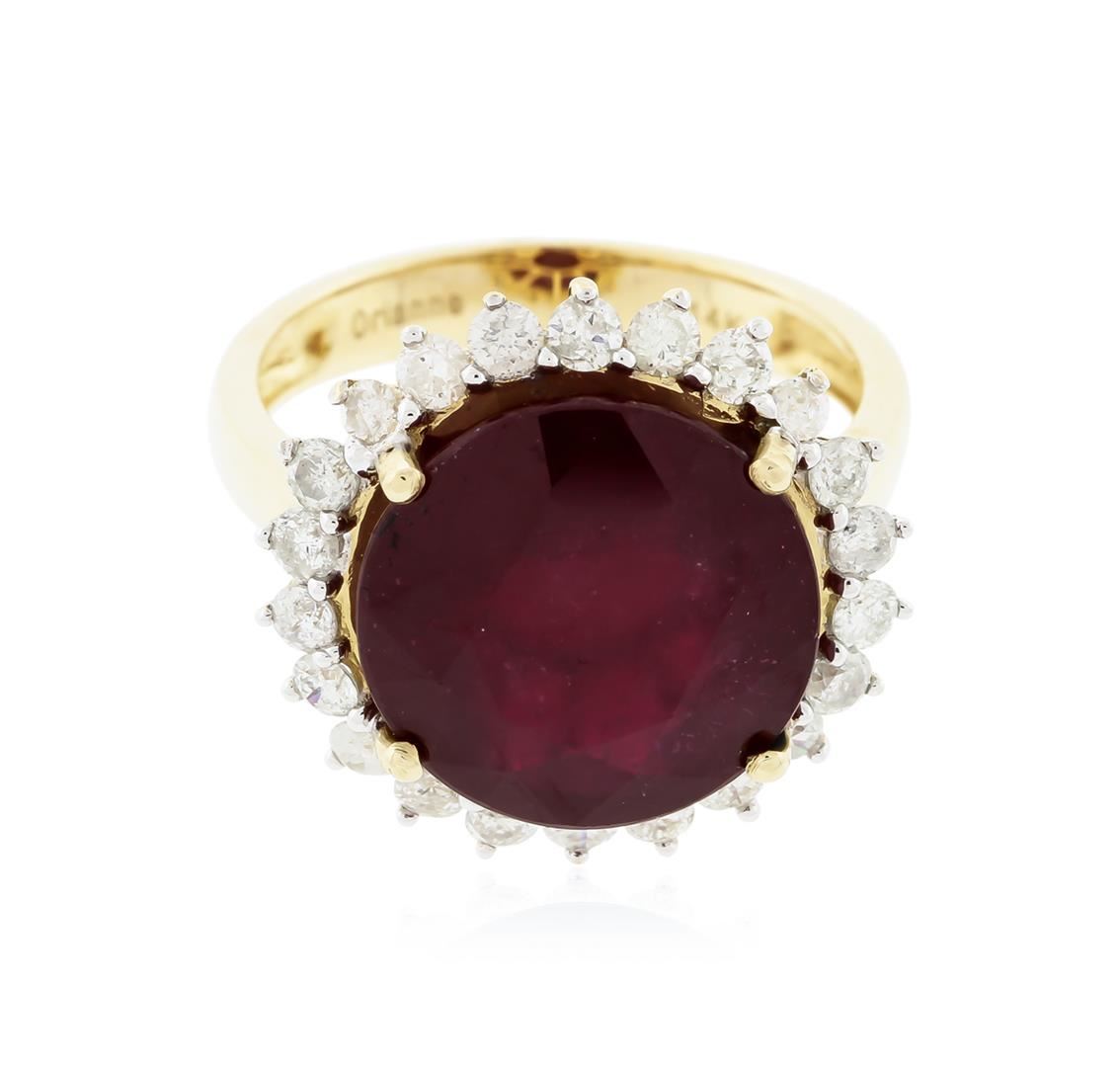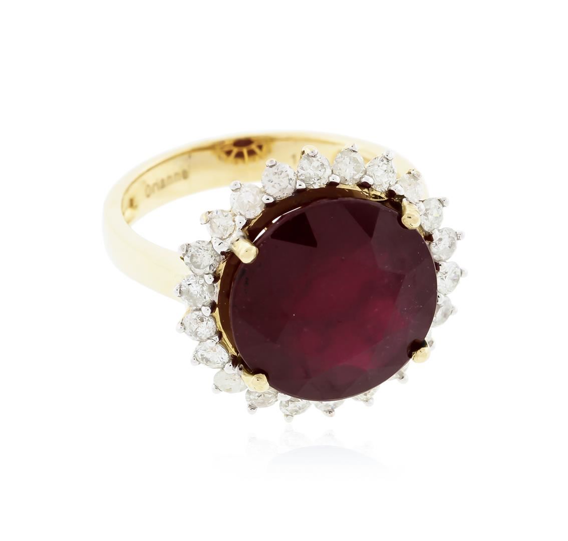 One electronically tested 14KT yellow gold ladies cast ruby and diamond ring. The featured ruby is set within a diamond bezel, completed by a three and one-half millimeter wide band. Bright polish finish with rhodium accents. Trademark is Orianne. Identified with markings of "14K". Condition is new, good workmanship. Containing: One prong set round mixed cut natural ruby, measuring 13.00 - 12.90 x 6.85 mm, 20%. bulge factor, approximate weight of 11.21ct., clarity is heavily included, type II, dark, very slightly brownish, slightly purplish red color, (GIA slpR 7/3), cut is good. Transmitting light somewhat diffusely, transparent to translucent. Naturally occurring internal & external characteristics are present. Indications of laboratory high temperature heat treatment, with glass & flux additives. Graded in the setting. Ruby has a low tolerance to rhodium plating, repolishing the surface, & ultrasonic cleaning. Twenty-Two prong set round brilliant cut diamonds, measuring 2.30 - 2.20 x 1.35mm (depth est.) approximate total weight of 22 Stones = 0.93ct. Graded in the setting. Clarity: I-1 to I-2. Color: G - I. Total Weight of Colored Stones 11.21ct. Total Weight of Diamonds 0.93ct. Total Weight of Ring 6.24 grams. AIG Appraised at $4,685.00.