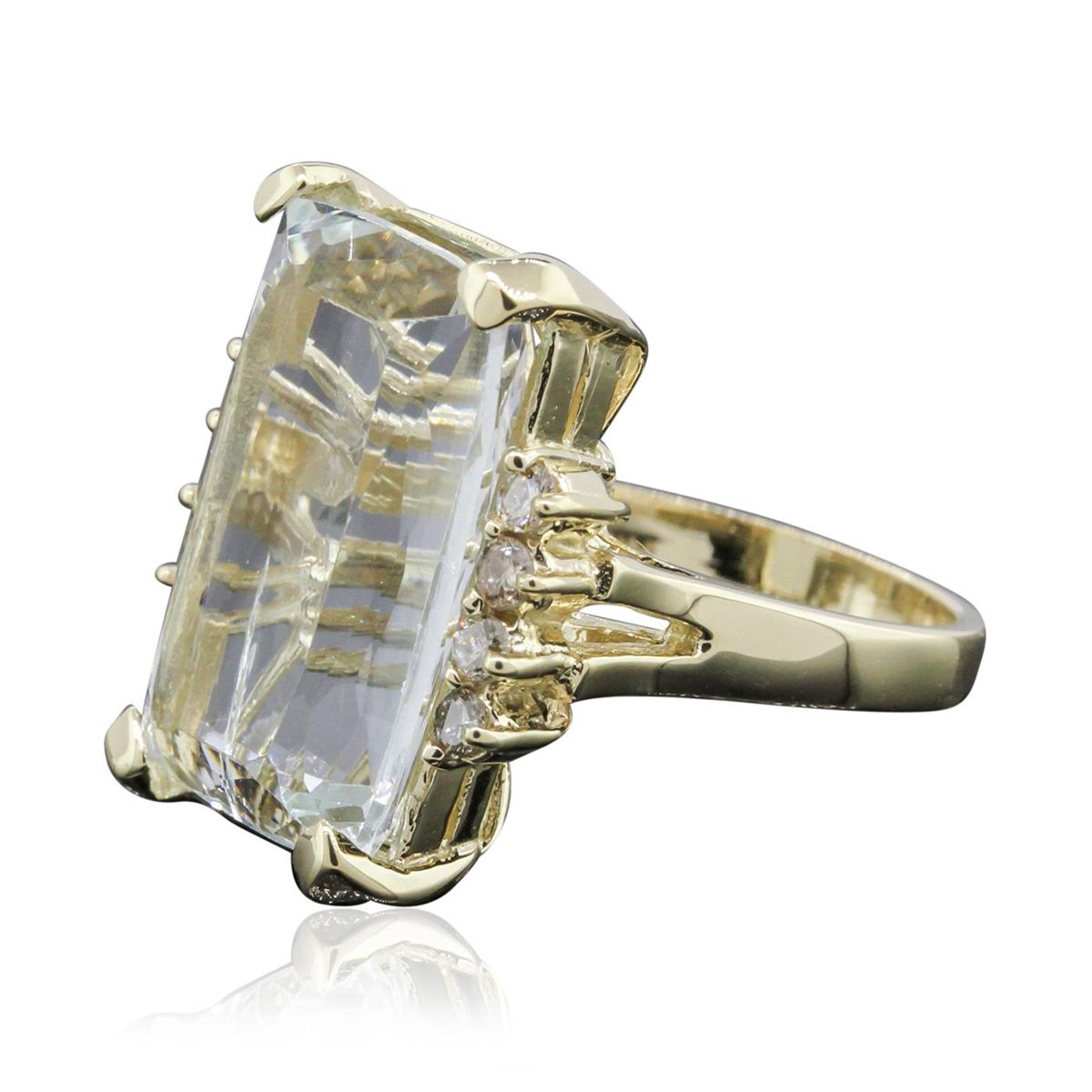 One electronically tested 14KT yellow gold ladies cast aquamarine and diamond ring with a bright polish finish. Condition is new, good workmanship. The featured aquamarine is supported by diamond accented shoulders, completed by a two and one-half millimeter wide band. Identified with markings of "14K". Containing: One prong set rectangular cushion mixed cut natural aquamarine, measuring 18.80 x 12.00 x 7.10mm, 10% bulge factor, approximate weight of 11.26ct, clarity is slightly included, type I, medium light, very slightly grayish, very slightly greenish blue color (GIA vslgB 4/3) cut is good. Transmitting light with a minimum of distortion, transparent. Naturally ocurring internal and external characteristics are present. Colored Stone Grading Report attached. Graded in the setting. Eight prong set round brilliant cut diamonds, measuring 2.20 - 2.10 x 1.29mm (depth est) approximate total weight of 8 stones = 0.39ct. Graded in the setting. Clarity SI-2 to I-1. Color H-J. Total weight of colored stones 11.26ct. Total weight of diamonds 0.39ct. Total weight of ring 9.41 grams. AIG Appraised at $7,095.00.