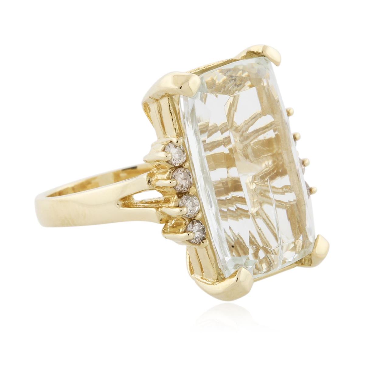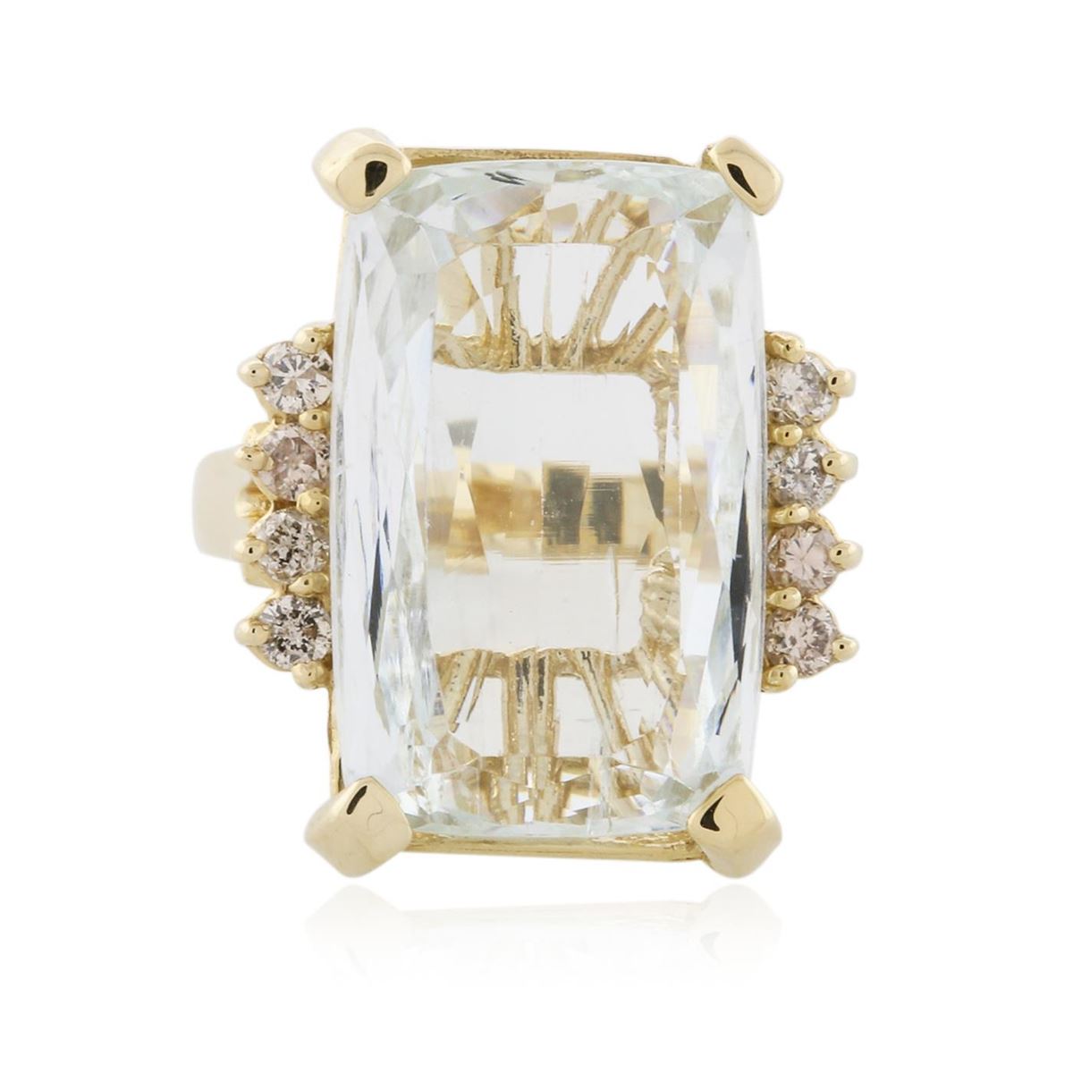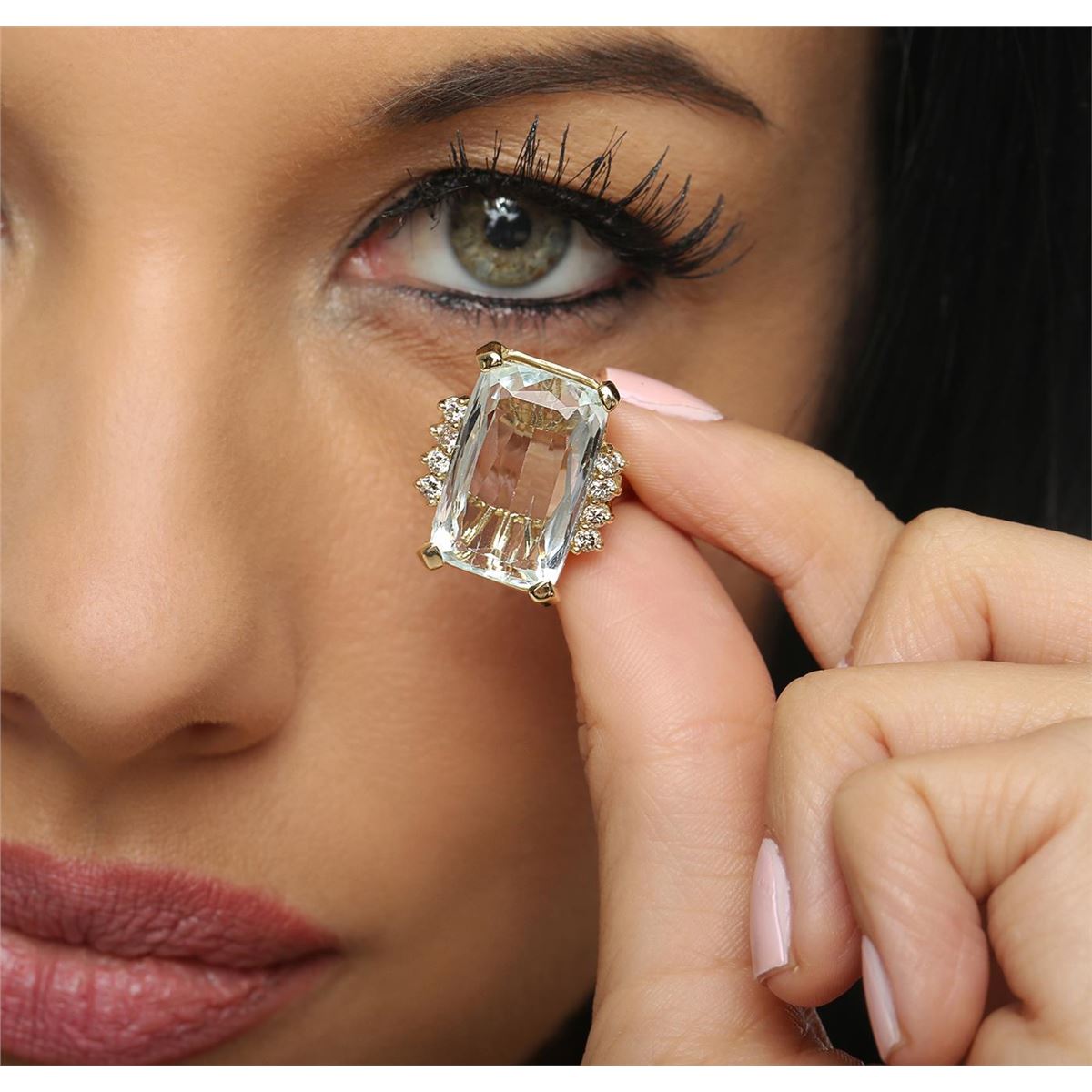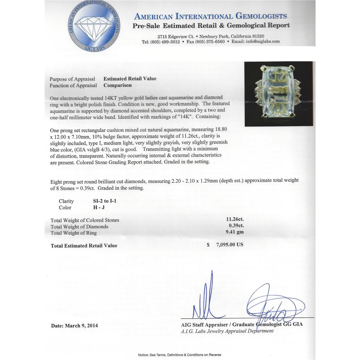 One electronically tested 14KT yellow gold ladies cast aquamarine and diamond ring with a bright polish finish. Condition is new, good workmanship. The featured aquamarine is supported by diamond accented shoulders, completed by a two and one-half millimeter wide band. Identified with markings of "14K". Containing: One prong set rectangular cushion mixed cut natural aquamarine, measuring 18.80 x 12.00 x 7.10mm, 10% bulge factor, approximate weight of 11.26ct, clarity is slightly included, type I, medium light, very slightly grayish, very slightly greenish blue color (GIA vslgB 4/3) cut is good. Transmitting light with a minimum of distortion, transparent. Naturally ocurring internal and external characteristics are present. Colored Stone Grading Report attached. Graded in the setting. Eight prong set round brilliant cut diamonds, measuring 2.20 - 2.10 x 1.29mm (depth est) approximate total weight of 8 stones = 0.39ct. Graded in the setting. Clarity SI-2 to I-1. Color H-J. Total weight of colored stones 11.26ct. Total weight of diamonds 0.39ct. Total weight of ring 9.41 grams. AIG Appraised at $7,095.00.