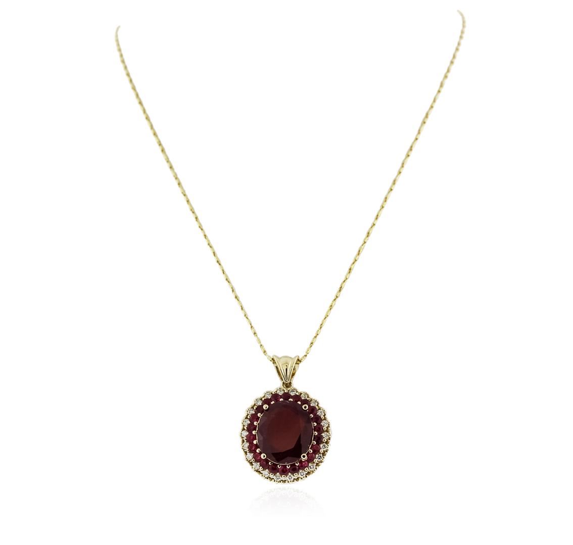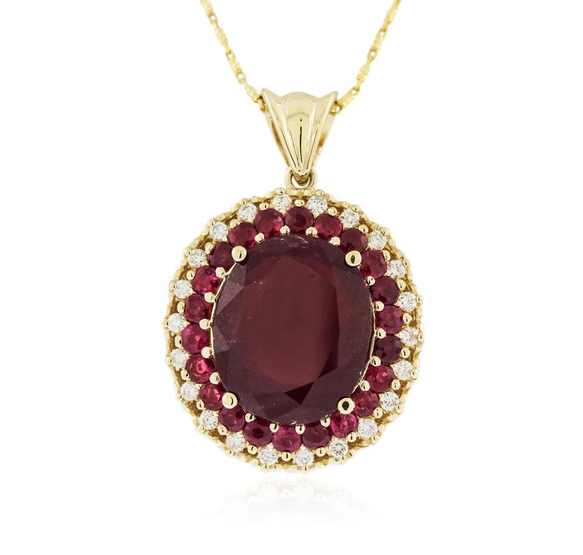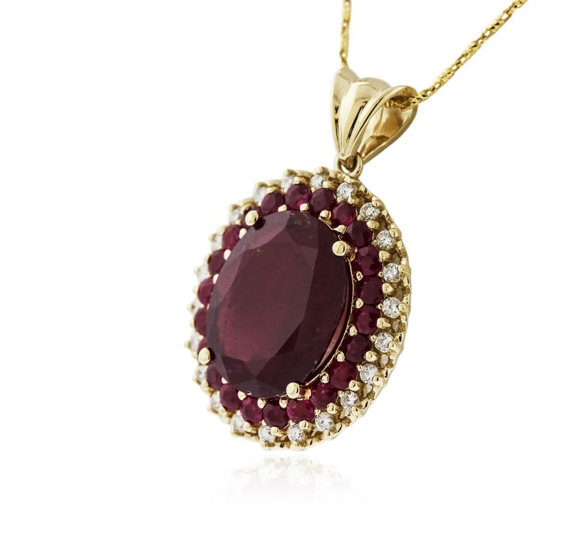 One electronically tested 14KT yellow gold ladies cast ruby and diamond pendant & chain 18.0" long, with a lobster claw clasp with a bright polish finish. Identified with markings of "14K". Condition is new. Containing: One prong set oval modified brilliant cut natural ruby, measuring 16.17 x 13.29 x 5.22mm, approximate weight of 9.54ct., clarity is heavily included, medium, moderately strong, strongly purplish red color, (GIA stpR 5/4), cut is good. Twenty-two prong set round modified brilliant cut natural rubies, measuring 2.50 - 2.50 x 1.63 mm, approximate total weight of 1.76ct., clarity is moderately included, type II, medium, moderately strong, red color, (GIA R 5/4), cut is good. Twenty-Two prong set round brilliant cut diamonds, measuring 1.50 - 1.50 x 0.90mm (depth est.) approximate total weight of 22 Stones = 0.27ct. Clarity: SI-2 to I-2. Color: J - K, Cut is Good. Colored gemstones are presumed to have been subjected to commonly used enhancement processes. All diamonds and colored gemstones are graded in the mounting, unless otherwise stated. Total Weight of Colored Stones 11.30ct. Total Weight of Diamonds 0.27ct. Total Weight of Pendant & Chain 12.10 grams. GGL Appraised at $5,515.00.