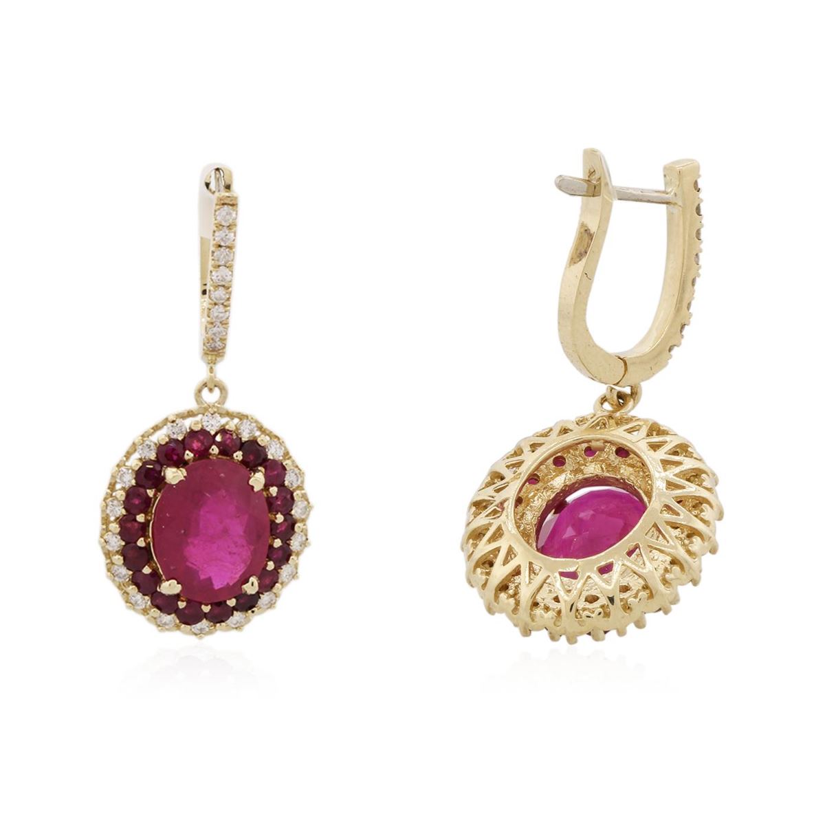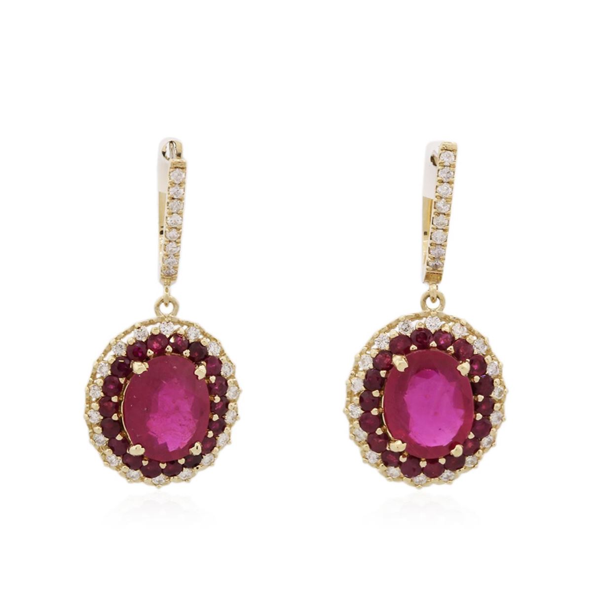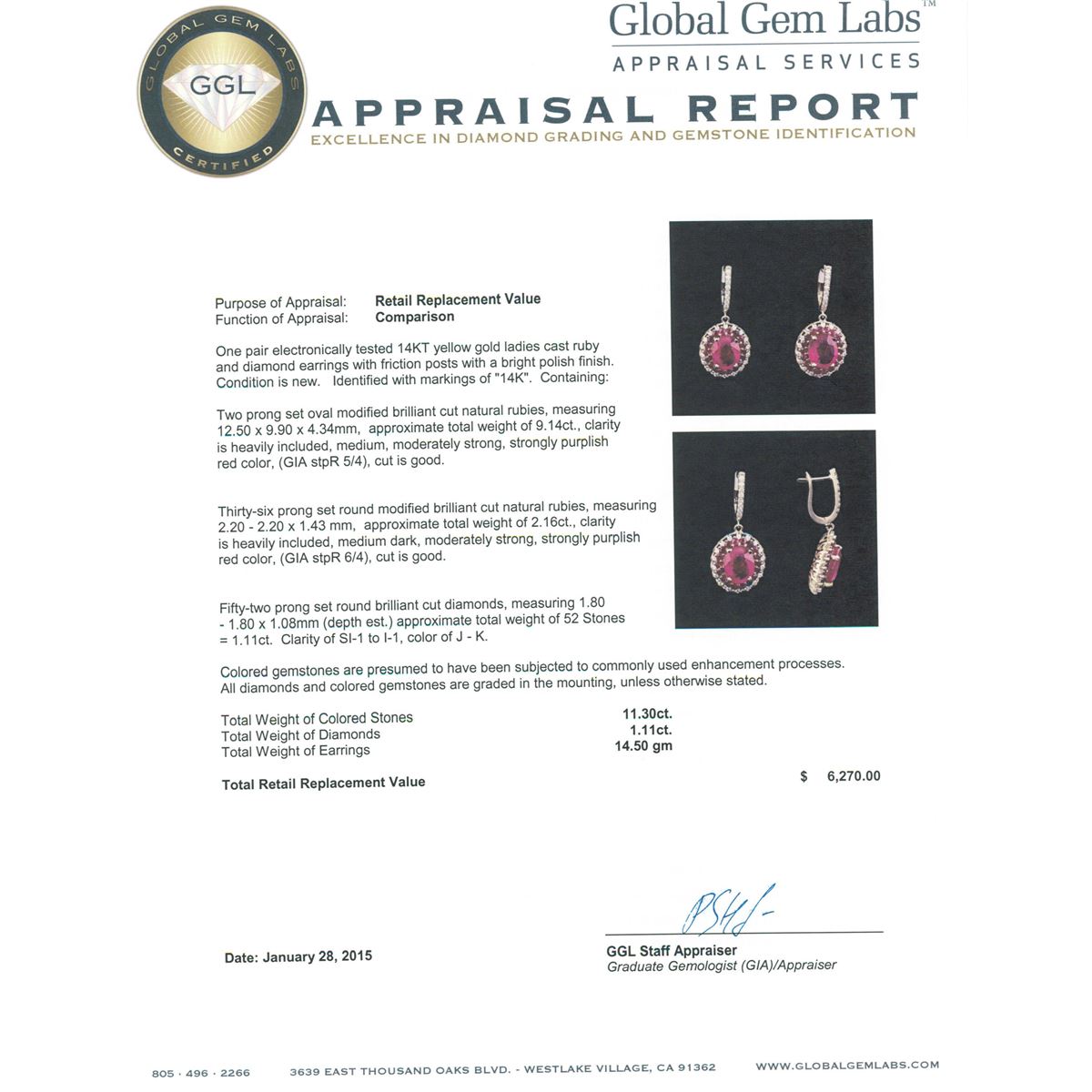 One pair electronically tested 14KT yellow gold ladies cast ruby and diamond earrings with friction posts with a bright polish finish. Identified with markings of "14K". Condition is new. Containing: Two prong set oval modified brilliant cut natural rubie GGL Appraised at $6,270.00.
