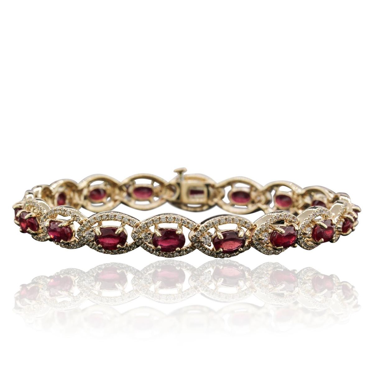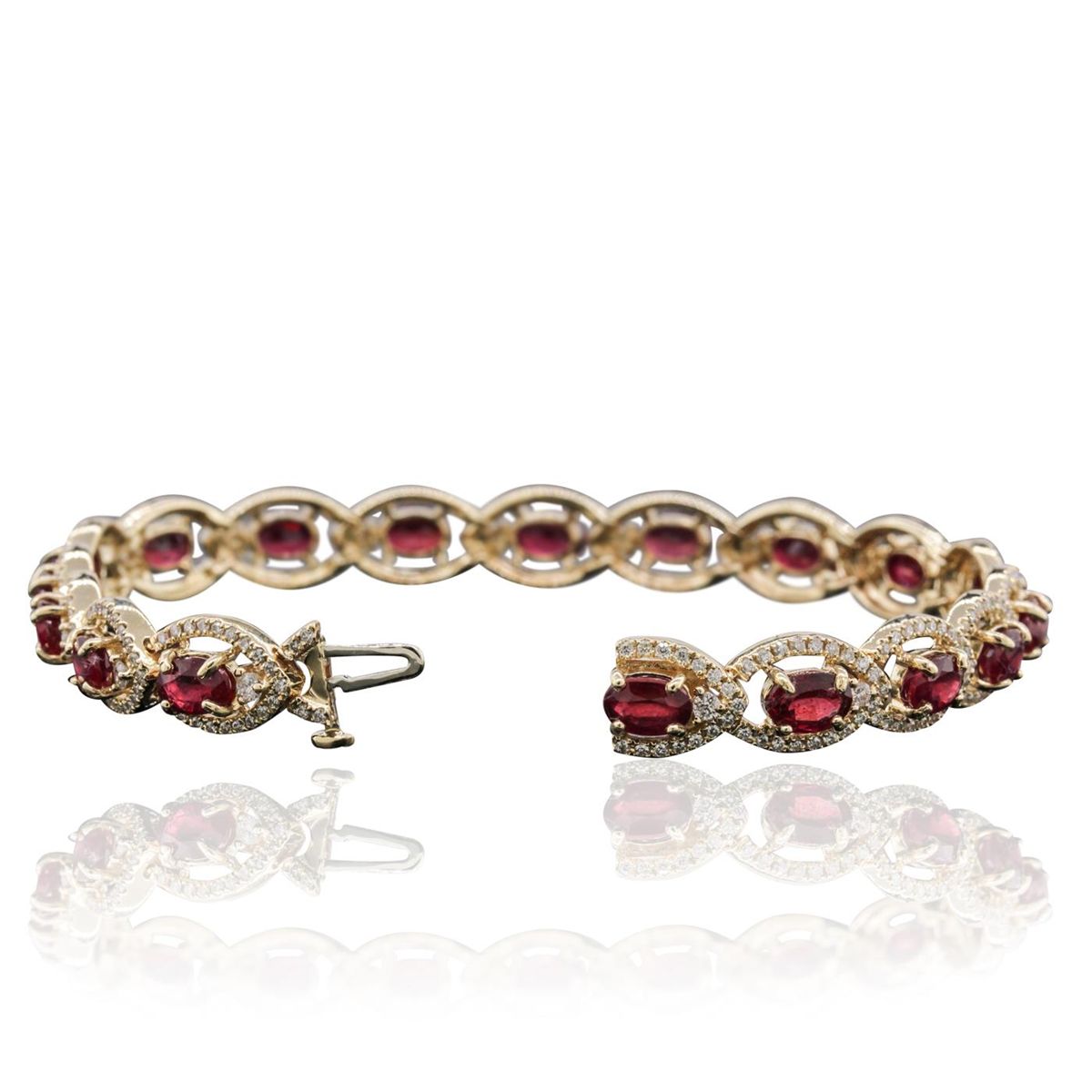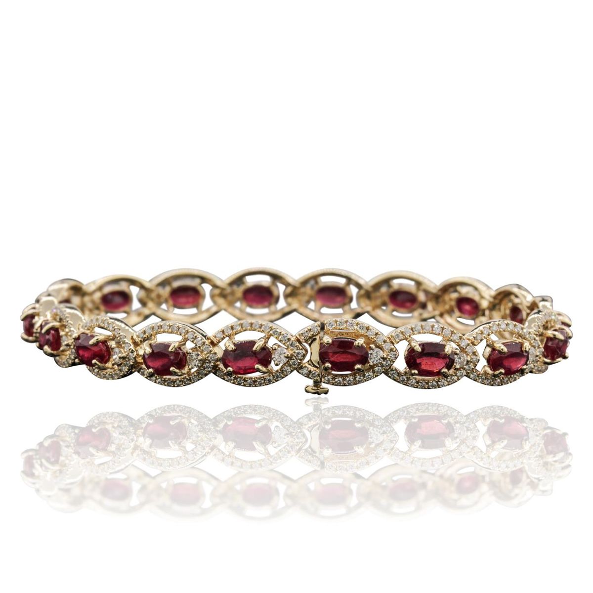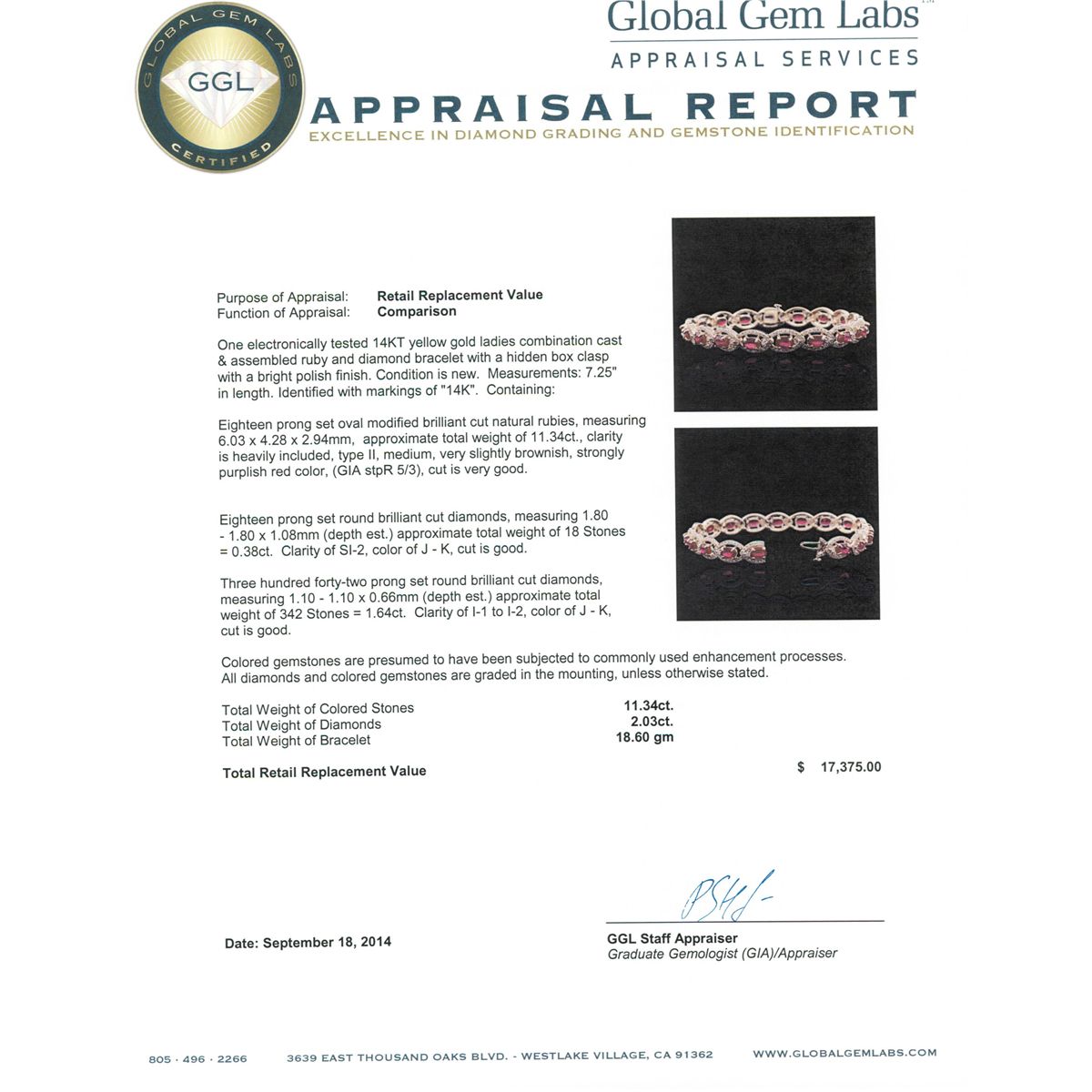 One electronically tested 14KT yellow gold ladies combination cast & assembled ruby and diamond bracelet with a hidden box clasp with a bright polish finish. Measurements: 7.25" in length. Identified with markings of "14K". Condition is new. Containing: Eighteen prong set oval modified brilliant cut natural rubies, measuring 6.03 x 4.28 x 2.94mm, approximate total weight of 11.34ct., clarity is heavily included, type II, medium, very slightly brownish, strongly purplish red color, (GIA stpR 5/3), cut is very good. Eighteen prong set round brilliant cut diamonds, measuring 1.80 - 1.80 x 1.08mm (depth est.) approximate total weight of 18 Stones = 0.38ct. Clarity: SI-2. Color: J - K, Cut is Good. Three Hundred Forty-Two prong set round brilliant cut diamonds, measuring 1.10 - 1.10 x 0.66mm (depth est.) approximate total weight of 342 Stones = 1.64ct. Clarity: I-1 to I-2. Color: J - K, Cut is Good. Colored gemstones are presumed to have been subjected to commonly used enhancement processes. All diamonds and colored gemstones are graded in the mounting, unless otherwise stated. Total Weight of Colored Stones 11.34ct. Total Weight of Diamonds 2.03ct. Total Weight of Bracelet 18.60 grams. GGL Appraised at $17,375.00.