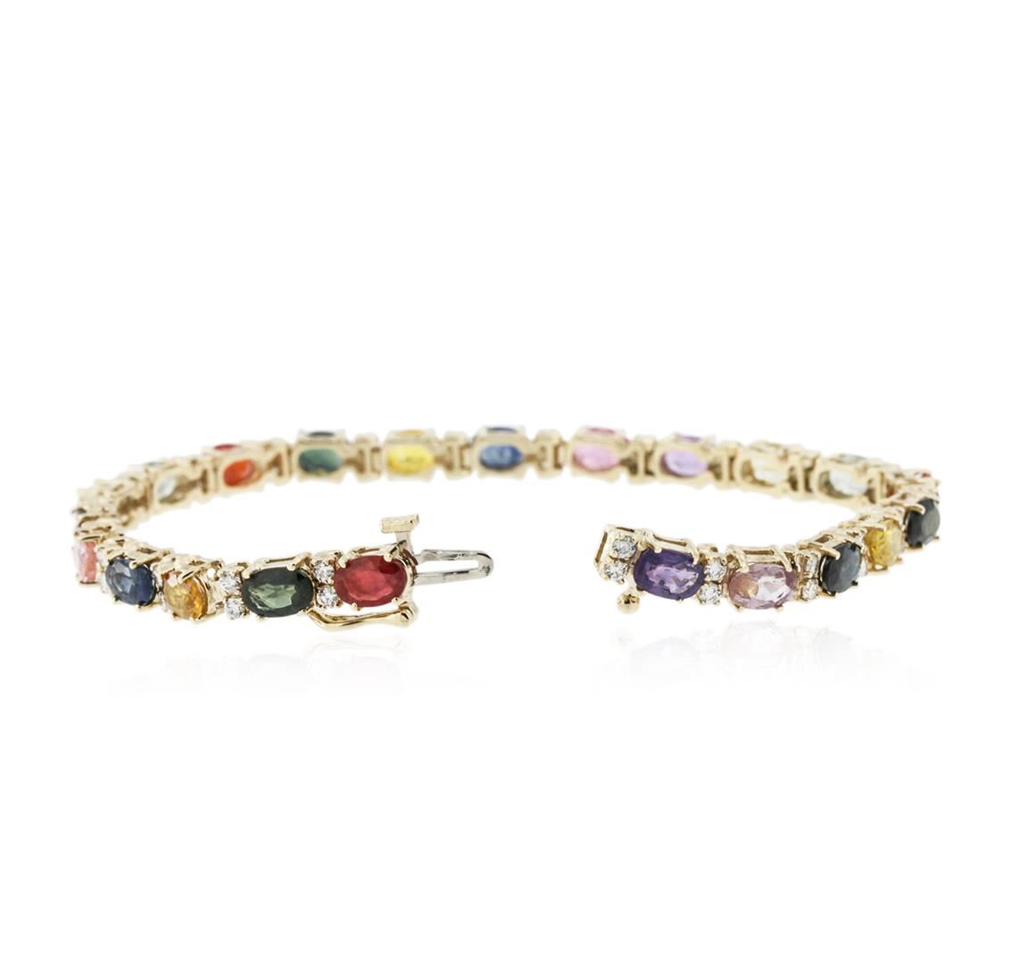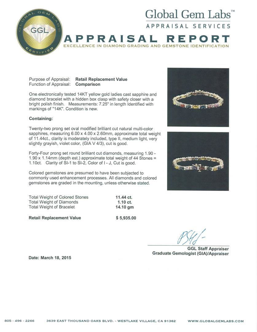 One electronically tested 14KT yellow gold ladies cast sapphire and diamond bracelet with a hidden box clasp with safety closer with a bright polish finish. Measurements: 7.25" in length Identified with markings of "14K". Condition is new. Containing: Twenty-two prong set oval modified brilliant multi color sapphires, measuring 6.00 x 4.00 x 2.60mm, approximate total weight of 11.44ct., clarity is moderately included, type II, medium light, very slightly grayish, violet color, (GIA V 4/3), cut is good. Forty-Four prong set round brilliant cut diamonds, measuring 1.90 - 1.90 x 1.14mm (depth est.) approximate total weight of 44 Stones = 1.10ct. Clarity of SI-1 to SI-2, Color of I - J, Cut is Good. Colored gemstones are presumed to have been subjected to commonly used enhancement processes. All diamonds and colored gemstones are graded in the mounting, unless otherwise stated. Total Weight of Colored Stones 11.44ct. Total Weight of Diamonds 1.10ct. Total Weight of Bracelet 14.10 grams. GGL Appraised at $5,935.00.