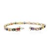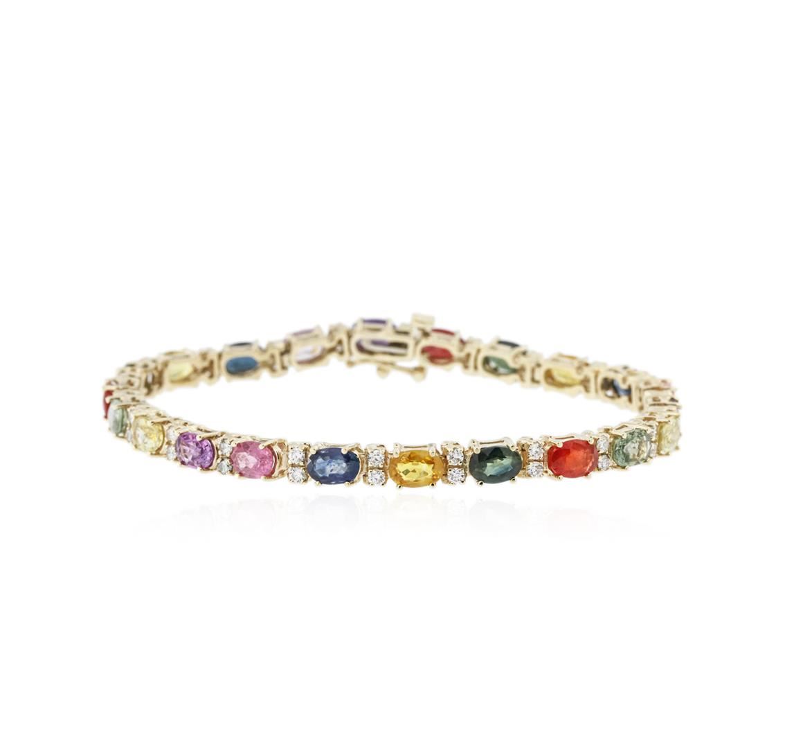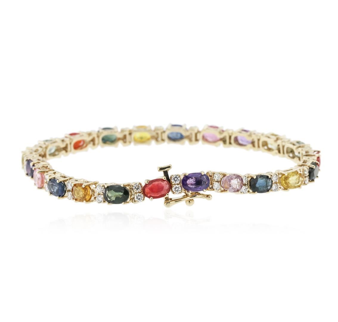 One electronically tested 14KT yellow gold ladies cast sapphire and diamond bracelet with a hidden box clasp with safety closer with a bright polish finish. Measurements: 7.25" in length Identified with markings of "14K". Condition is new. Containing: Twenty-two prong set oval modified brilliant multi color sapphires, measuring 6.00 x 4.00 x 2.60mm, approximate total weight of 11.44ct., clarity is moderately included, type II, medium light, very slightly grayish, violet color, (GIA V 4/3), cut is good. Forty-Four prong set round brilliant cut diamonds, measuring 1.90 - 1.90 x 1.14mm (depth est.) approximate total weight of 44 Stones = 1.10ct. Clarity of SI-1 to SI-2, Color of I - J, Cut is Good. Colored gemstones are presumed to have been subjected to commonly used enhancement processes. All diamonds and colored gemstones are graded in the mounting, unless otherwise stated. Total Weight of Colored Stones 11.44ct. Total Weight of Diamonds 1.10ct. Total Weight of Bracelet 14.10 grams. GGL Appraised at $5,935.00.