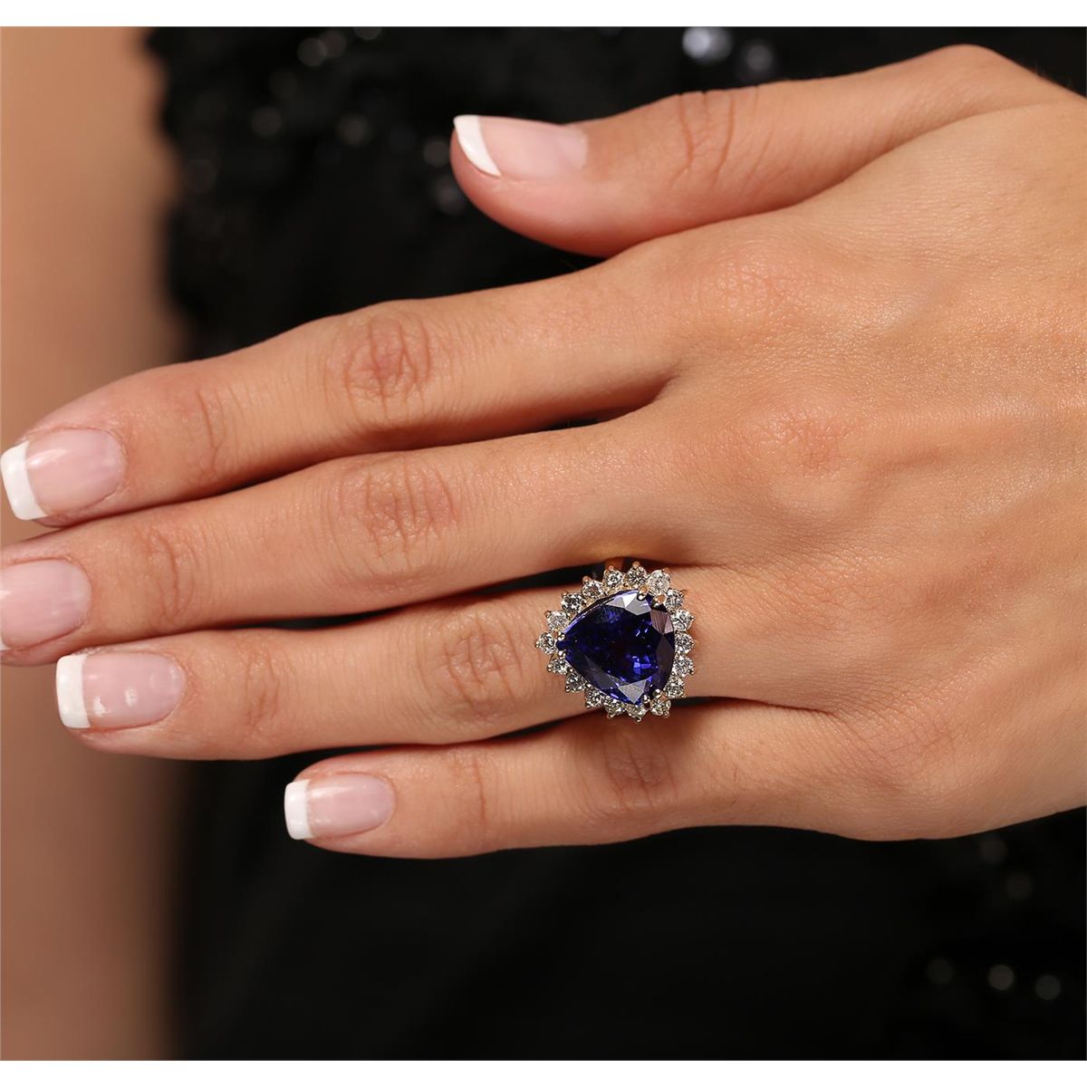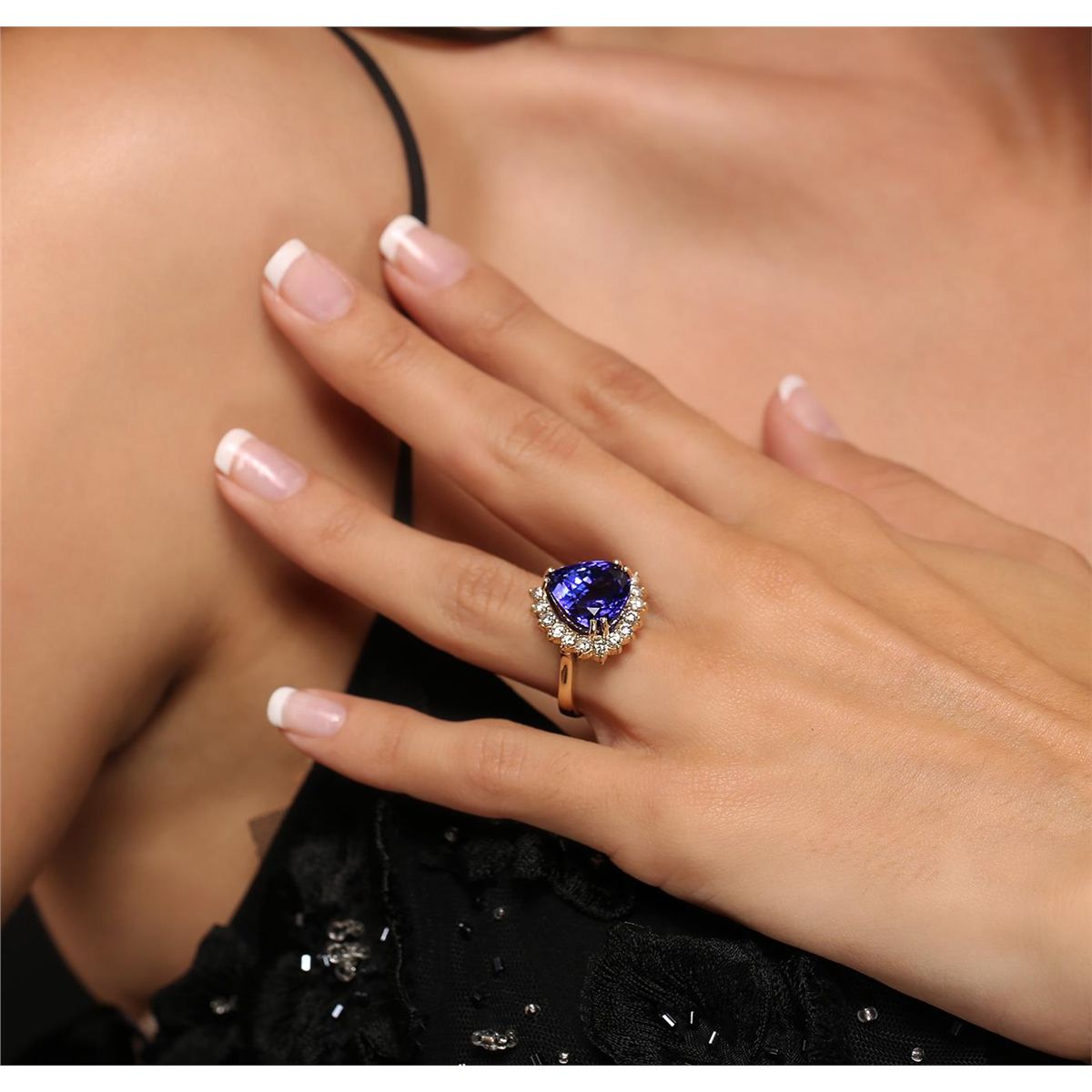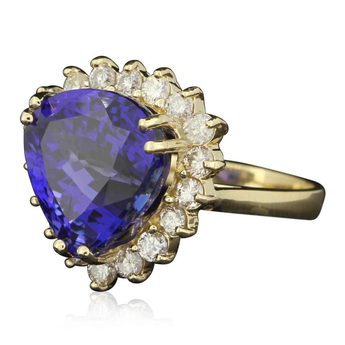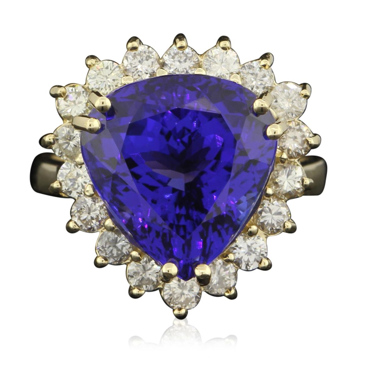 One electronically tested 14KT yellow gold ladies cast tanzanite and diamond ring with a bright polish finish. Condition is new, good workmanship. The featured tanzanite is set within a diamond bezel, completed by a two and one-half millimeter wide band. Identified with markings of "K14". Containing: One prong set pear modified brilliant cut natural tanzanite, measuring 13.46 x 12.87 x 10.13mm, exact weight 11.78ct., clarity is eye clean, type I, medium dark, moderately strong, violetish blue. Color, (GIA vB 6/4), cut is good. Transmitting light with no distortion, transparent. GIA Colored Stone Grading Report attached. Graded loose prior to setting in the GIA Laboratory, Report # 1156735725. Tanzanite is a very rare gemstone that is only found in the country of Tanzania. Originally discovered in 1967. Tiffany & Company, named the stone Tanzanite. It is found in the Usumburu Mountains that border the Umba Valley of northern Tanzania. Tanzanite occurs in gray, brown, violet, blue, reddish-purple, & green. The gem is interesting because of its exceptional pleochroism. Rotated in different directions a tanzanite will exhibit multiple changes of color. Tanzanite has a low tolerance to ultrasonic cleaning, and should not be cleaned using this method. Eighteen prong set round brilliant cut diamonds, measuring 2.50 - 2.40 x 1.47mm (depth est.) approximate total weight of 18 Stones = 1.06ct. Graded in the setting. Clarity SI-1 to I- 1. Color G - I. Total Weight of Colored Stones 11.78ct. Total Weight of Diamonds 1.06ct. Total Weight of Ring 8.00gm. AIG Appraised at $37,215.00.