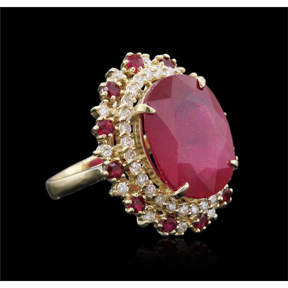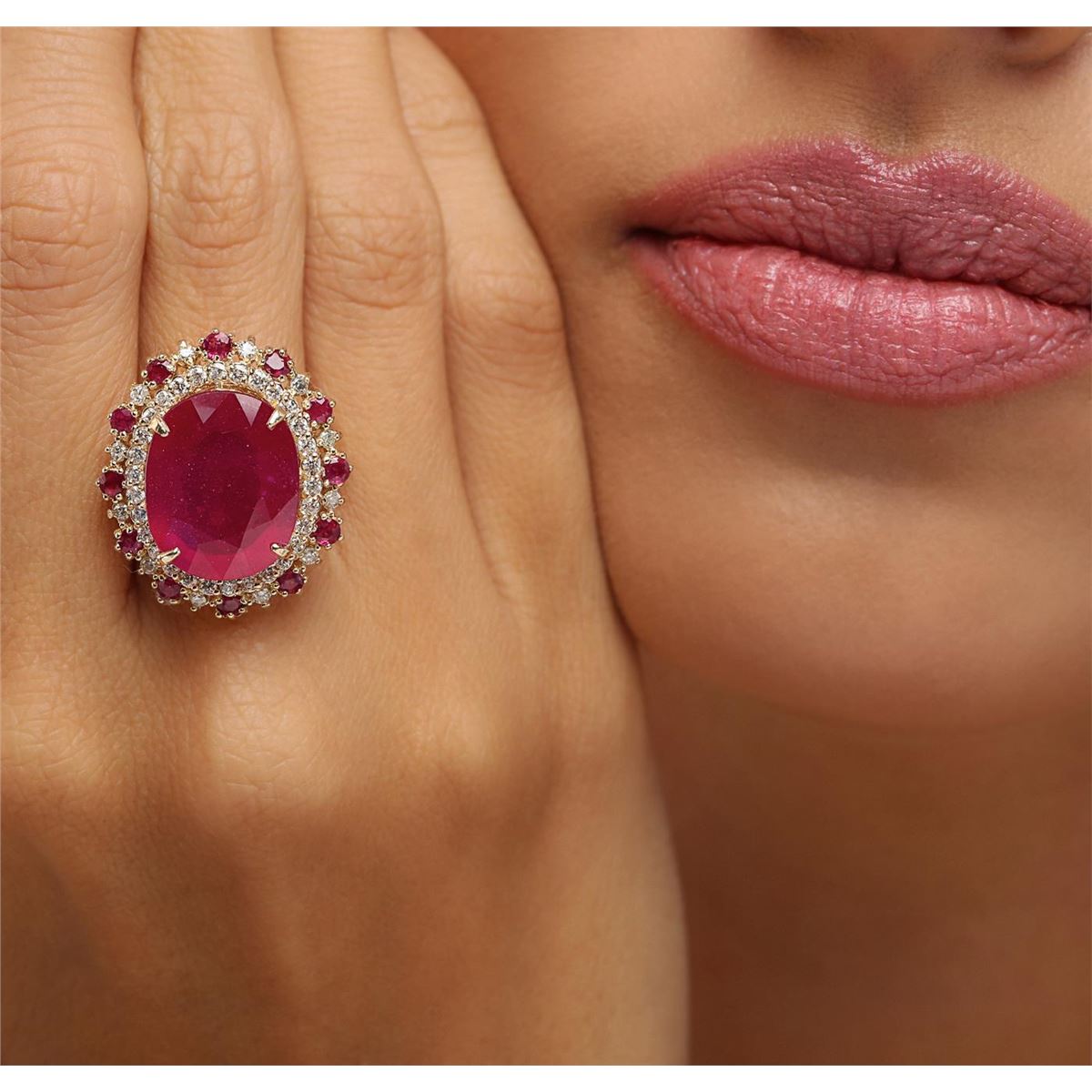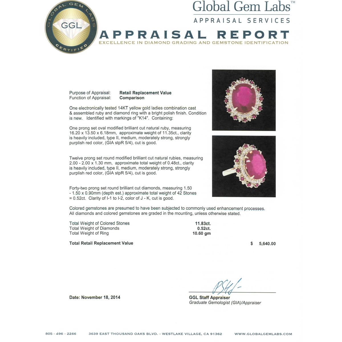 One electronically tested 14KT yellow gold ladies combination cast & assembled ruby and diamond ring with a bright polish finish. Identified with markings of "K14". Condition is new. Containing: One prong set oval modified brilliant cut natural ruby, measuring 16.20 x 13.50 x 6.18mm, approximate weight of 11.35ct., clarity is heavily included, type II, medium, moderately strong, strongly purplish red color, (GIA stpR 5/4), cut is good. Twelve prong set round modified brilliant cut natural rubies, measuring 2.00 - 2.00 x 1.30 mm, approximate total weight of 0.48ct., clarity is heavily included, type II, medium, moderately strong, strongly purplish red color, (GIA stpR 5/4), cut is good. Forty-Two prong set round brilliant cut diamonds, measuring 1.50 - 1.50 x 0.90mm (depth est.) approximate total weight of 42 Stones = 0.52ct. Clarity: I-1 to I-2. Color: J - K, Cut is Good. Colored gemstones are presumed to have been subjected to commonly used enhancement processes. All diamonds and colored gemstones are graded in the mounting, unless otherwise stated. Total Weight of Colored Stones 11.83ct. Total Weight of Diamonds 0.52ct. Total Weight of Ring 10.60 grams. GGL Appraised at $5,640.00.