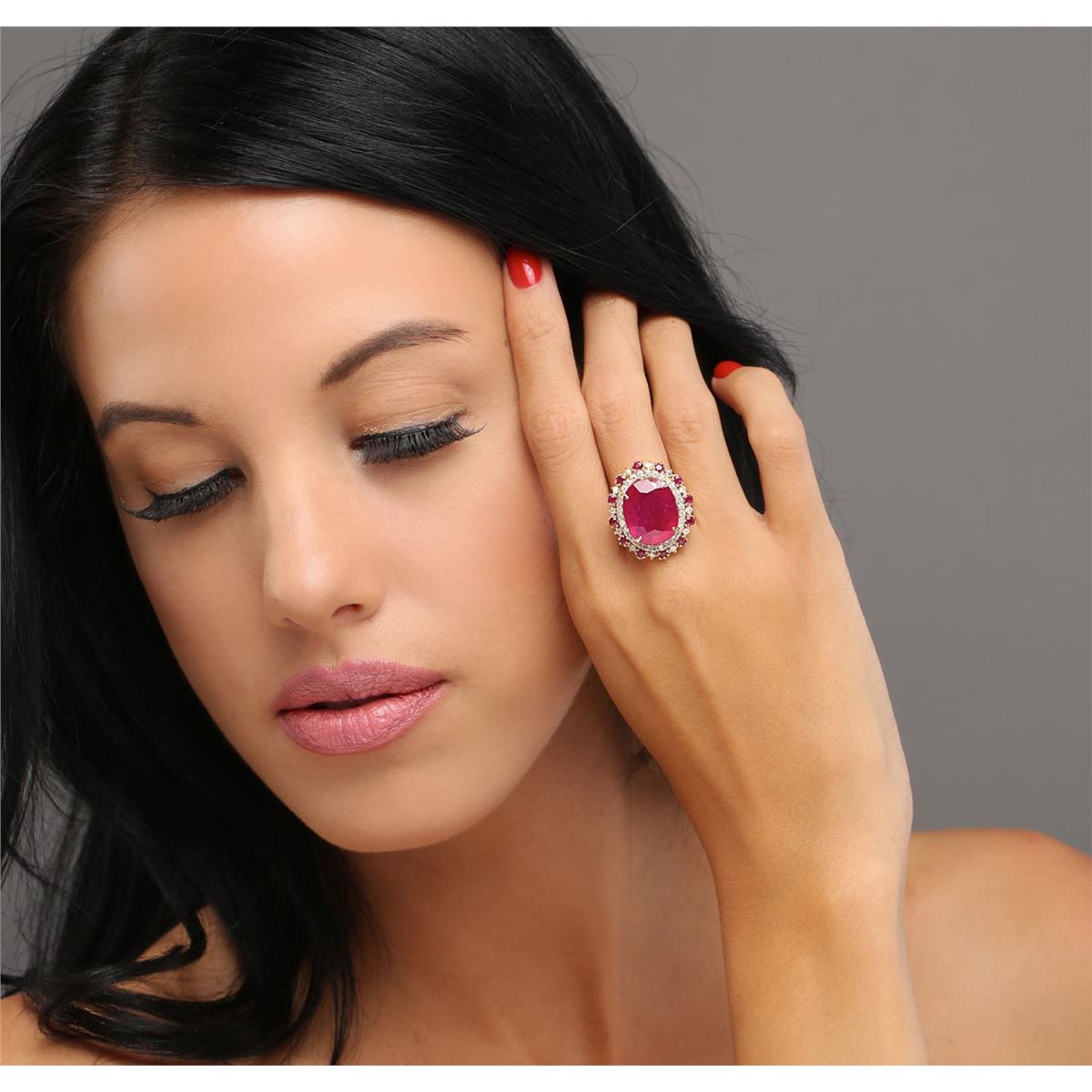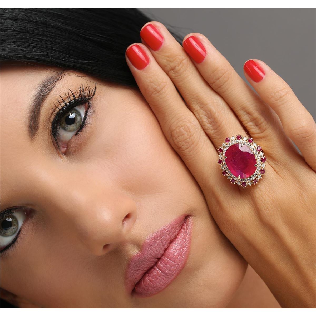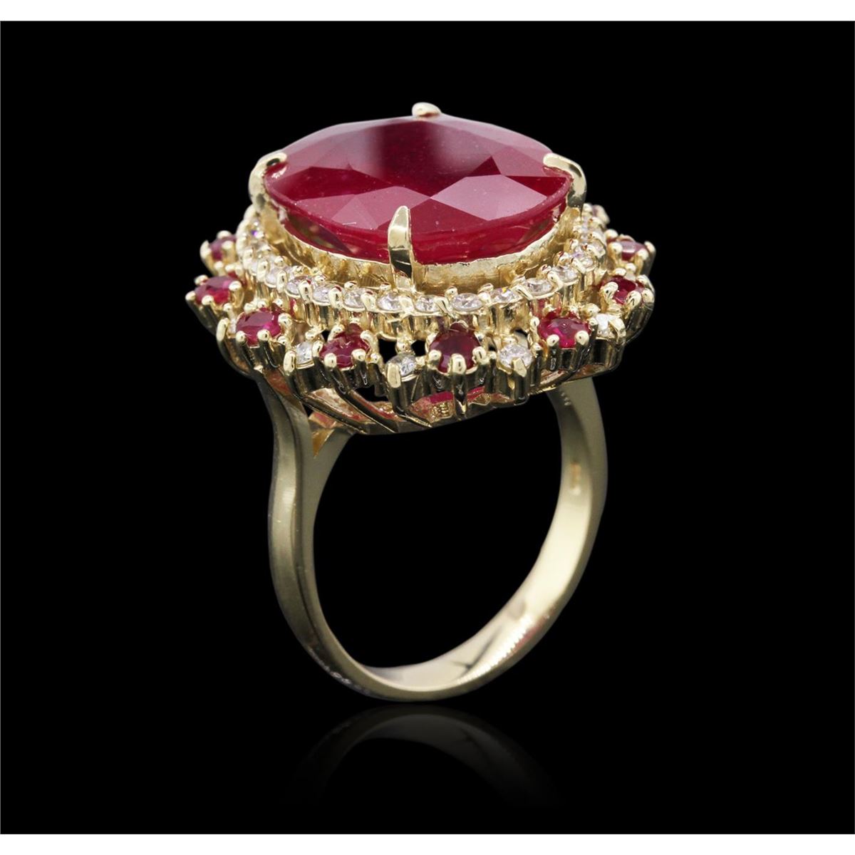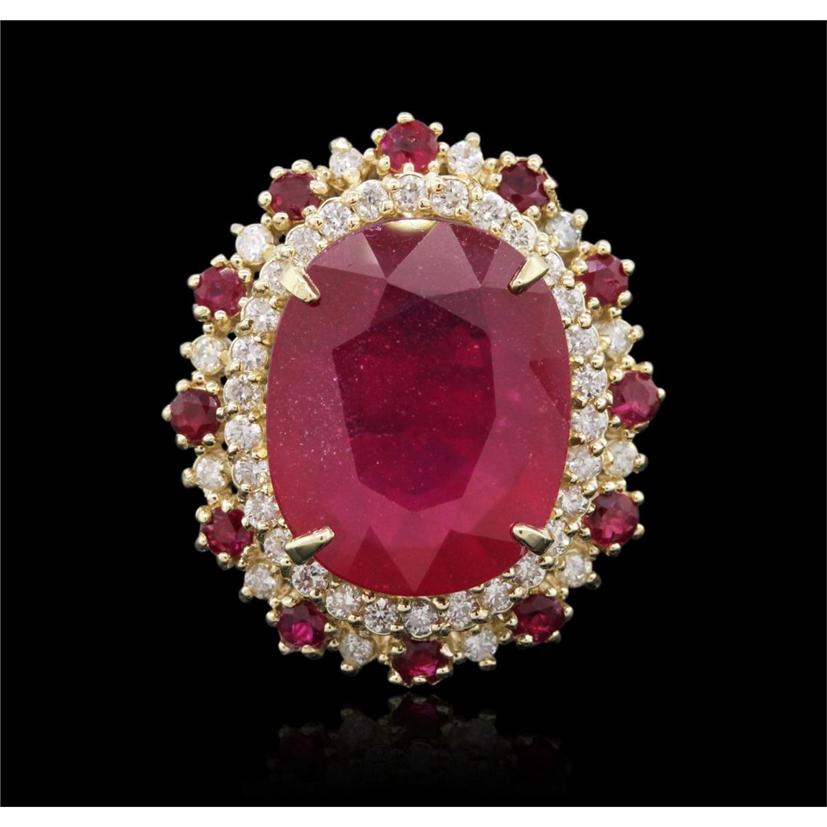 One electronically tested 14KT yellow gold ladies combination cast & assembled ruby and diamond ring with a bright polish finish. Identified with markings of "K14". Condition is new. Containing: One prong set oval modified brilliant cut natural ruby, measuring 16.20 x 13.50 x 6.18mm, approximate weight of 11.35ct., clarity is heavily included, type II, medium, moderately strong, strongly purplish red color, (GIA stpR 5/4), cut is good. Twelve prong set round modified brilliant cut natural rubies, measuring 2.00 - 2.00 x 1.30 mm, approximate total weight of 0.48ct., clarity is heavily included, type II, medium, moderately strong, strongly purplish red color, (GIA stpR 5/4), cut is good. Forty-Two prong set round brilliant cut diamonds, measuring 1.50 - 1.50 x 0.90mm (depth est.) approximate total weight of 42 Stones = 0.52ct. Clarity: I-1 to I-2. Color: J - K, Cut is Good. Colored gemstones are presumed to have been subjected to commonly used enhancement processes. All diamonds and colored gemstones are graded in the mounting, unless otherwise stated. Total Weight of Colored Stones 11.83ct. Total Weight of Diamonds 0.52ct. Total Weight of Ring 10.60 grams. GGL Appraised at $5,640.00.
