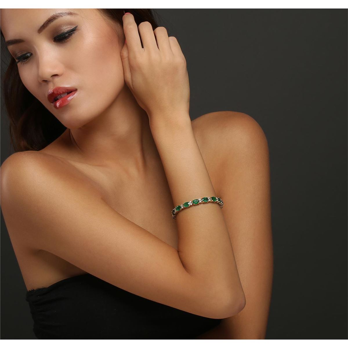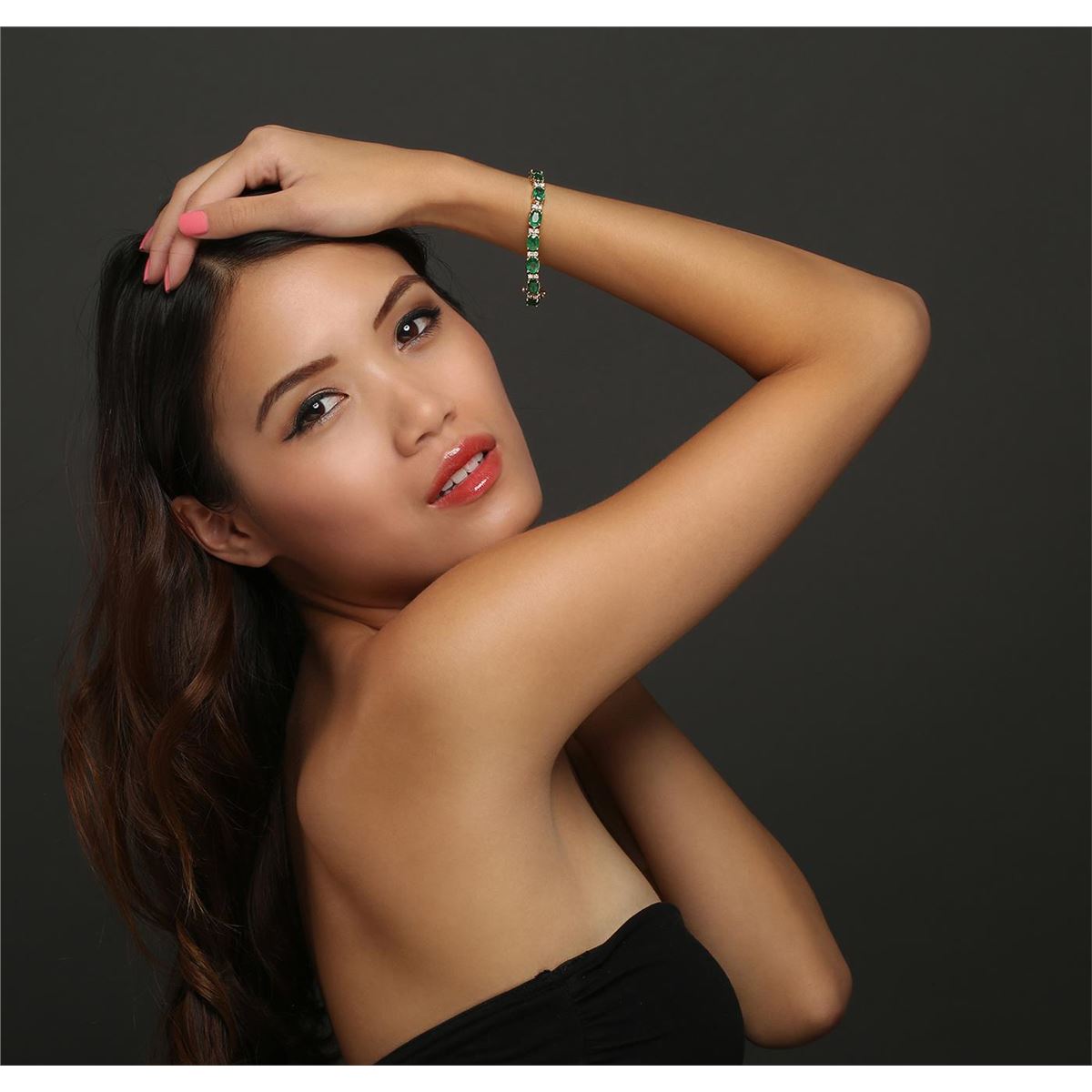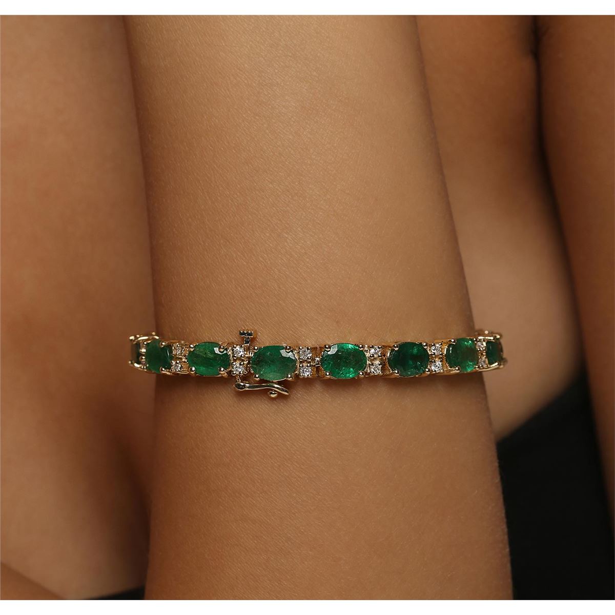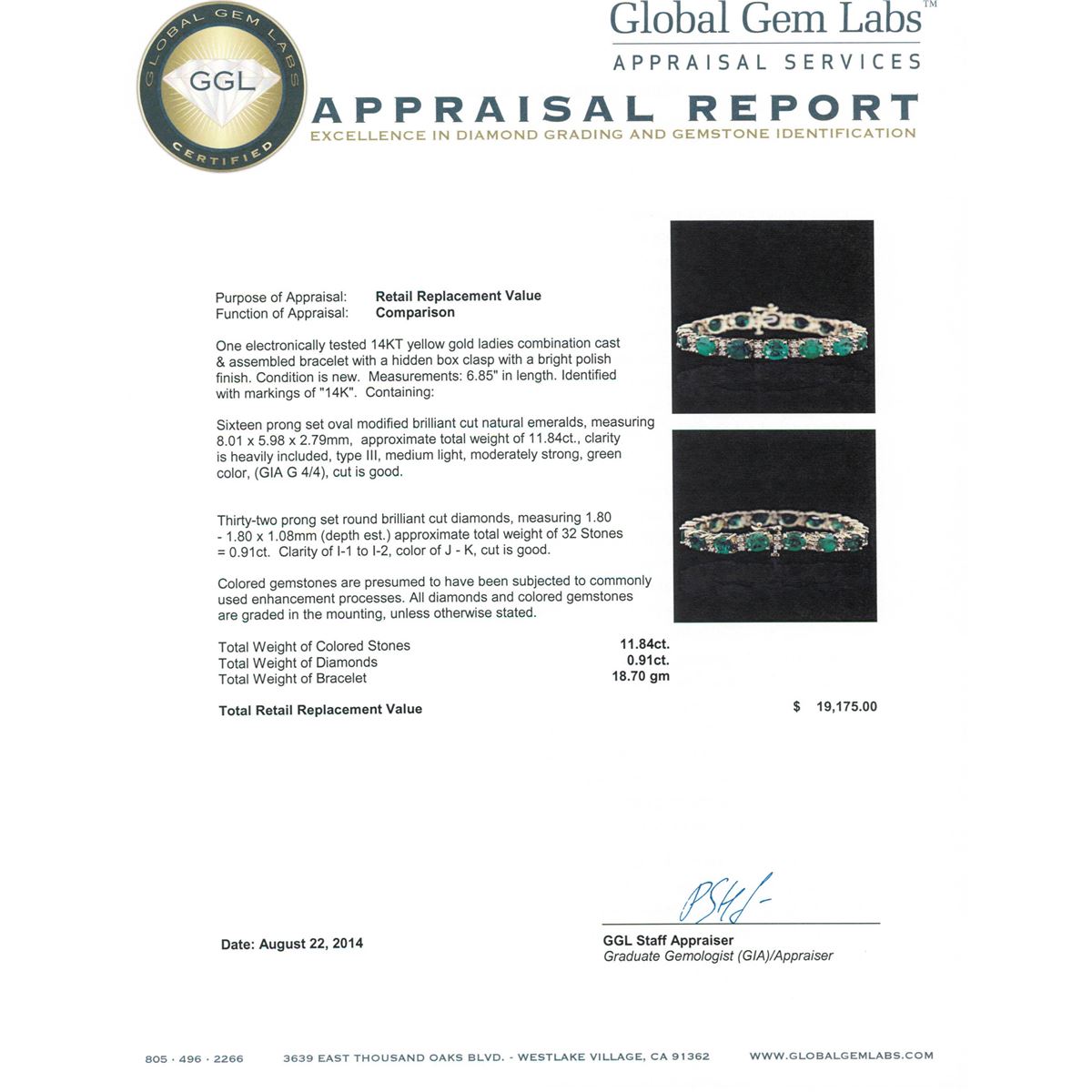 One electronically tested 14KT yellow gold ladies combination cast & assembled bracelet with a hidden box clasp with a bright polish finish. Measurements: 6.85" in length. Identified with markings of "14K". Condition is new. Containing: Sixteen prong set oval modified brilliant cut natural emeralds, measuring 8.01 x 5.98 x 2.79mm, approximate total weight of 11.84ct., clarity is heavily included, type III, medium light, moderately strong, green color, (GIA G 4/4), cut is good. Thirty-Two prong set round brilliant cut diamonds, measuring 1.80 - 1.80 x 1.08mm (depth est.) approximate total weight of 32 Stones = 0.91ct. Clarity: I-1 to I-2. Color: J - K, Cut is Good. Colored gemstones are presumed to have been subjected to commonly used enhancement processes. All diamonds and colored gemstones are graded in the mounting, unless otherwise stated. Total Weight of Colored Stones 11.84ct. Total Weight of Diamonds 0.91ct. Total Weight of Bracelet 18.70 grams. GGL Appraised at $19,175.00.