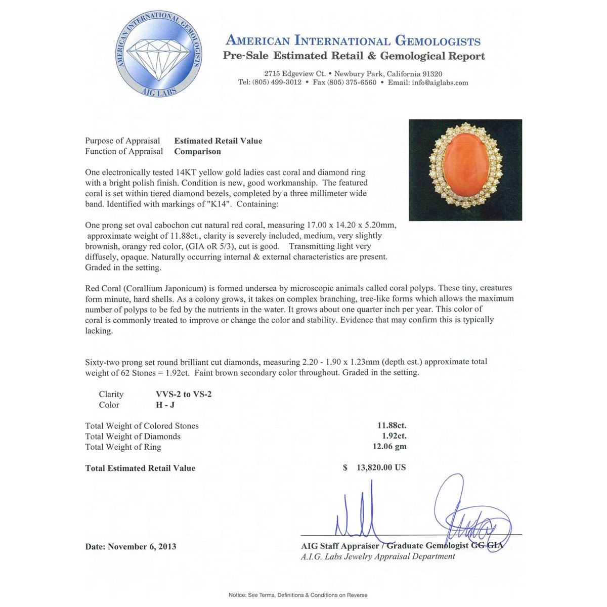One electronically tested 14KT yellow gold ladies cast coral and diamond ring with a bright polish finish. Condition is new, good workmanship. The featured coral is set within tiered diamond bezels, completed by a three millimeter wide band. Identified with markings of "K14". Containing: One prong set oval cabochon cut natural red coral, measuring 17.00 x 14.20 x 5.20mm, approximate weight of 11.88ct., clarity is severely included, medium, very slightly brownish, orangy red color, (GIA oR 5/3), cut is good. Transmitting light very diffusely, opaque. Naturally occurring internal & external characteristics are present. Graded in the setting. Red Coral (Corallium Japonicum) is formed undersea by microscopic animals called coral polyps. These tiny, creatures form minute, hard shells. As a colony grows, it takes on complex branching, tree-like forms which allows the maximum number of polyps to be fed by the nutrients in the water. It grows about one quarter inch per year. This color of coral is commonly treated to improve or change the color and stability. Evidence that may confirm this is typically lacking. Sixty-two prong set round brilliant cut diamonds, measuring 2.20 - 1.90 x 1.23mm (depth est.) approximate total weight of 62 Stones = 1.92ct. Faint brown secondary color throughout. Graded in the setting. Clarity VVS-2 to VS-2. Color H - J. Total Weight of Colored Stones 11.88ct. Total Weight of Diamonds 1.92ct. Total Weight of Ring 12.06gm. AIG Appraised at $13,820.00.