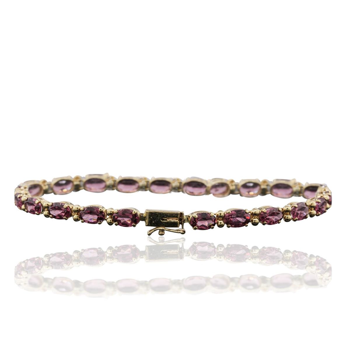 One electronically tested 14KT yellow gold ladies cast & assembled rhodolite garnet bracelet with a bright polish finish. Seven and one-half inch length bracelet features a continuous rhodolite garnet ribbon, terminating in a concealed clasp with safety. Identified with markings of "14K". Condition is new, good workmanship. Containing: Twenty-two prong set oval mixed cut natural rhodolite garnets, measuring 6.00 x 4.00 x 2.70mm, 6% bulge factor, approximate total weight of 11.88ct., clarity is slightly included, type II, medium dark, very slightly brownish, strongly purplish red color, (GIA stpR 6/3), cut is good. Transmitting light with a minimum of distortion, transparent. Naturally occurring internal & external characteristics are present. Measurements & the color grade are an average for the group. Graded in the setting. Total Weight of Colored Stones 11.88ct. Total Weight of Bracelet 8.12 grams. AIG Appraised at $1,455.00.