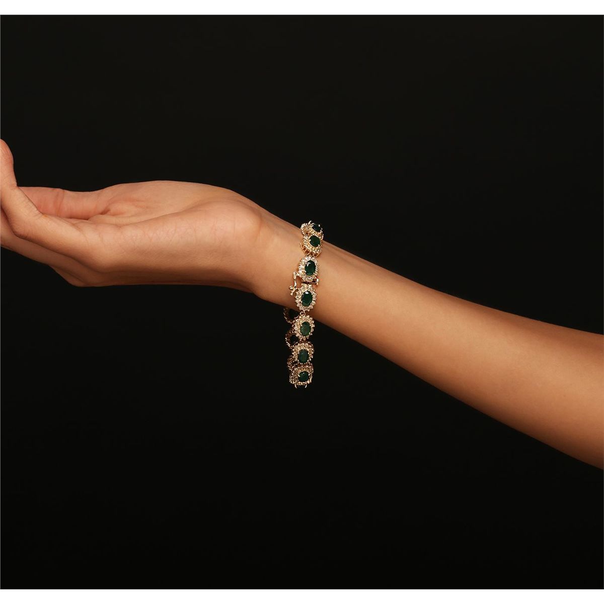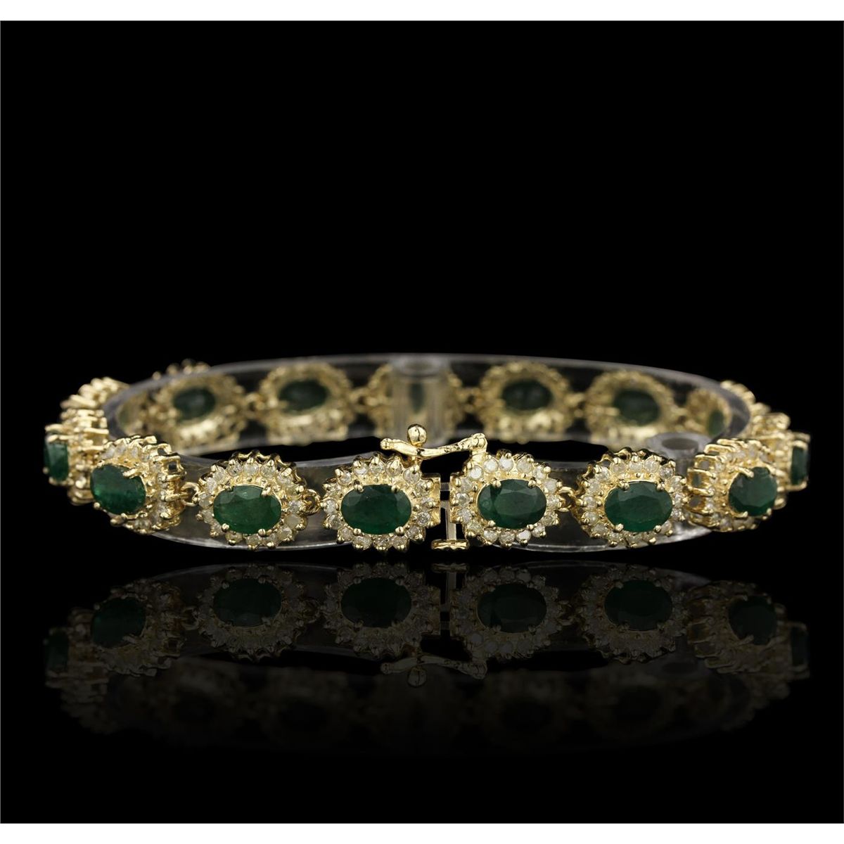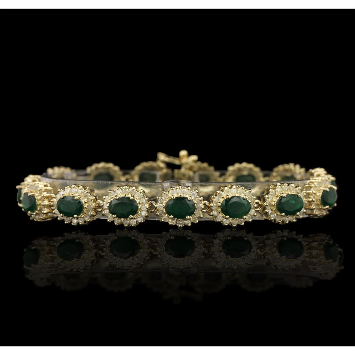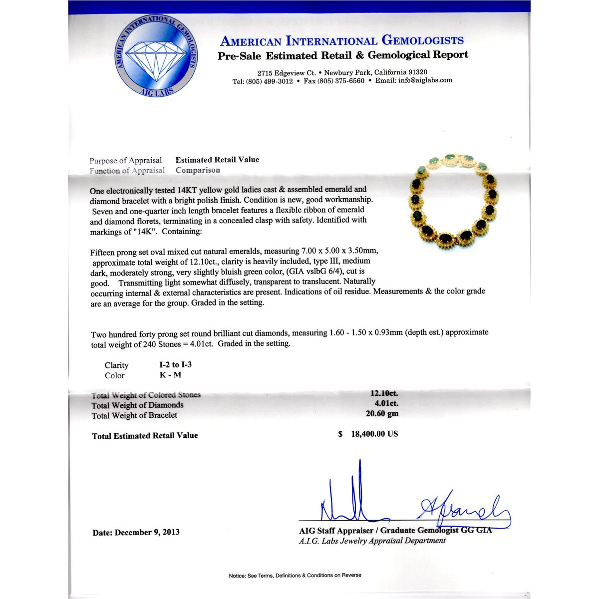 One electronically tested 14KT yellow gold ladies cast & assembled emerald and diamond bracelet with a bright polish finish. Seven and one-quarter inch length bracelet features a flexible ribbon of emerald and diamond florets, terminating in a concealed clasp with safety. Identified with markings of "14K". Condition is new, good workmanship. Containing: Fifteen prong set oval mixed cut natural emeralds, measuring 7.00 x 5.00 x 3.50mm, approximate. Total Weight of 12.10ct., clarity is heavily included, type III, medium dark, moderately strong, very slightly bluish green color, (GIA vslbG 6/4), cut is good. Transmitting light somewhat diffusely, transparent to translucent. Naturally occurring internal & external characteristics are present. Indications of oil residue. Measurements & the color grade are an average for the group. Graded in the setting. Two Hundred Forty prong set round brilliant cut diamonds, measuring 1.60 - 1.50 x 0.93mm (depth est.) approximate. Total Weight of 240 Stones = 4.01ct. Graded in the setting. Clarity: I-2 to I-3. Color: K - M. Total Weight of Colored Stones 12.10ct.. Total Weight of Diamonds 4.01ct. AIG Appraised at $18,400.00.