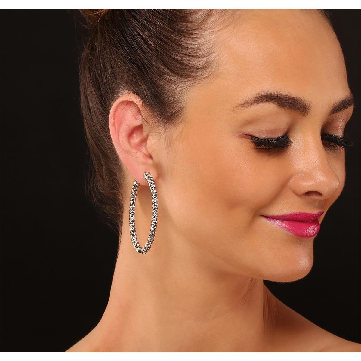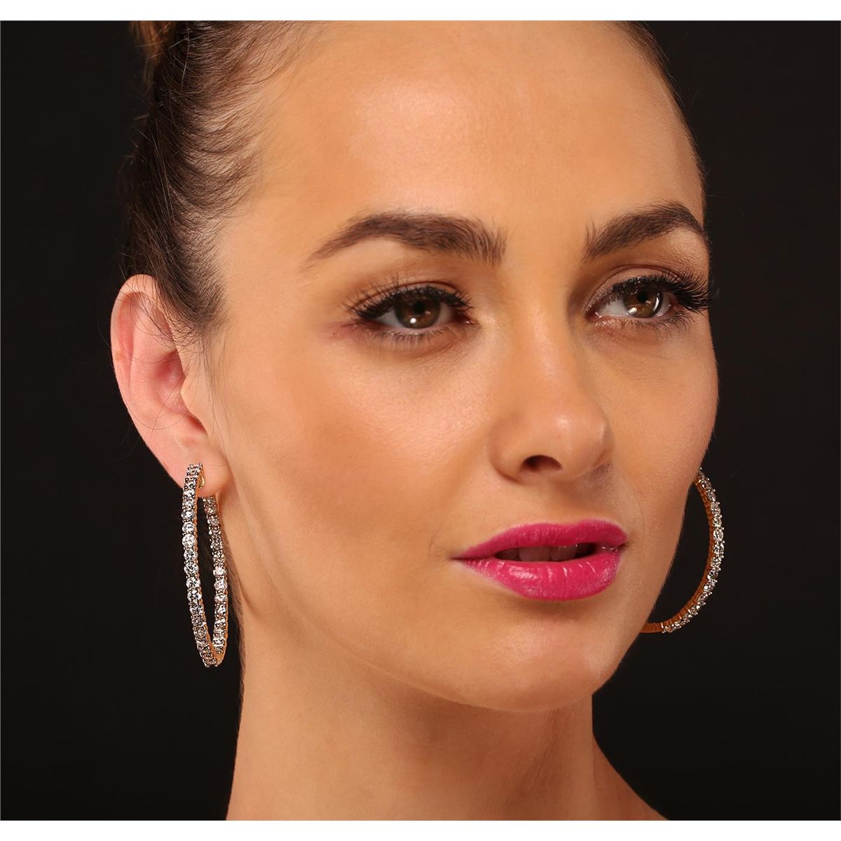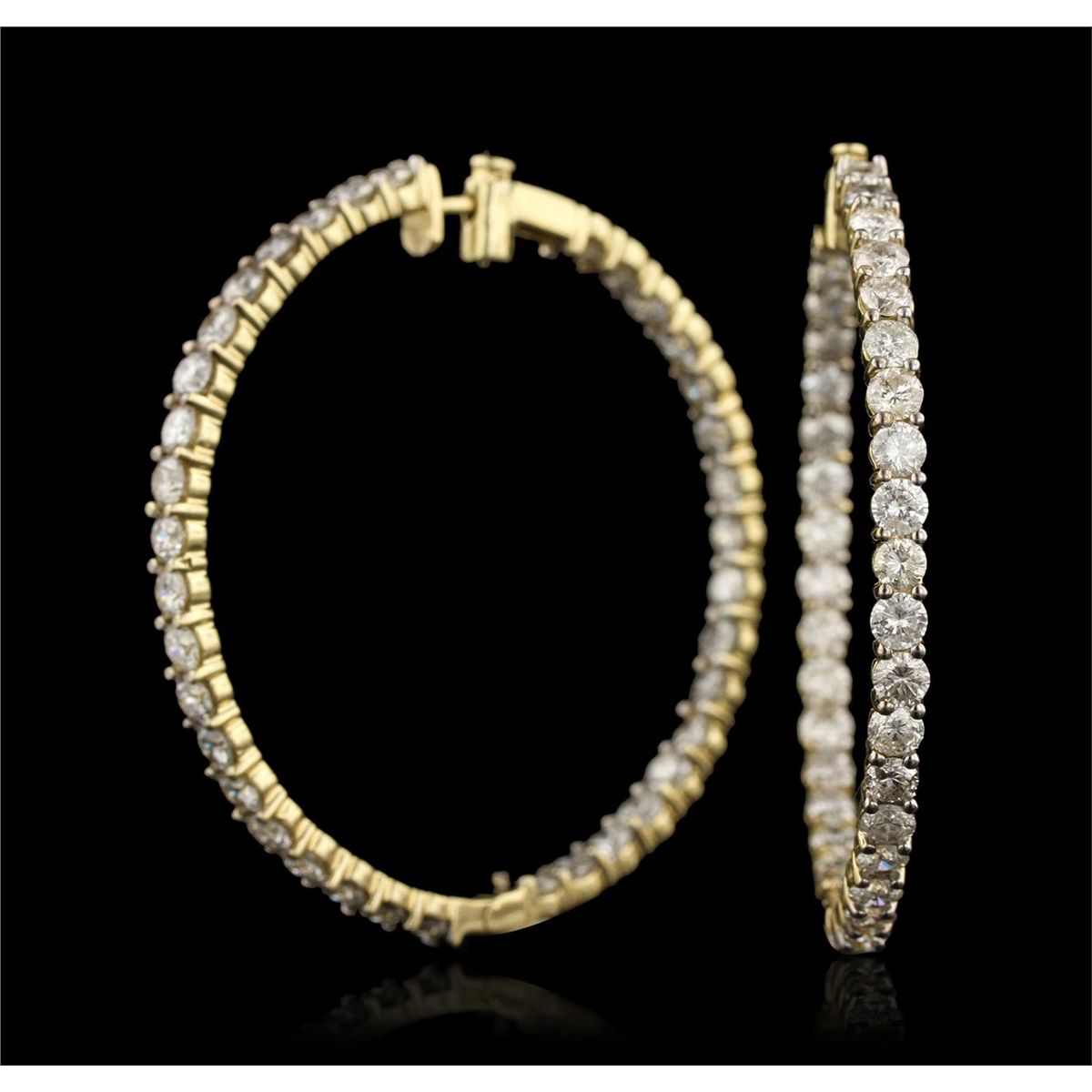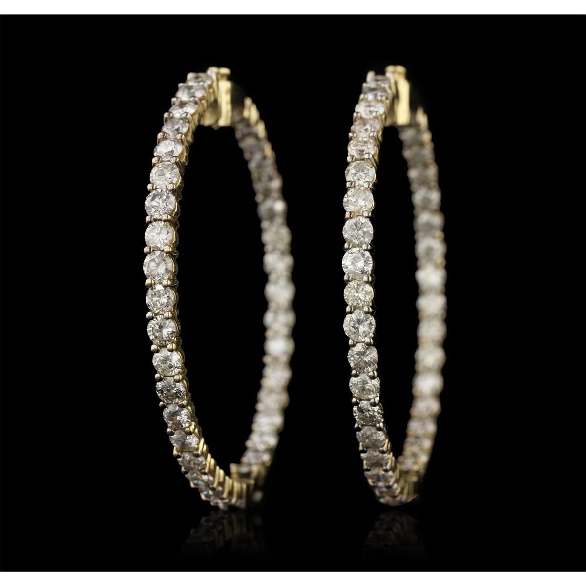 One pair electronically tested 14KT yellow gold ladies cast & assembled In and Out diamond hoop earrings with hinged, snap locking posts. Condition is good. Each hoop measures two inches in diameter. Bright polish finish. Identified with markings of "14K". Containing: Seventy-four prong set round brilliant cut diamonds, measuring 3.60 - 3.50 x 2.13mm (depth est.) approximate total weight of 74 Stones = 12.25ct. Graded in the setting. Clarity: SI-2 to I-2 . Color: H - J. Total Weight of Diamonds 12.25ct. Total Weight of Hoop Earrings 25.05 gm. AIG Appraised at $37,365.00.