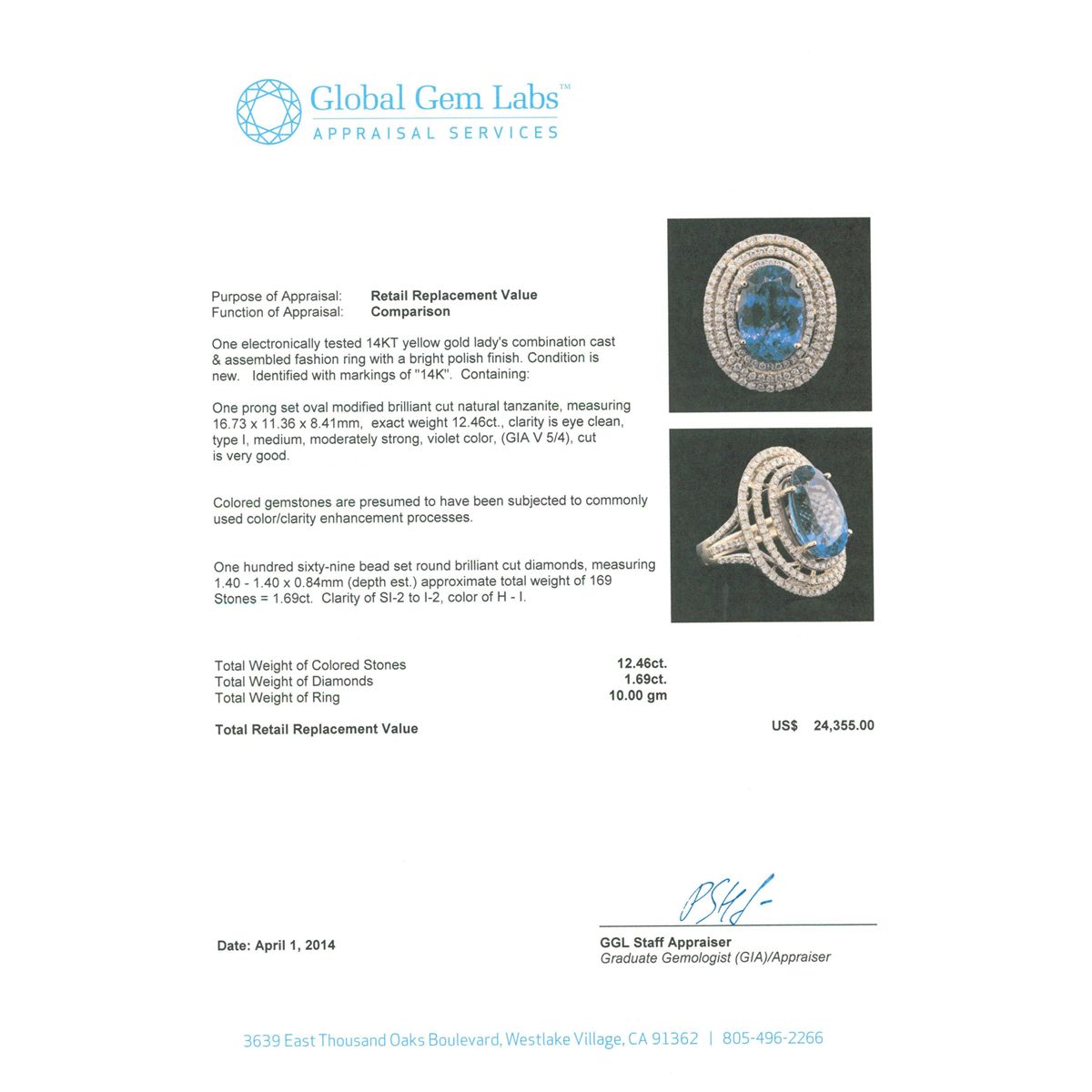One electronically tested 14KT yellow gold Ladies combination cast & assembled fashion ring with a bright polish finish. Condition is new. Identified with markings of "14K". Containing: One prong set oval modified brilliant cut natural tanzanite, measuring 16.73 x 11.36 x 8.41mm, exact weight 12.46ct., clarity is eye clean, type I, medium, moderately strong, violet color, (GIA V 5/4), cut is very good. GIA Report: #1156953477.Colored gemstones are presumed to have been subjected to commonly used color/clarity enhancement processes. One Hundred Sixty-Nine bead set round brilliant cut diamonds, measuring 1.40 - 1.40 x 0.84mm (depth est.) approximate. Total Weight of 169 Stones = 1.69ct. Clarity: SI-2 to I-2. Color: H - I. Total Weight of Colored Stones 12.46ct. Total Weight of Diamonds 1.69ct. Total Weight of Ring 10.00 grams. GGL Appraised at $24,355.00.