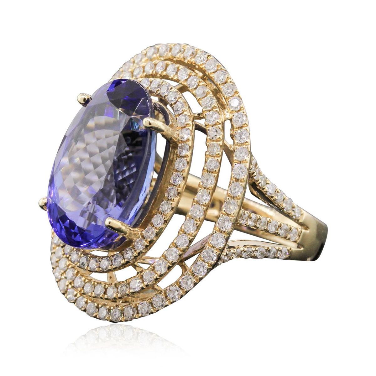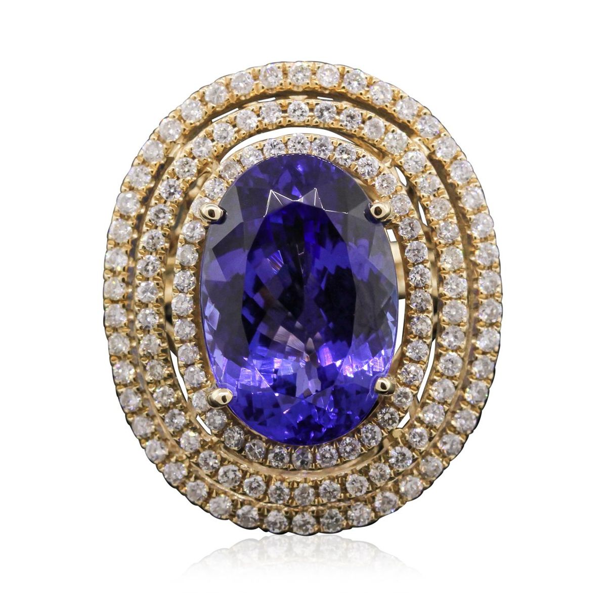 One electronically tested 14KT yellow gold Ladies combination cast & assembled fashion ring with a bright polish finish. Condition is new. Identified with markings of "14K". Containing: One prong set oval modified brilliant cut natural tanzanite, measuring 16.73 x 11.36 x 8.41mm, exact weight 12.46ct., clarity is eye clean, type I, medium, moderately strong, violet color, (GIA V 5/4), cut is very good. GIA Report: #1156953477.Colored gemstones are presumed to have been subjected to commonly used color/clarity enhancement processes. One Hundred Sixty-Nine bead set round brilliant cut diamonds, measuring 1.40 - 1.40 x 0.84mm (depth est.) approximate. Total Weight of 169 Stones = 1.69ct. Clarity: SI-2 to I-2. Color: H - I. Total Weight of Colored Stones 12.46ct. Total Weight of Diamonds 1.69ct. Total Weight of Ring 10.00 grams. GGL Appraised at $24,355.00.