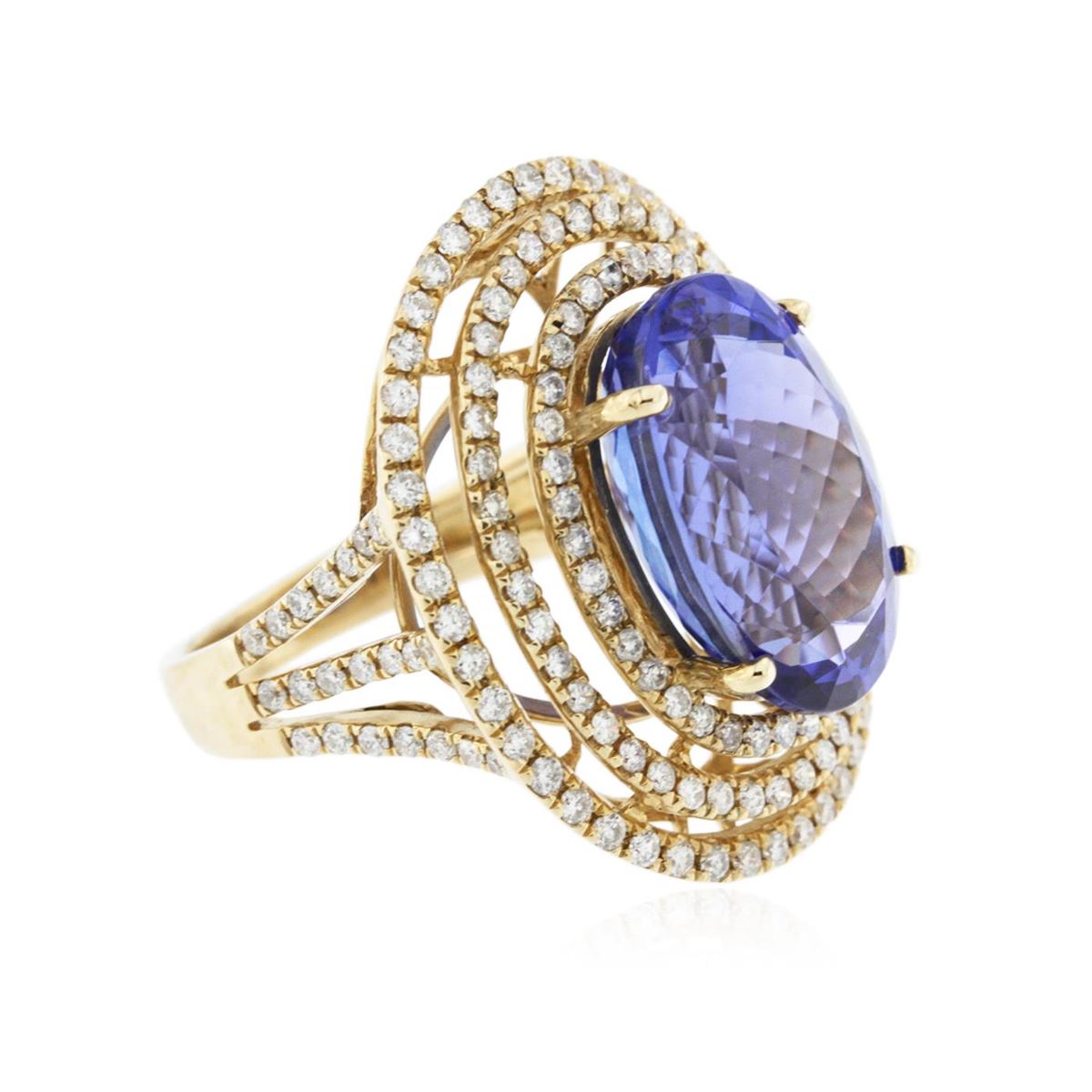 One electronically tested 14KT yellow gold Ladies combination cast & assembled fashion ring with a bright polish finish. Condition is new. Identified with markings of "14K". Containing: One prong set oval modified brilliant cut natural tanzanite, measuring 16.73 x 11.36 x 8.41mm, exact weight 12.46ct., clarity is eye clean, type I, medium, moderately strong, violet color, (GIA V 5/4), cut is very good. GIA Report: #1156953477.Colored gemstones are presumed to have been subjected to commonly used color/clarity enhancement processes. One Hundred Sixty-Nine bead set round brilliant cut diamonds, measuring 1.40 - 1.40 x 0.84mm (depth est.) approximate. Total Weight of 169 Stones = 1.69ct. Clarity: SI-2 to I-2. Color: H - I. Total Weight of Colored Stones 12.46ct. Total Weight of Diamonds 1.69ct. Total Weight of Ring 10.00 grams. GGL Appraised at $24,355.00.