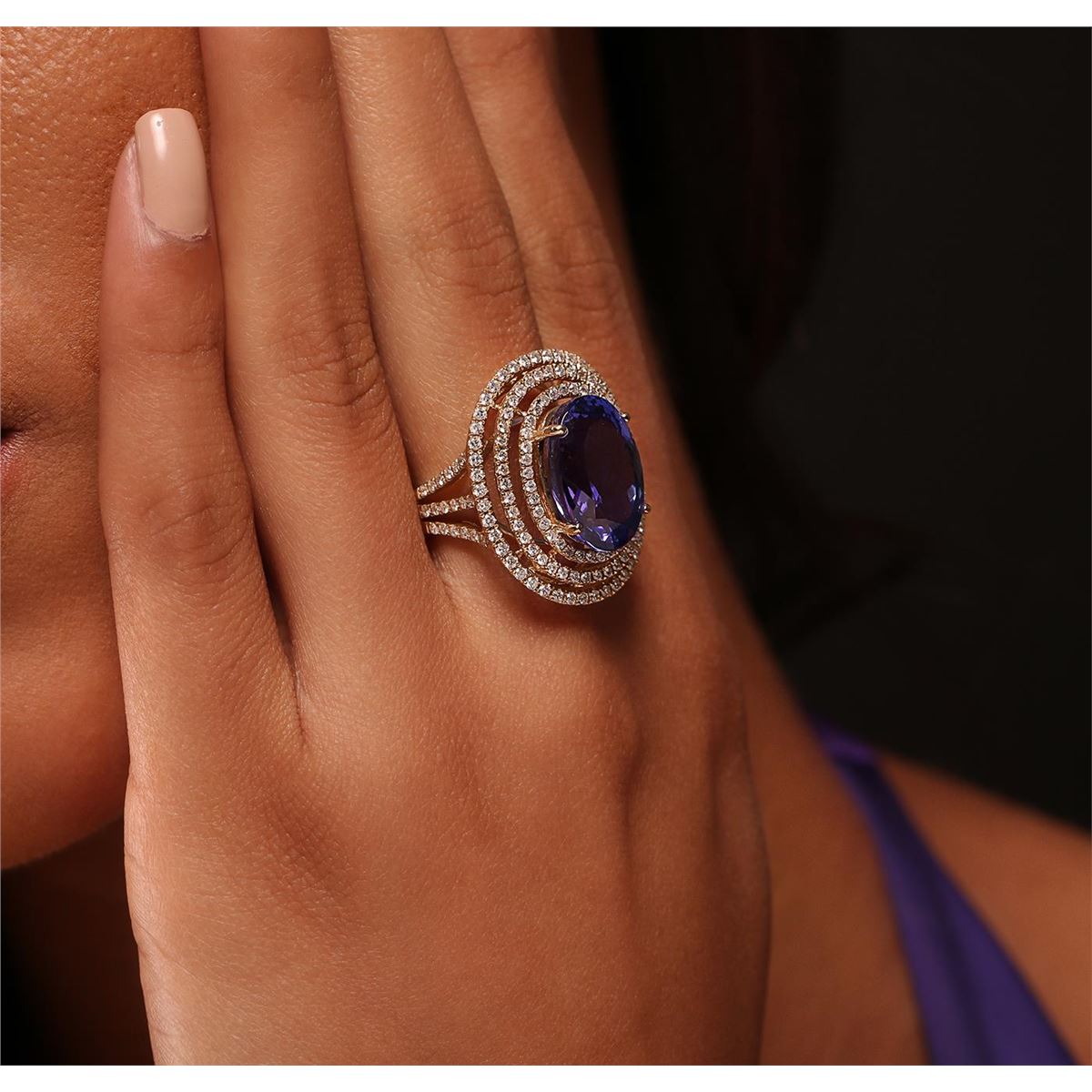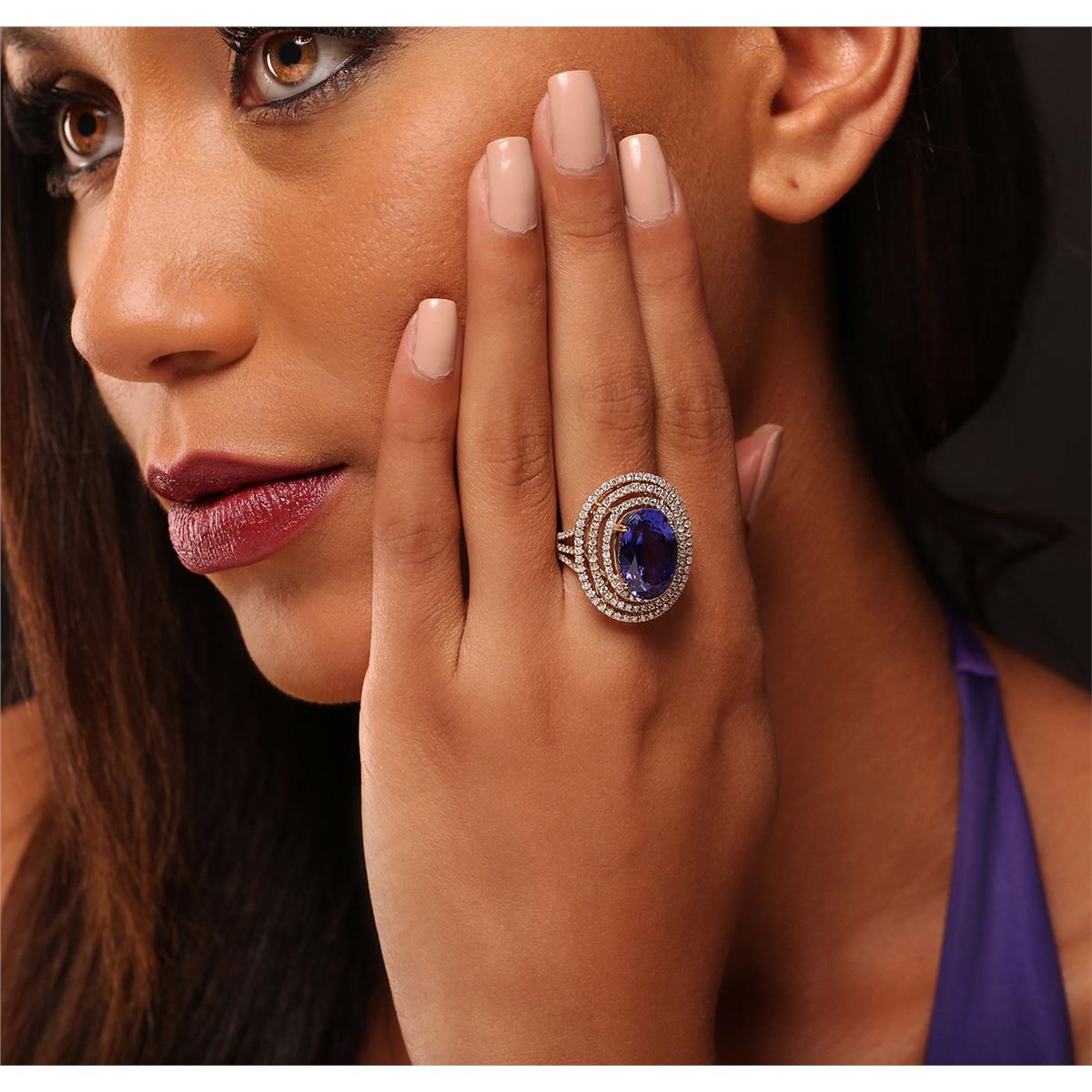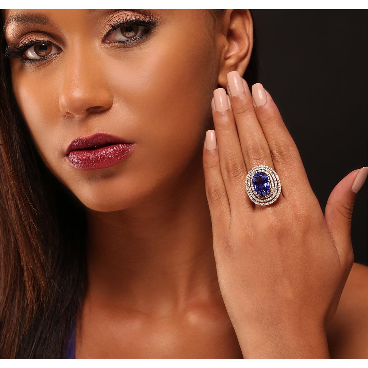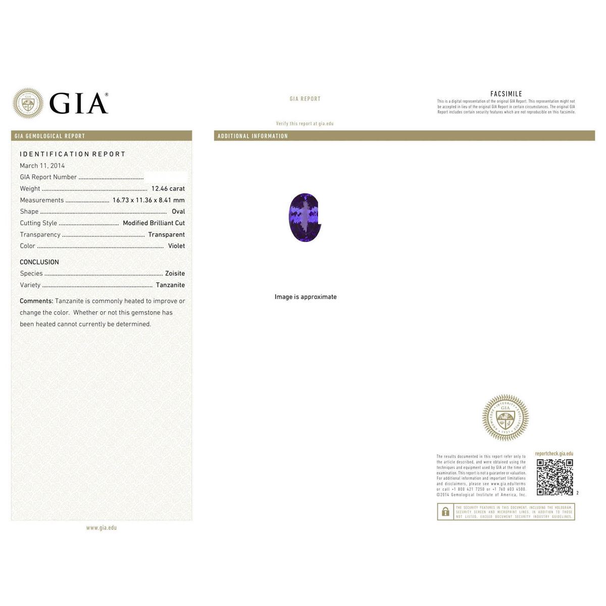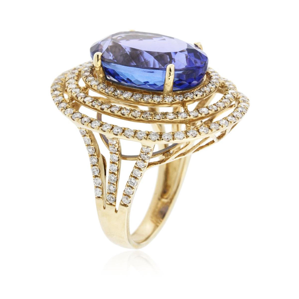 One electronically tested 14KT yellow gold Ladies combination cast & assembled fashion ring with a bright polish finish. Condition is new. Identified with markings of "14K". Containing: One prong set oval modified brilliant cut natural tanzanite, measuring 16.73 x 11.36 x 8.41mm, exact weight 12.46ct., clarity is eye clean, type I, medium, moderately strong, violet color, (GIA V 5/4), cut is very good. GIA Report: #1156953477.Colored gemstones are presumed to have been subjected to commonly used color/clarity enhancement processes. One Hundred Sixty-Nine bead set round brilliant cut diamonds, measuring 1.40 - 1.40 x 0.84mm (depth est.) approximate. Total Weight of 169 Stones = 1.69ct. Clarity: SI-2 to I-2. Color: H - I. Total Weight of Colored Stones 12.46ct. Total Weight of Diamonds 1.69ct. Total Weight of Ring 10.00 grams. GGL Appraised at $24,355.00.