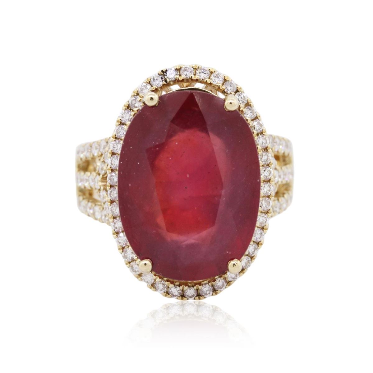 One electronically tested 14KT yellow gold ladies combination cast & assembled ruby and diamond ring with a split shank with a bright polish finish. Identified with markings of "14K". Condition is new. Containing: One prong set oval modified brilliant cut natural ruby, measuring 17.38 x 13.08 x 6.74mm, approximate weight of 12.48ct., clarity is heavily included, medium, moderately strong, strongly purplish red color, (GIA stpR 5/4), cut is good. Eighty-Eight prong set round brilliant cut diamonds, measuring 1.40 - 1.30 x 0.81mm (depth est.) approximate total weight of 88 Stones = 0.79ct. Clarity: SI-2 to I-1. Color: I - J, Cut is Good. Colored gemstones are presumed to have been subjected to commonly used enhancement processes. All diamonds and colored gemstones are graded in the mounting, unless otherwise stated. Total Weight of Colored Stones 12.48ct. Total Weight of Diamonds 0.79ct. Total Weight of Ring 9.80 grams. GGL Appraised at $8,705.00.