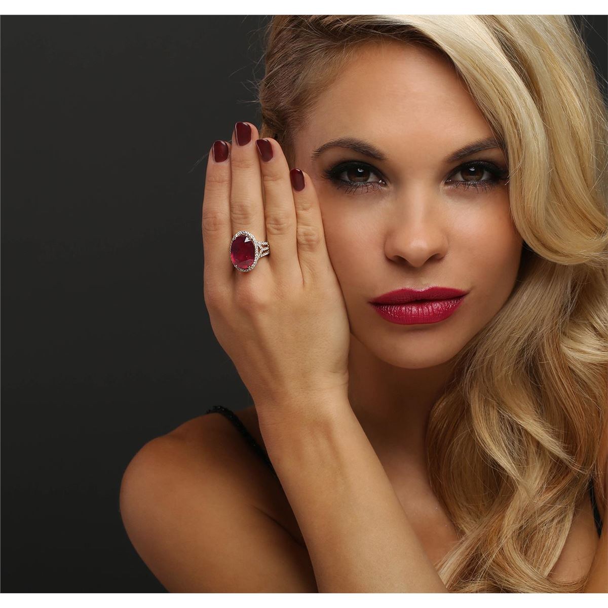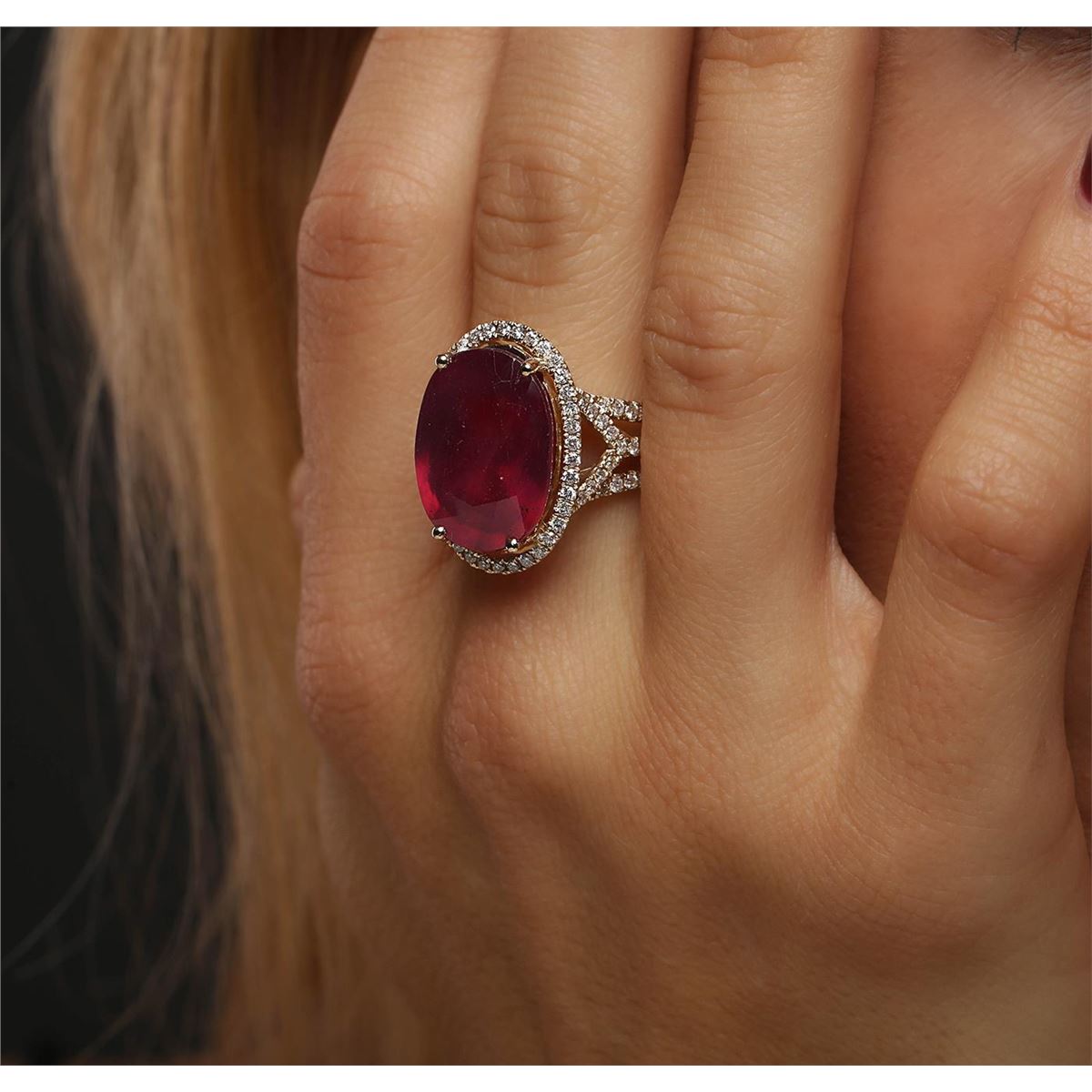 One electronically tested 14KT yellow gold ladies combination cast & assembled ruby and diamond ring with a split shank with a bright polish finish. Identified with markings of "14K". Condition is new. Containing: One prong set oval modified brilliant cut natural ruby, measuring 17.38 x 13.08 x 6.74mm, approximate weight of 12.48ct., clarity is heavily included, medium, moderately strong, strongly purplish red color, (GIA stpR 5/4), cut is good. Eighty-Eight prong set round brilliant cut diamonds, measuring 1.40 - 1.30 x 0.81mm (depth est.) approximate total weight of 88 Stones = 0.79ct. Clarity: SI-2 to I-1. Color: I - J, Cut is Good. Colored gemstones are presumed to have been subjected to commonly used enhancement processes. All diamonds and colored gemstones are graded in the mounting, unless otherwise stated. Total Weight of Colored Stones 12.48ct. Total Weight of Diamonds 0.79ct. Total Weight of Ring 9.80 grams. GGL Appraised at $8,705.00.