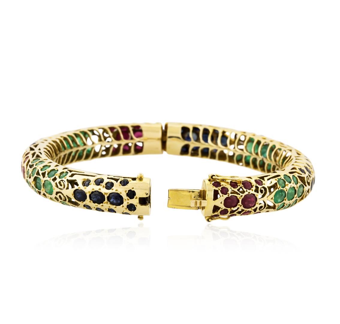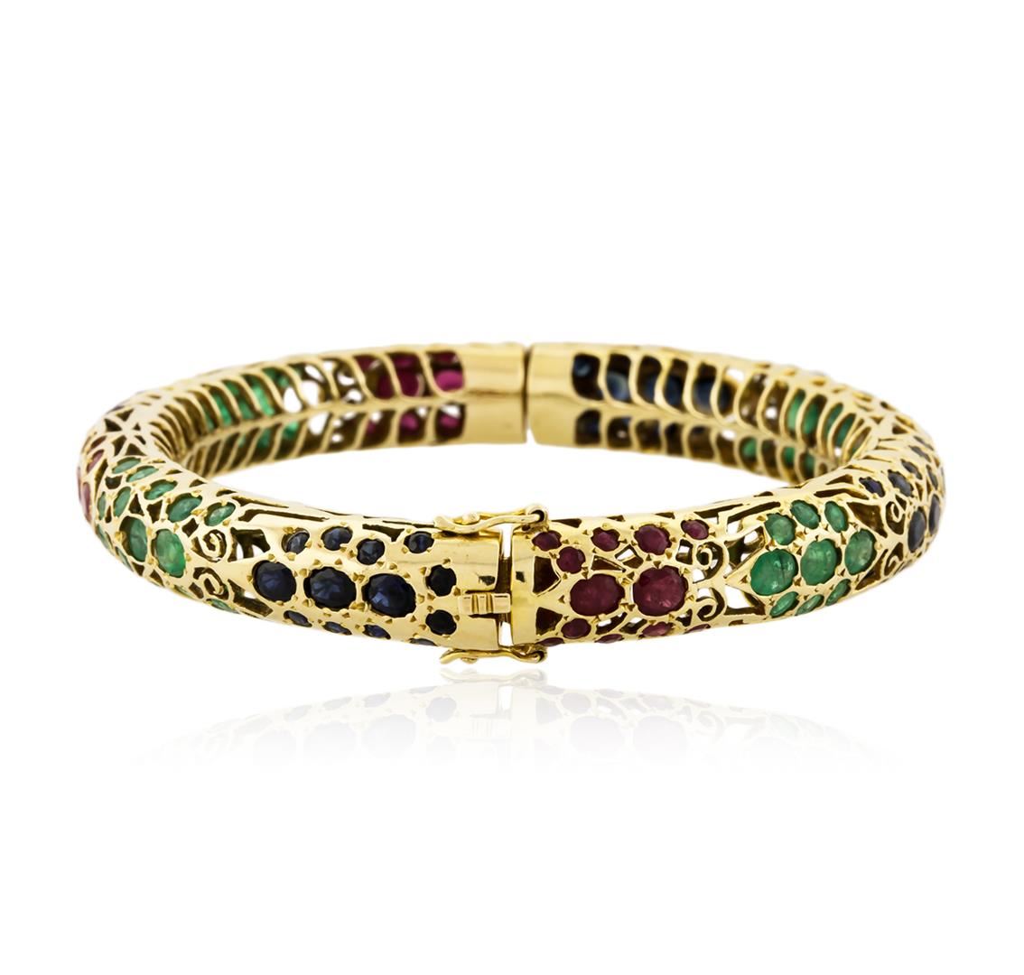 One electronically tested 14KT yellow gold ladies cast emerald, ruby and sapphire bangle bracelet with a hidden box clasp with a bright polish finish. Measurements: 2.5" in diameter Condition is very good. Containing: Forty-five prong set oval modified brilliant cut natural emeralds, measuring 6.00 x 4.00 x 2.60mm, approximate total weight of 16.20ct., clarity is heavily included, type III, medium light, moderately strong, green color, (GIA G 4/4), cut is good. Forty-two prong set oval modified brilliant cut natural rubies, measuring 6.00 x 4.00 x 2.60mm, approximate total weight of 22.26ct., clarity is heavily included, medium, moderately strong, purple red color, (GIA PR 5/4), cut is good. One prong set oval modified brilliant cut natural blue sapphire, measuring 6.00 x 4.00 x 2.60mm, approximate weight of 0.52ct., clarity is slightly included, type II, medium, moderately strong, blue color, (GIA B 5/4), cut is good. Colored gemstones are presumed to have been subjected to commonly used enhancement processes. All colored gemstones are graded in the mounting, unless otherwise stated. Total Weight of Colored Stones 38.98ct. Total Weight of Bangle Bracelet 28.20 grams. GGL Appraised at $7,245.00.