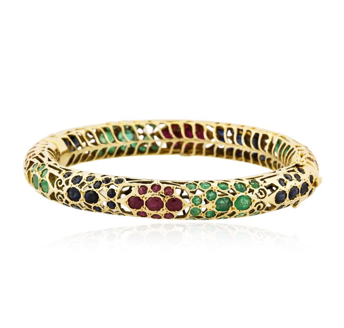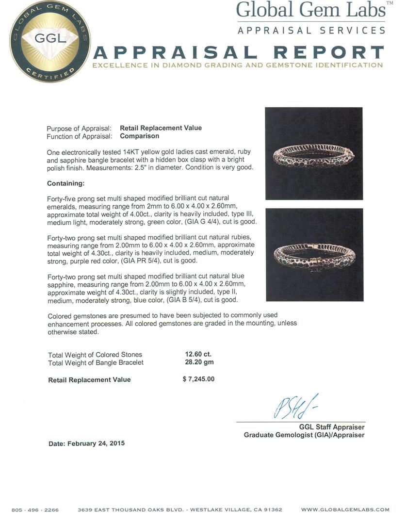 One electronically tested 14KT yellow gold ladies cast emerald, ruby and sapphire bangle bracelet with a hidden box clasp with a bright polish finish. Measurements: 2.5" in diameter Condition is very good. Containing: Forty-five prong set oval modified brilliant cut natural emeralds, measuring 6.00 x 4.00 x 2.60mm, approximate total weight of 16.20ct., clarity is heavily included, type III, medium light, moderately strong, green color, (GIA G 4/4), cut is good. Forty-two prong set oval modified brilliant cut natural rubies, measuring 6.00 x 4.00 x 2.60mm, approximate total weight of 22.26ct., clarity is heavily included, medium, moderately strong, purple red color, (GIA PR 5/4), cut is good. One prong set oval modified brilliant cut natural blue sapphire, measuring 6.00 x 4.00 x 2.60mm, approximate weight of 0.52ct., clarity is slightly included, type II, medium, moderately strong, blue color, (GIA B 5/4), cut is good. Colored gemstones are presumed to have been subjected to commonly used enhancement processes. All colored gemstones are graded in the mounting, unless otherwise stated. Total Weight of Colored Stones 38.98ct. Total Weight of Bangle Bracelet 28.20 grams. GGL Appraised at $7,245.00.