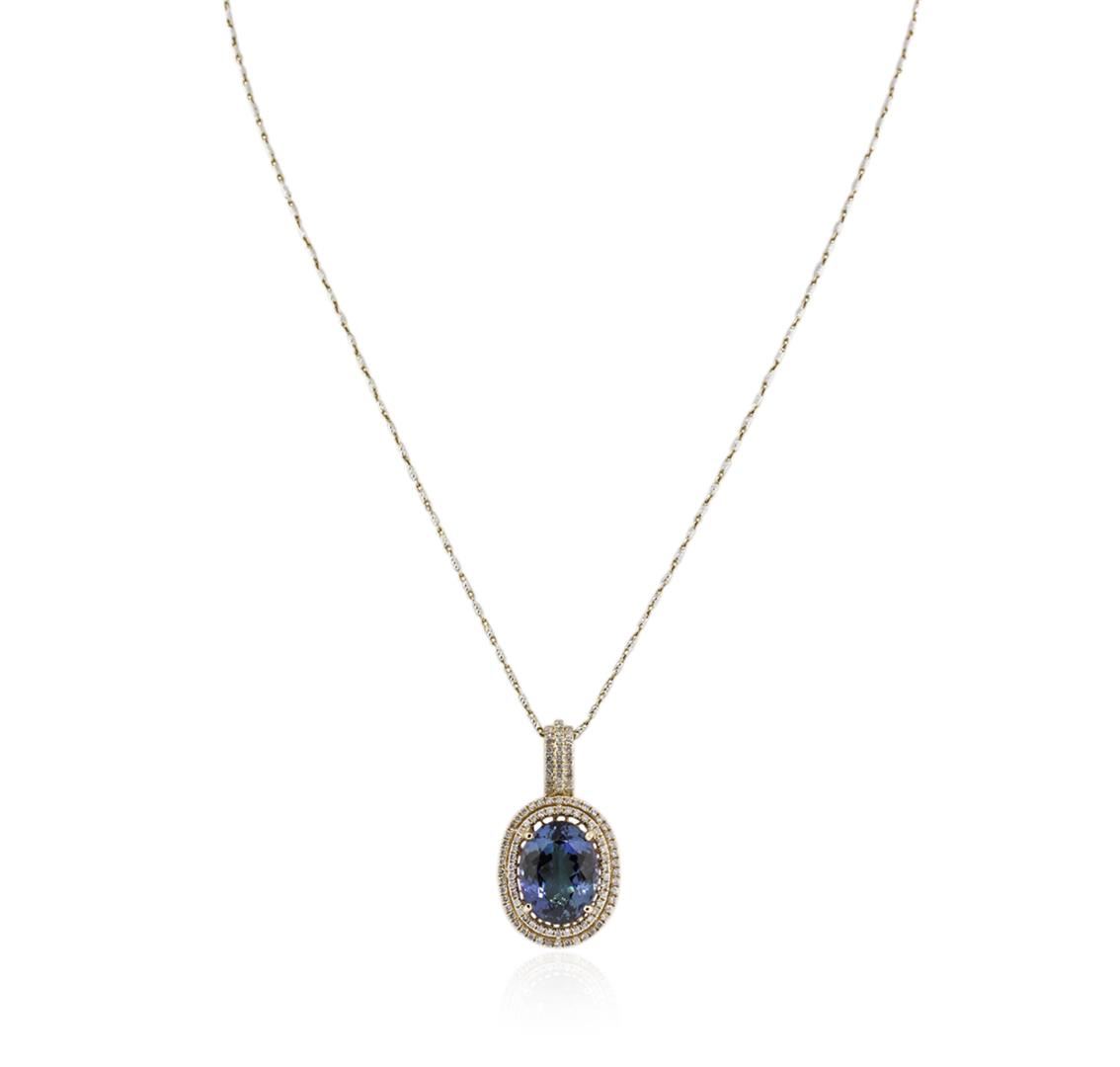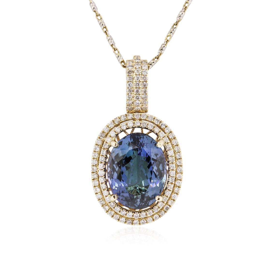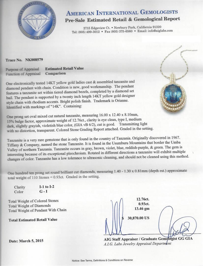 One electronically tested 14KT yellow gold ladies cast & assembled tanzanite and diamond pendant with chain. The pendant features a tanzanite set within tiered diamond bezels, completed by a diamond set bail. The pendant is supported by a twenty inch length 14KT yellow gold designer style chain with rhodium accents. Bright polish finish. Trademark is Orianne. Identified with markings of "14K". Condition is new, good workmanship. Containing: One prong set oval mixed cut natural tanzanite, measuring 16.00 x 12.40 x 8.10mm, 15%. bulge factor, approximate weight of 12.76ct., clarity is eye clean, type I, medium dark, slightly grayish, violetish blue color, (GIA vB 6/2), cut is good. Transmitting light with no distortion, transparent. Colored Stone Grading Report attached. Graded in the setting. Tanzanite is a very rare gemstone that is only found in the country of Tanzania. Originally discovered in 1967. Tiffany & Company, named the stone Tanzanite. It is found in the Usumburu Mountains that border the Umba Valley of northern Tanzania. Tanzanite occurs in gray, brown, violet, blue, reddish-purple, & green. The gem is interesting because of its exceptional pleochroism. Rotated in different directions a tanzanite will exhibit multiple changes of color. Tanzanite has a low tolerance to ultrasonic cleaning, and should not be cleaned using this method. One Hundred Ten prong set round brilliant cut diamonds, measuring 1.40 - 1.30 x 0.81mm (depth est.) approximate total weight of 110 Stones = 0.93ct. Graded in the setting. Clarity: I-1 to I-2. Color: G - I. Total Weight of Colored Stones 12.76ct. Total Weight of Diamonds 0.93ct. Total Weight of Pendant With Chain 13.46 grams. AIG Appraised at $30,870.00.