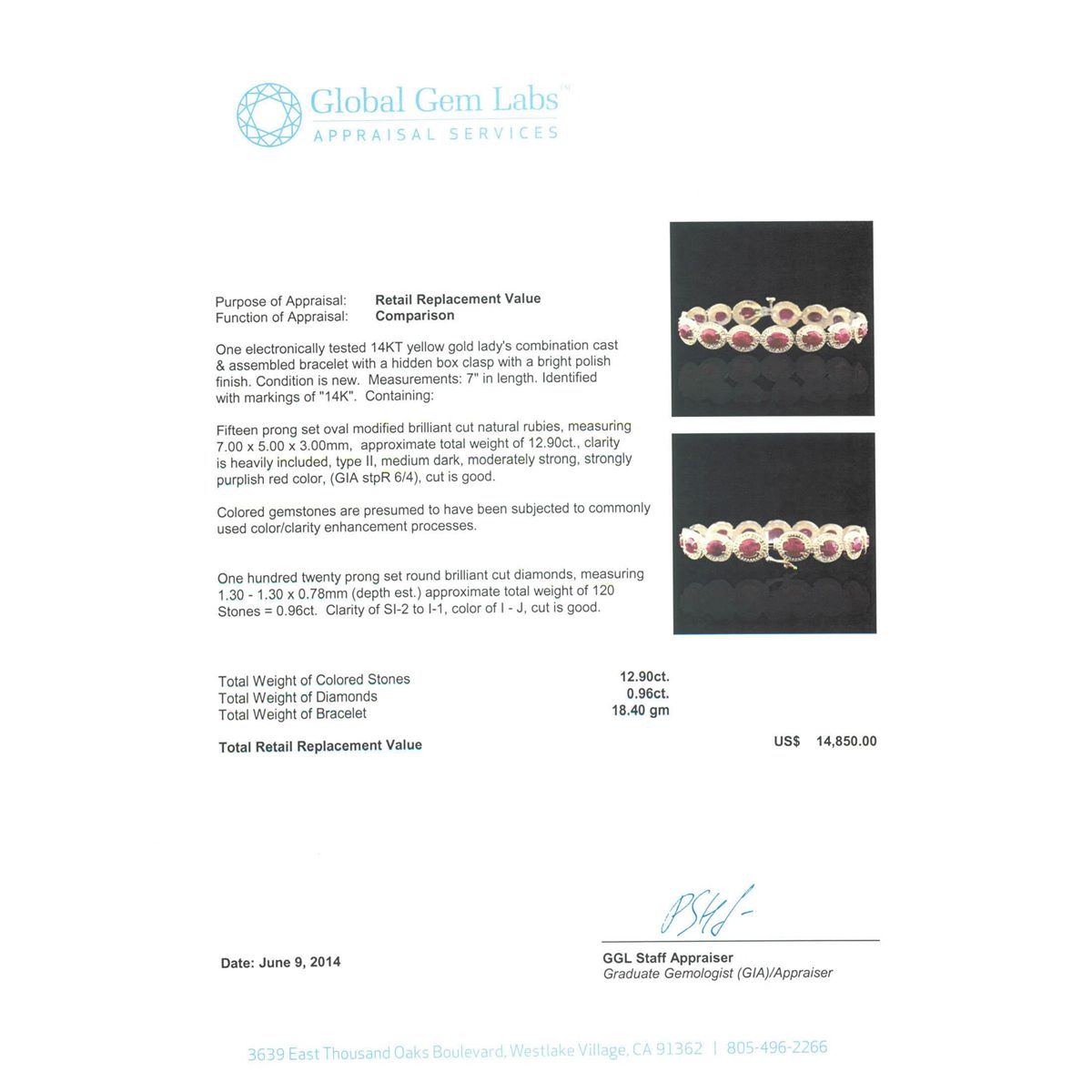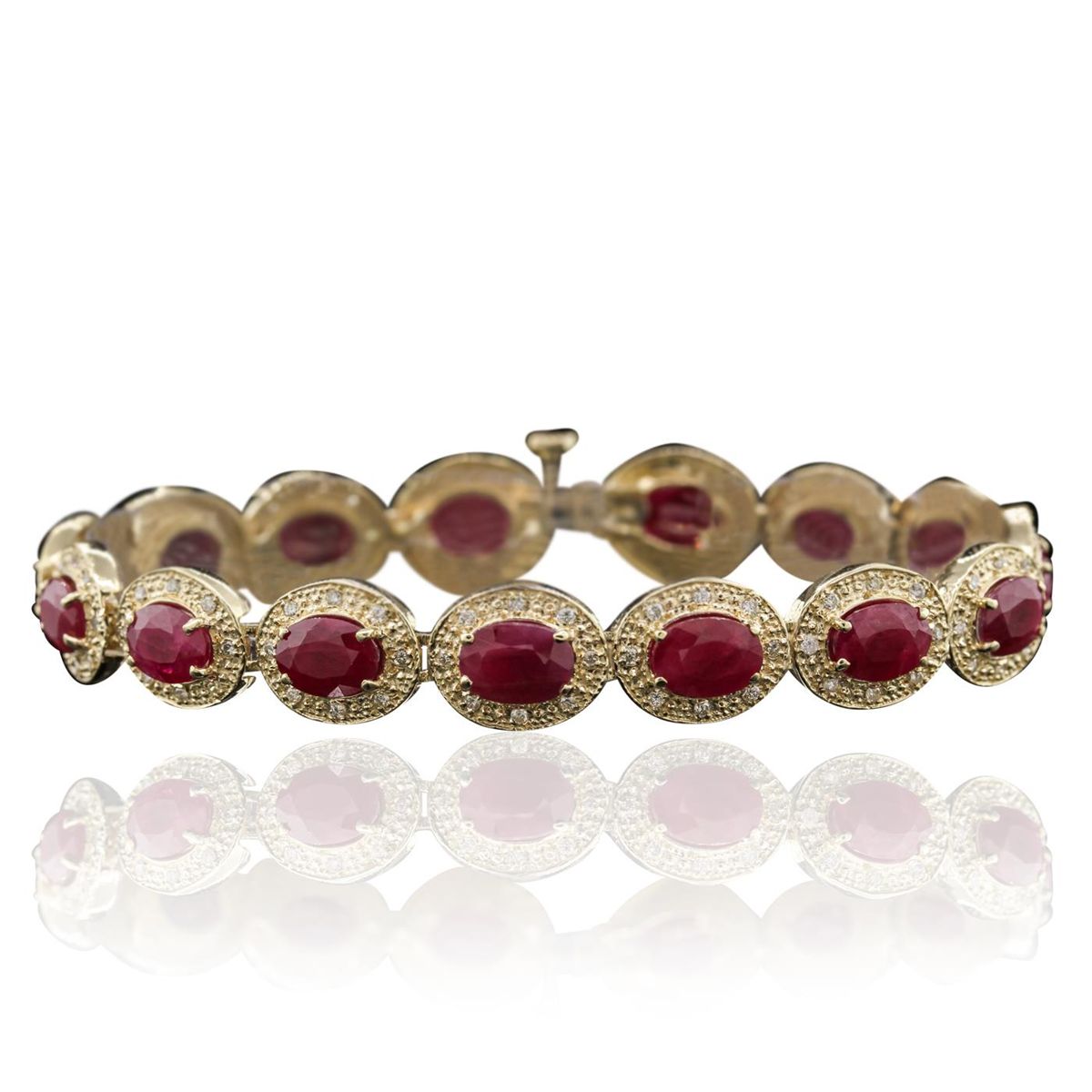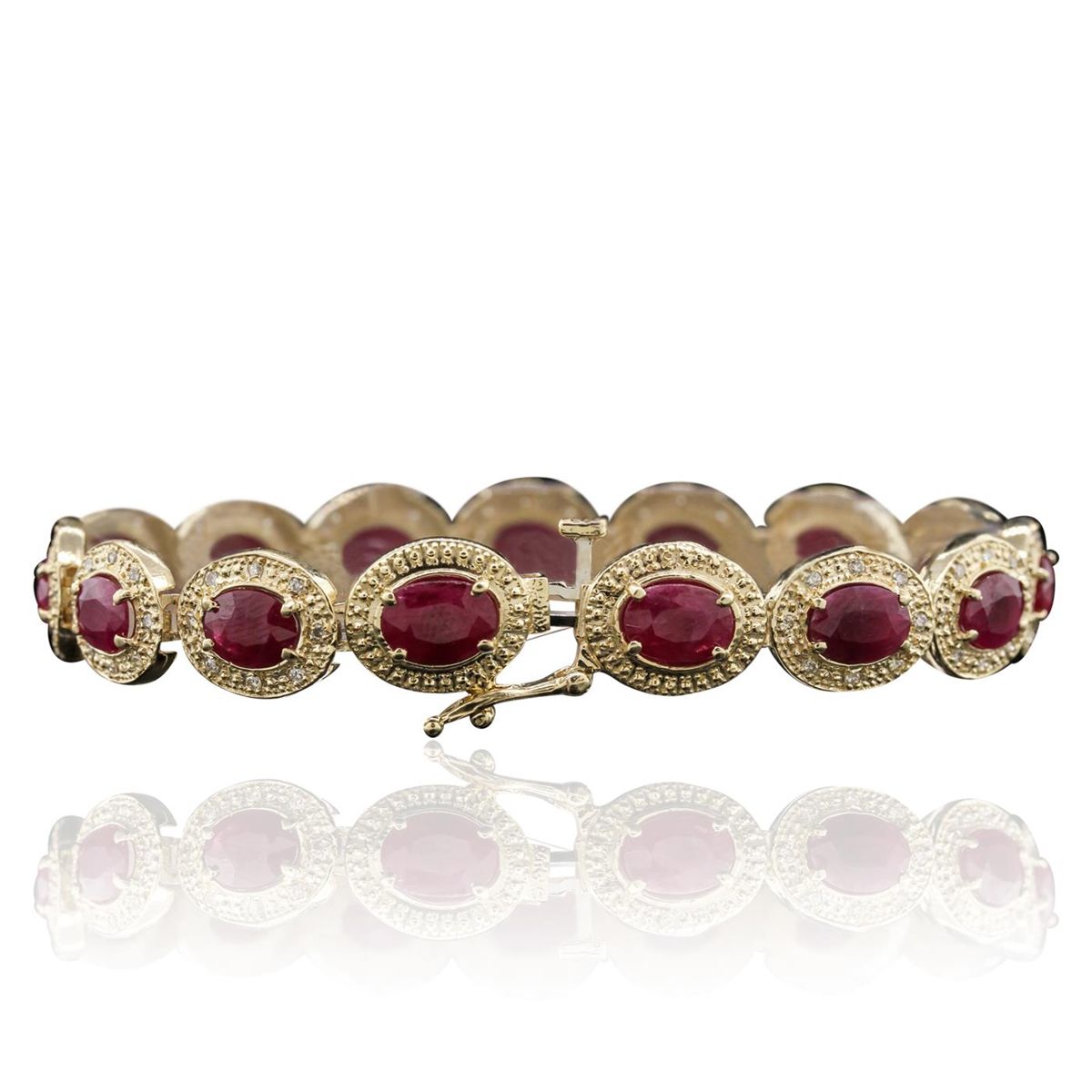 One electronically tested 14KT yellow gold Ladies combination cast & assembled bracelet with a hidden box clasp with a bright polish finish. Condition is new. Measurements: 7" in length. Identified with markings of "14K". Containing: Fifteen prong set oval modified brilliant cut natural rubies, measuring 7.00 x 5.00 x 3.00mm, approximate. Total Weight of 12.90ct., clarity is heavily included, type II, medium dark, moderately strong, strongly purplish red color, (GIA stpR 6/4), cut is good. Colored gemstones are presumed to have been subjected to commonly used color/clarity enhancement processes. One Hundred Twenty prong set round brilliant cut diamonds, measuring 1.30 - 1.30 x 0.78mm (depth est.) approximate. Total Weight of 120 Stones = 0.96ct. Clarity: SI-2 to I-1. Color: I - J, Cut is Good. Total Weight of Colored Stones 12.90ct. Total Weight of Diamonds 0.96ct. Total Weight of Bracelet 18.40 grams. GGL Appraised at $14,850.00.