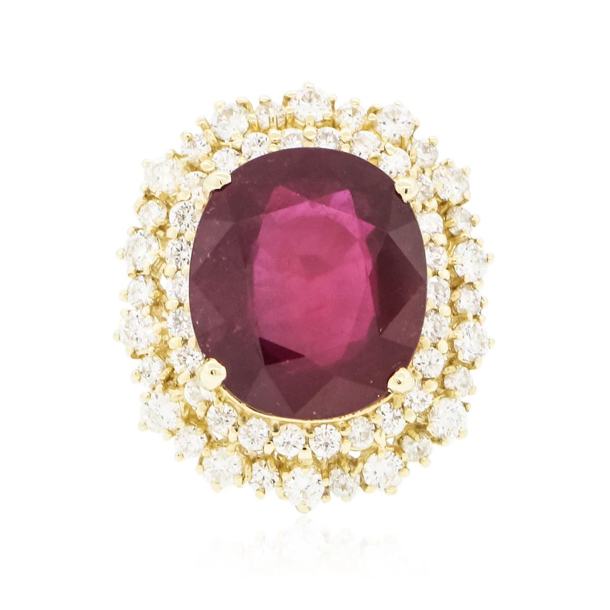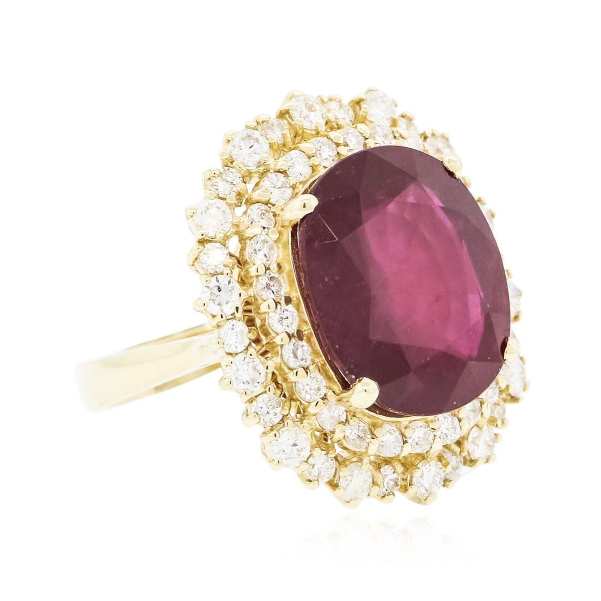 One electronically tested 14KT yellow gold Ladies combination cast & assembled ring with a bright polish finish. Condition is new. Identified with markings of "K14". Containing: One prong set oval modified brilliant cut natural ruby, measuring 15.20 x 13.40 x 7.89mm, approximate weight of 12.91ct., clarity is heavily included, type II, medium dark, moderately strong, strongly purplish red color, (GIA stpR 6/4), cut is good. Colored gemstones are presumed to have been subjected to commonly used color/clarity enhancement processes. Fifty-Five prong set round brilliant cut diamonds, measuring 2.50 - 1.60 x 1.23mm (depth est.) approximate. Total Weight of 55 Stones = 1.73ct. Clarity: I-1 to I-2. Color: I - J, Cut is Good. Total Weight of Colored Stones 12.91ct. Total Weight of Diamonds 1.73ct. Total Weight of Ring 10.00 grams. GGL Appraised at $9,420.00.