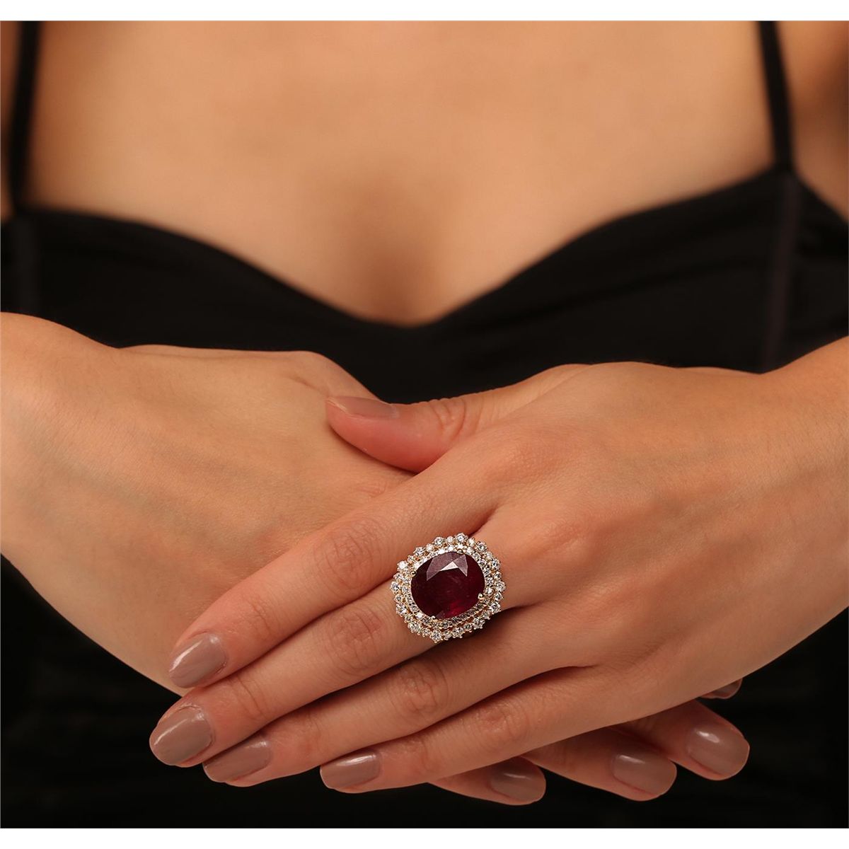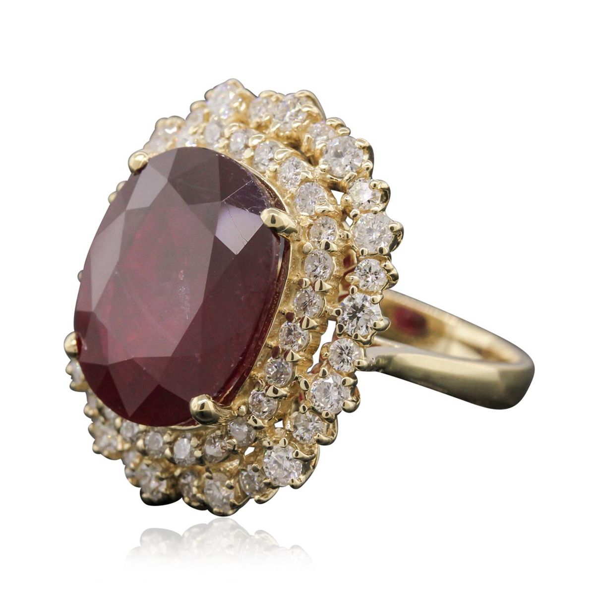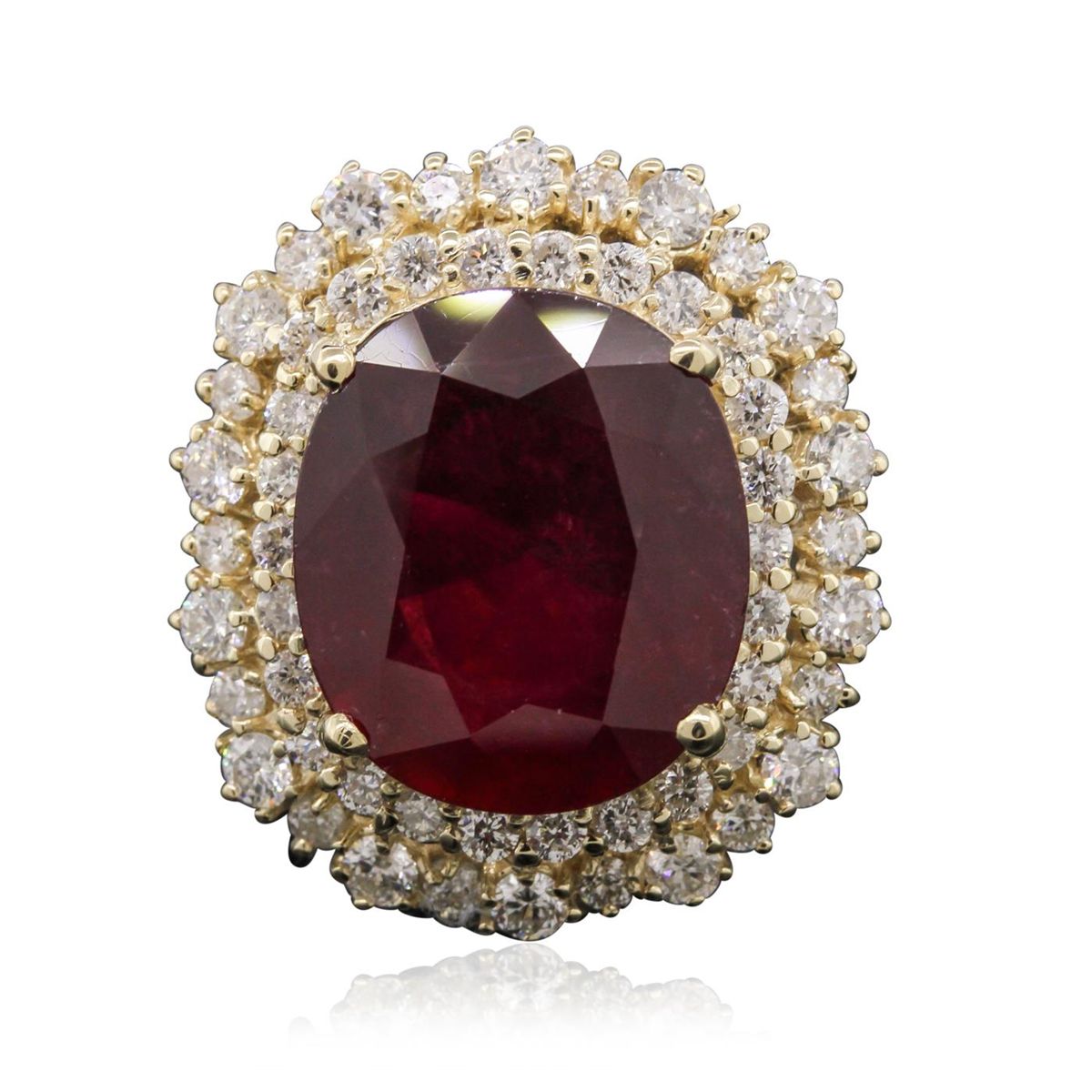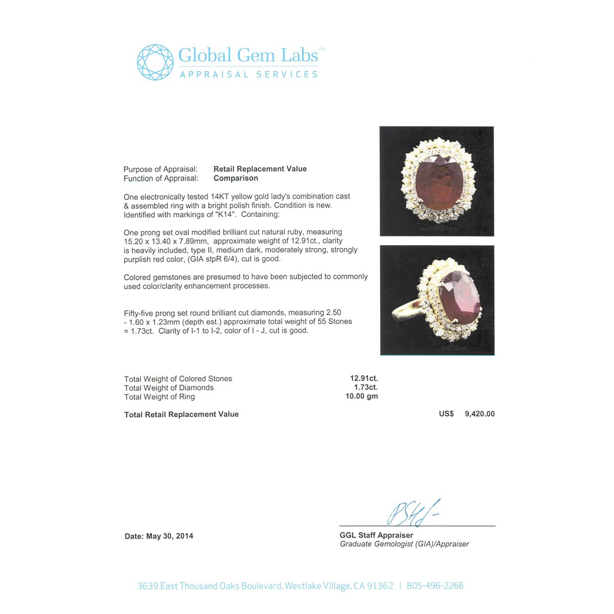 One electronically tested 14KT yellow gold Ladies combination cast & assembled ring with a bright polish finish. Condition is new. Identified with markings of "K14". Containing: One prong set oval modified brilliant cut natural ruby, measuring 15.20 x 13.40 x 7.89mm, approximate weight of 12.91ct., clarity is heavily included, type II, medium dark, moderately strong, strongly purplish red color, (GIA stpR 6/4), cut is good. Colored gemstones are presumed to have been subjected to commonly used color/clarity enhancement processes. Fifty-Five prong set round brilliant cut diamonds, measuring 2.50 - 1.60 x 1.23mm (depth est.) approximate. Total Weight of 55 Stones = 1.73ct. Clarity: I-1 to I-2. Color: I - J, Cut is Good. Total Weight of Colored Stones 12.91ct. Total Weight of Diamonds 1.73ct. Total Weight of Ring 10.00 grams. GGL Appraised at $9,420.00.
