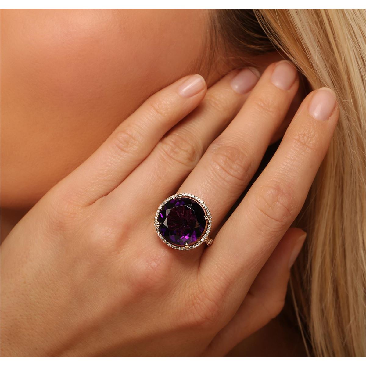 One electronically tested 14KT yellow gold ladies cast amethyst and diamond ring. Condition is new, good workmanship. The featured amethyst is set within a diamond bezel supported by diamond set shoulders, completed by a one and one-half millimeter wide band. Bright polish finish with milgrain detailing. Trademark is PMI. Identified with markings of "14K". Containing: One prong set round brilliant cut natural amethyst, measuring 16.00 - 16.00 x 8.80 mm, 8%. bulge factor, approximate weight of 12.94ct., clarity is eye clean, type II, dark, moderately strong, reddish purple color, (GIA rP 7/4), cut is good. Transmitting light with no distortion, transparent. Refractive index testing results of 1.54 to 1.55. This is a conclusive result for quartz (amethyst). Colored Stone Grading Report attached. Graded in the setting. Sixty-One prong set round brilliant cut diamonds, measuring 1.60 - 1.10 x 0.81mm (depth est.) approximate. Total Weight of 61 Stones = 0.65ct. Graded in the setting. Clarity: SI-2 to I-1. Color: G - I. Total Weight of Colored Stones 12.94ct. Total Weight of Diamonds 0.65ct. Total Weight of Ring 8.06 grams. AIG Appraised at $3,805.00.