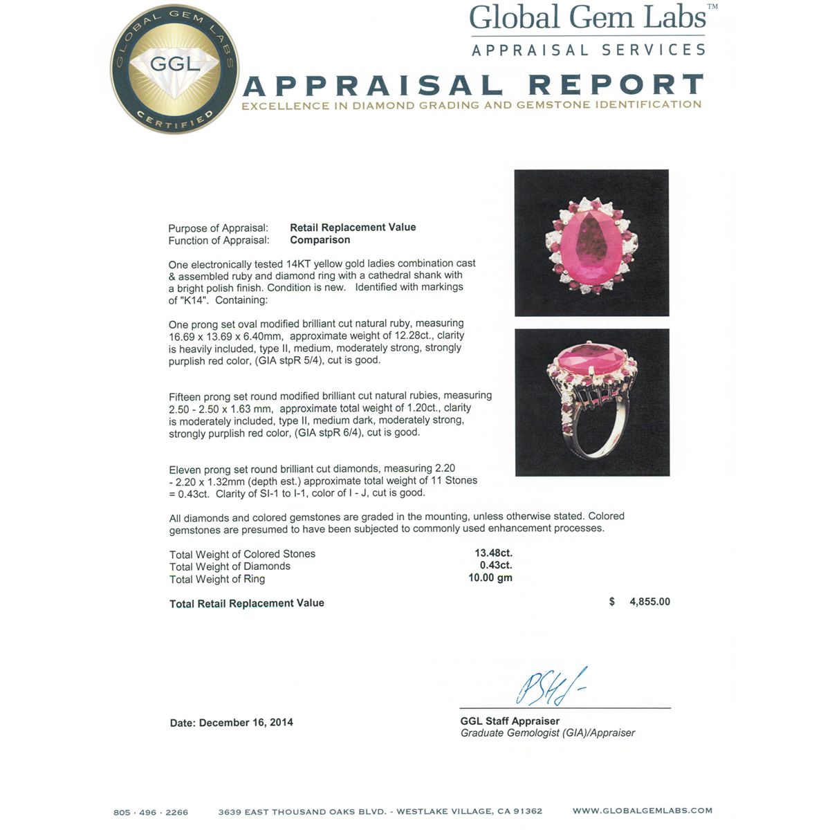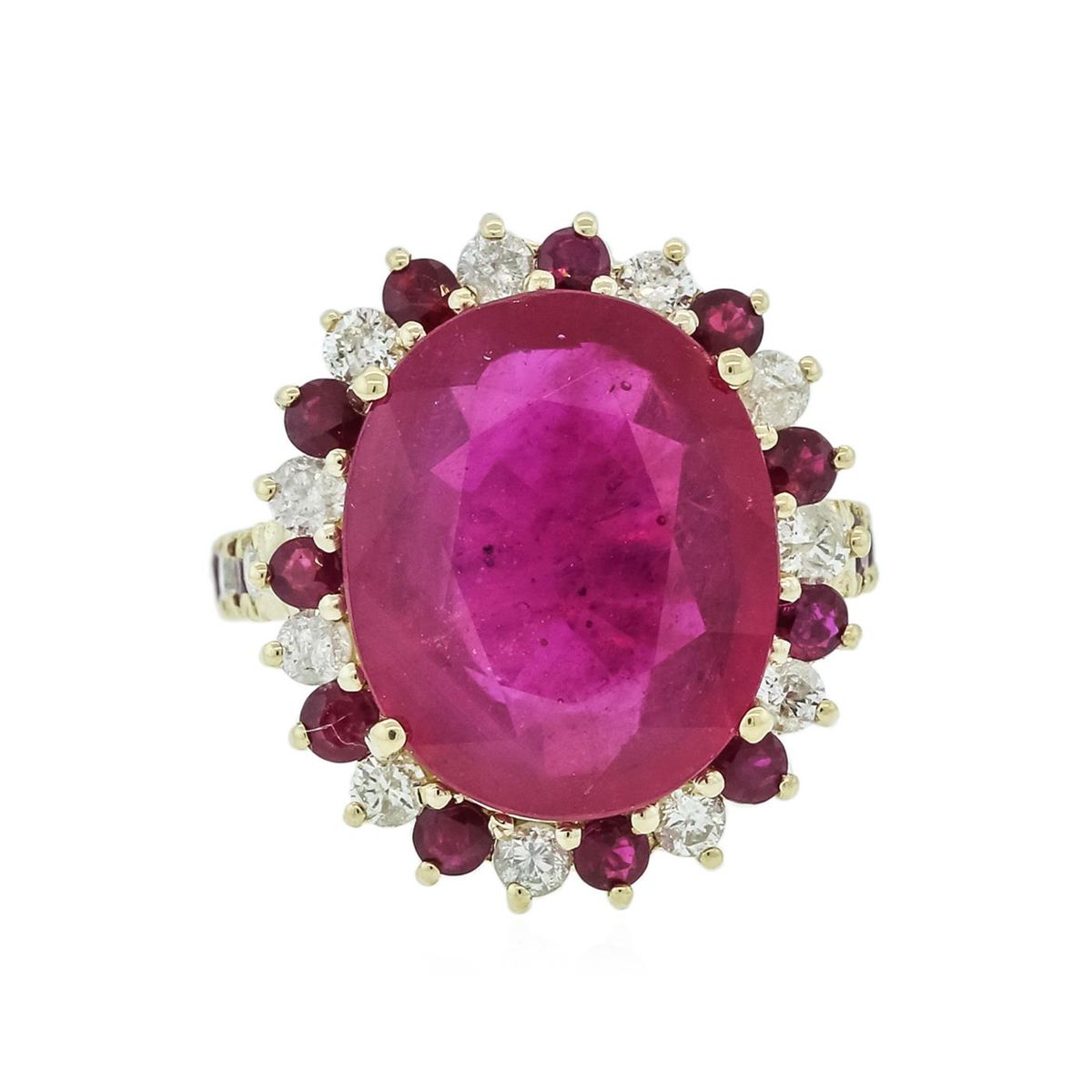One electronically tested 14KT yellow gold ladies combination cast & assembled ruby and diamond ring with a cathedral shank with a bright polish finish. Identified with markings of "K14". Condition is new. Containing: One prong set oval modified brilliant cut natural ruby, measuring 16.69 x 13.69 x 6.40mm, approximate weight of 12.28ct., clarity is heavily included, type II, medium, moderately strong, strongly purplish red color, (GIA stpR 5/4), cut is good. Fifteen prong set round modified brilliant cut natural rubies, measuring 2.50 - 2.50 x 1.63 mm, approximate total weight of 1.20ct., clarity is moderately included, type II, medium dark, moderately strong, strongly purplish red color, (GIA stpR 6/4), cut is good. Eleven prong set round brilliant cut diamonds, measuring 2.20 - 2.20 x 1.32mm (depth est.) approximate total weight of 11 Stones = 0.43ct. Clarity: SI-1 to I-1. Color: I - J, Cut is Good. All diamonds and colored gemstones are graded in the mounting, unless otherwise stated. Colored gemstones are presumed to have been subjected to commonly used enhancement processes.. Total Weight of Colored Stones 13.48ct. Total Weight of Diamonds 0.43ct. Total Weight of Ring 10.00 grams. GGL Appraised at $4,855.00.
