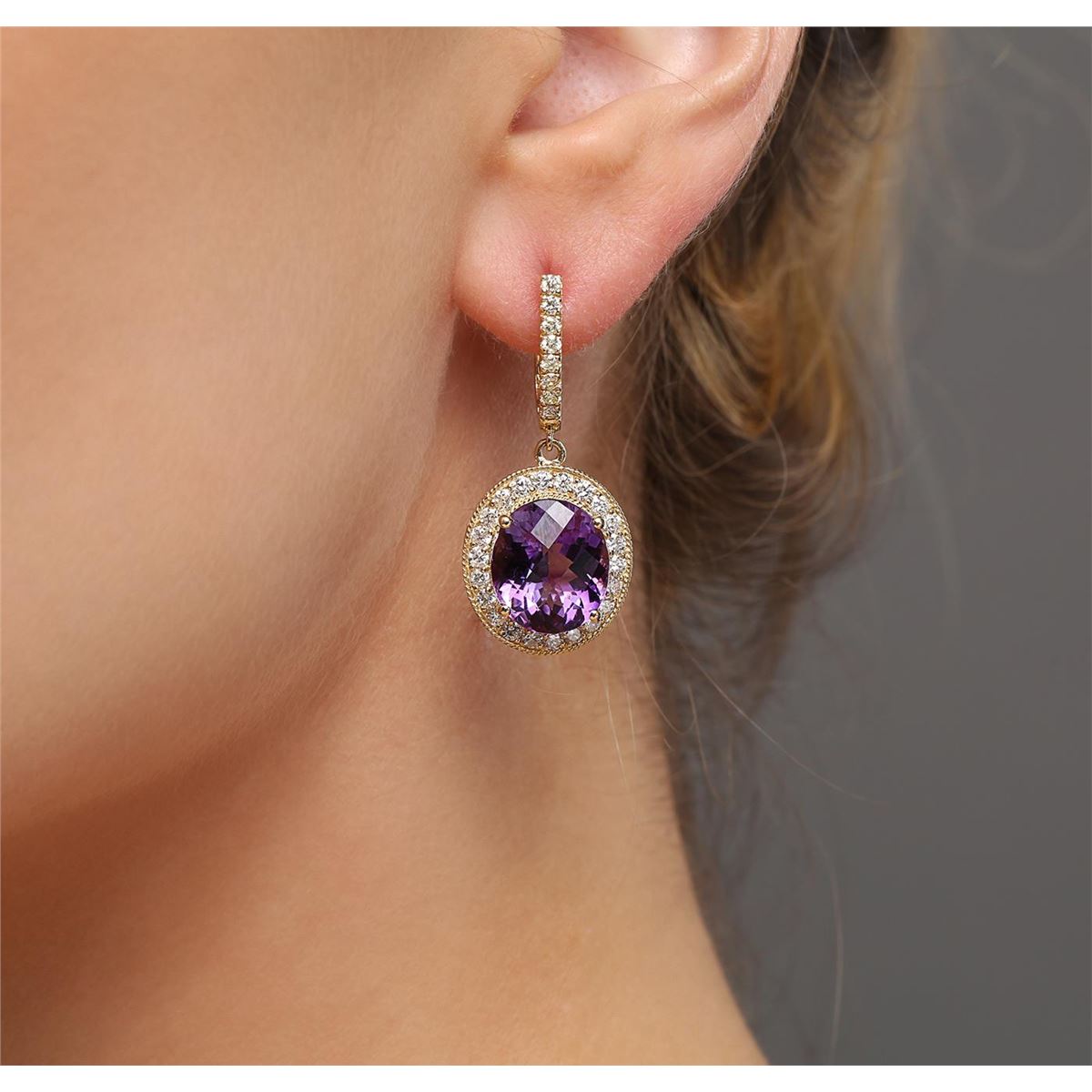 One pair electronically tested 14KT yellow gold ladies cast amethyst and diamond earrings with hinged clip backs with a bright polish finish. Identified with markings of "14K". Condition is new. Containing: Two prong set oval modified mixed cut natural amethysts, measuring 13.00 x 12.00 x 7.80mm, approximate total weight of 13.60ct., clarity is eye clean, type II, medium, moderately strong, purple color, (GIA P 5/4), cut is good. Sixty-Six prong set round brilliant cut diamonds, measuring 1.90 - 1.90 x 1.14mm (depth est.) approximate total weight of 66 Stones = 1.66ct. Clarity: I-1 to I-2. Color: I - J, Cut is Good. Colored gemstones are presumed to have been subjected to commonly used enhancement processes. All diamonds and colored gemstones are graded in the mounting, unless otherwise stated. Total Weight of Colored Stones 13.60ct. Total Weight of Diamonds 1.66ct. Total Weight of Earrings 12.00 grams. GGL Appraised at $6,685.00.