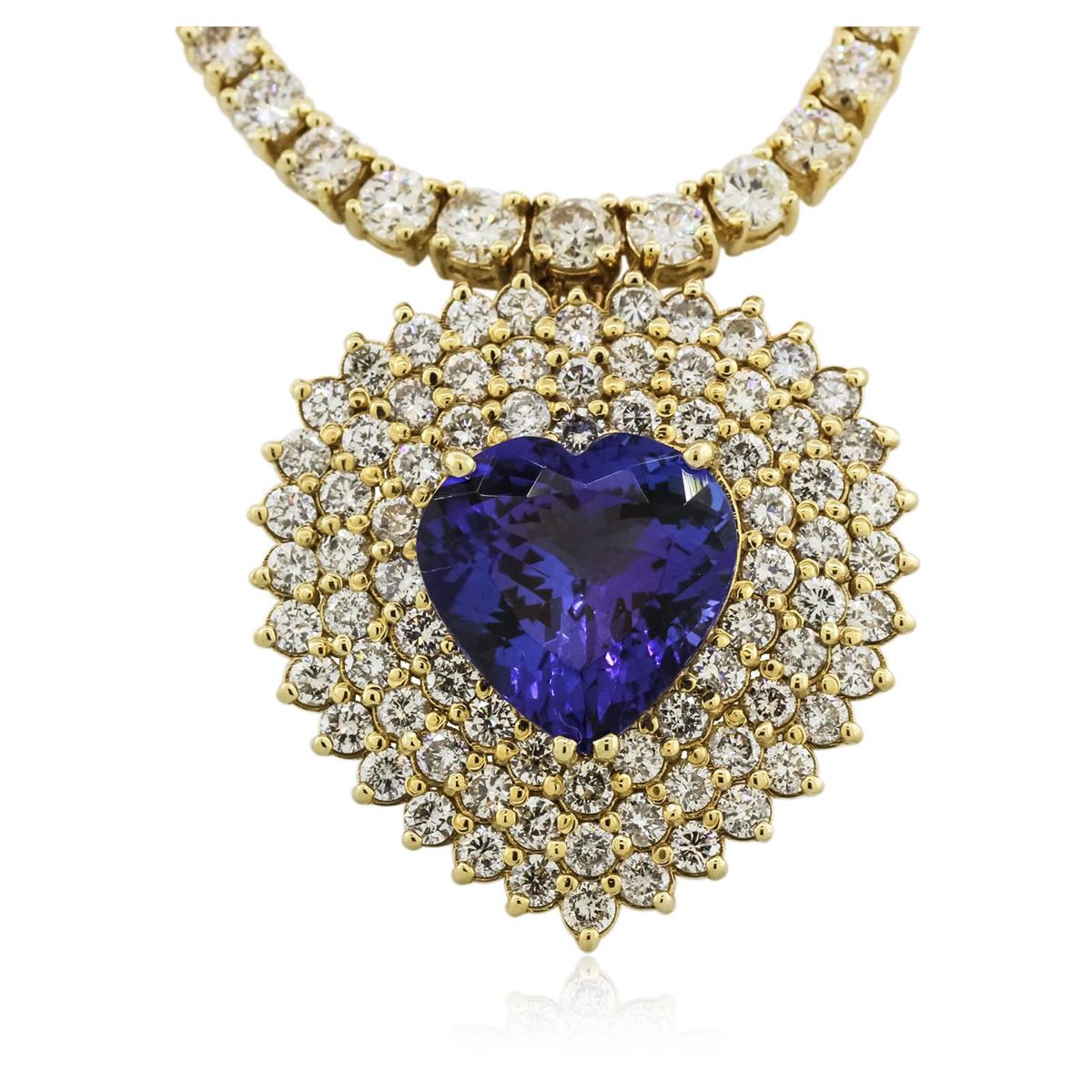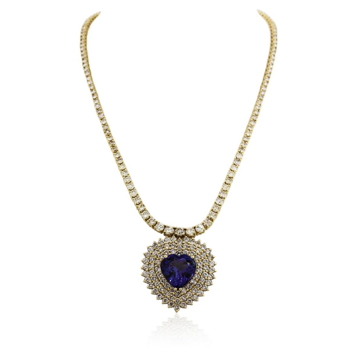 One electronically tested 14KT yellow gold Ladies combination cast & assembled necklace with a hidden box clasp with a bright polish finish. Condition is new. Measurements: 16" in length. Identified with markings of "14K". Containing: One prong set heart modified brilliant cut natural tanzanite, measuring 16.06 x 15.93 x 8.68mm, exact weight 13.62ct., clarity is eye clean, type I, medium, moderately strong, bluish violet color, (GIA bV 5/4), cut is very good. GIA Report: 1156961713. One Hundred Seventy-Nine prong set round brilliant cut diamonds, measuring 3.20 - 2.50 x 1.71mm (depth est.) approximate. Total Weight of 179 Stones = 15.16ct. Clarity: SI-2 to I-1. Color: J - K, Cut is Good. Twenty-Seven prong set round brilliant cut diamonds, measuring 4.50 - 3.50 x 2.40mm (depth est.) approximate. Total Weight of 27 Stones = 6.32ct. Clarity: SI-2 to I-1. Color: J - K, Cut is Good. Total Weight of Colored Stones 13.62ct. Total Weight of Diamonds 21.48ct. Total Weight of Necklace 38.90 grams. GGL Appraised at $80,140.00.