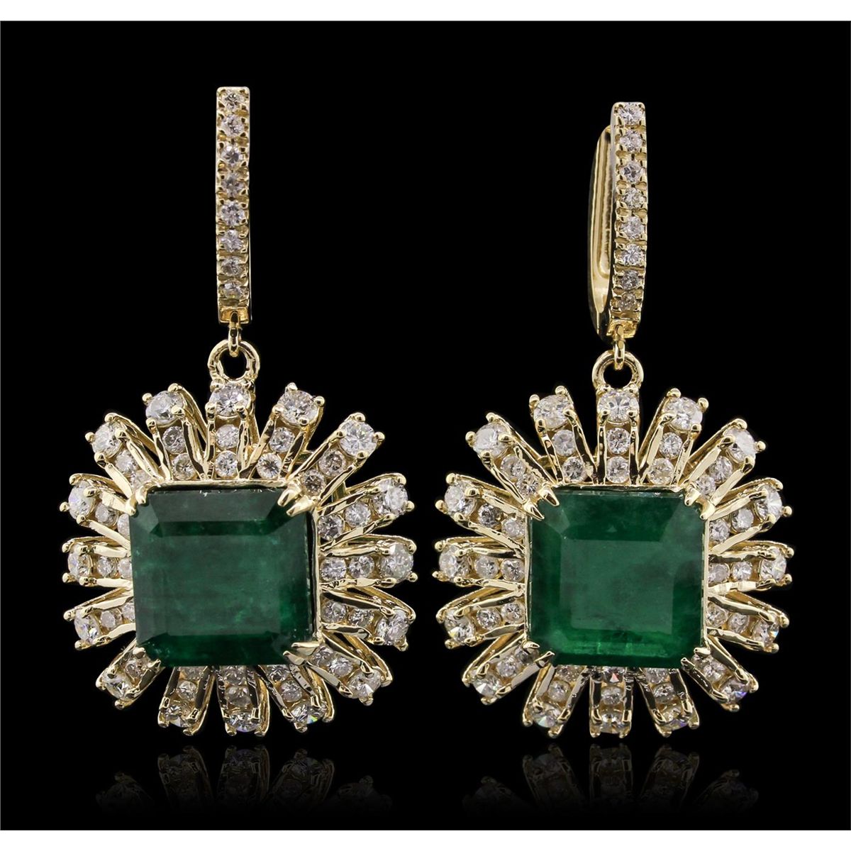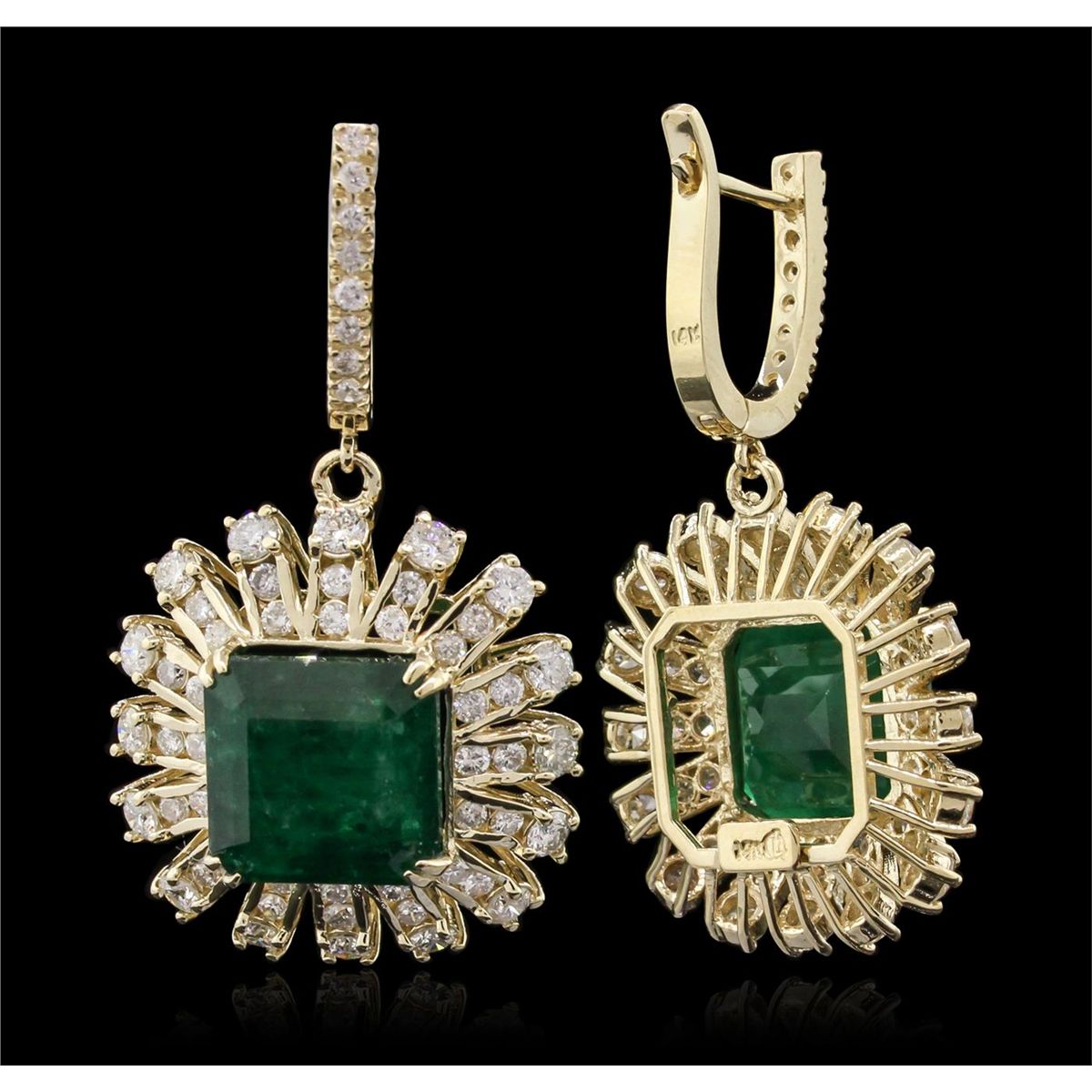 One pair electronically tested 14KT yellow gold ladies cast & assembled emerald and diamond earrings with hinged, snap locking posts. Condition is new, good workmanship. Each earring features an emerald and tiered diamond drop, completed by a diamond set huggie. Bright polish finish. Condition is new, good workmanship. Identified with markings of "14K". Containing: Two prong set square step cut natural emeralds, measuring 11.70 x 11.50 x 7.50mm, 8%. bulge factor, approximate. Total Weight of 13.62ct., clarity is heavily included, type III, medium dark, moderately strong, very slightly bluish green color, (GIA vslbG 6/4), cut is good. Transmitting light with a minimum of distortion, transparent. Naturally occurring internal & external characteristics are present. Measurements & the color grade are an average for the pair. Indications of oil residue. Graded in the setting. Thirty-Two prong set round brilliant cut diamonds, measuring 2.70 - 2.60 x 1.59mm (depth est.) approximate. Total Weight of 32 Stones = 2.27ct. Graded in the setting. Clarity: SI-1 to I-1. Color: G - I Eighty prong and channel set round brilliant cut diamonds, measuring 1.80 - 1.60 x 1.02mm (depth est.) approximate. Total Weight of 80 Stones = 1.53ct. Graded in the setting. Clarity: SI-1 to I-1. Color: G - I. Total Weight of Colored Stones 13.62ct. Total Weight of Diamonds 3.80ct. Total Weight of Earrings 16.30gm. AIG Appraised at $43,810.00.
