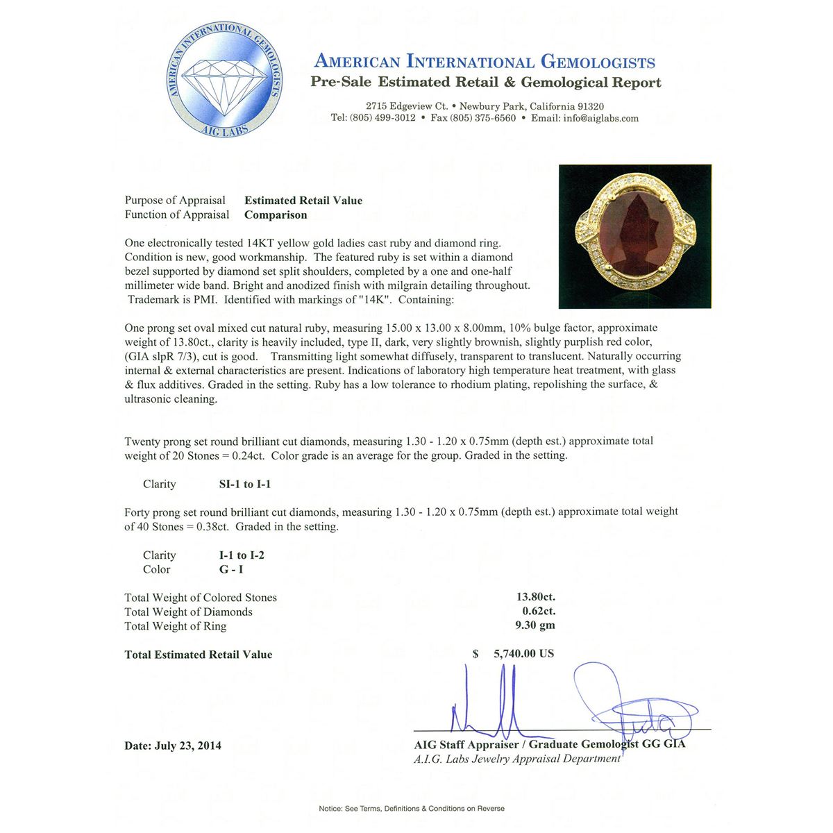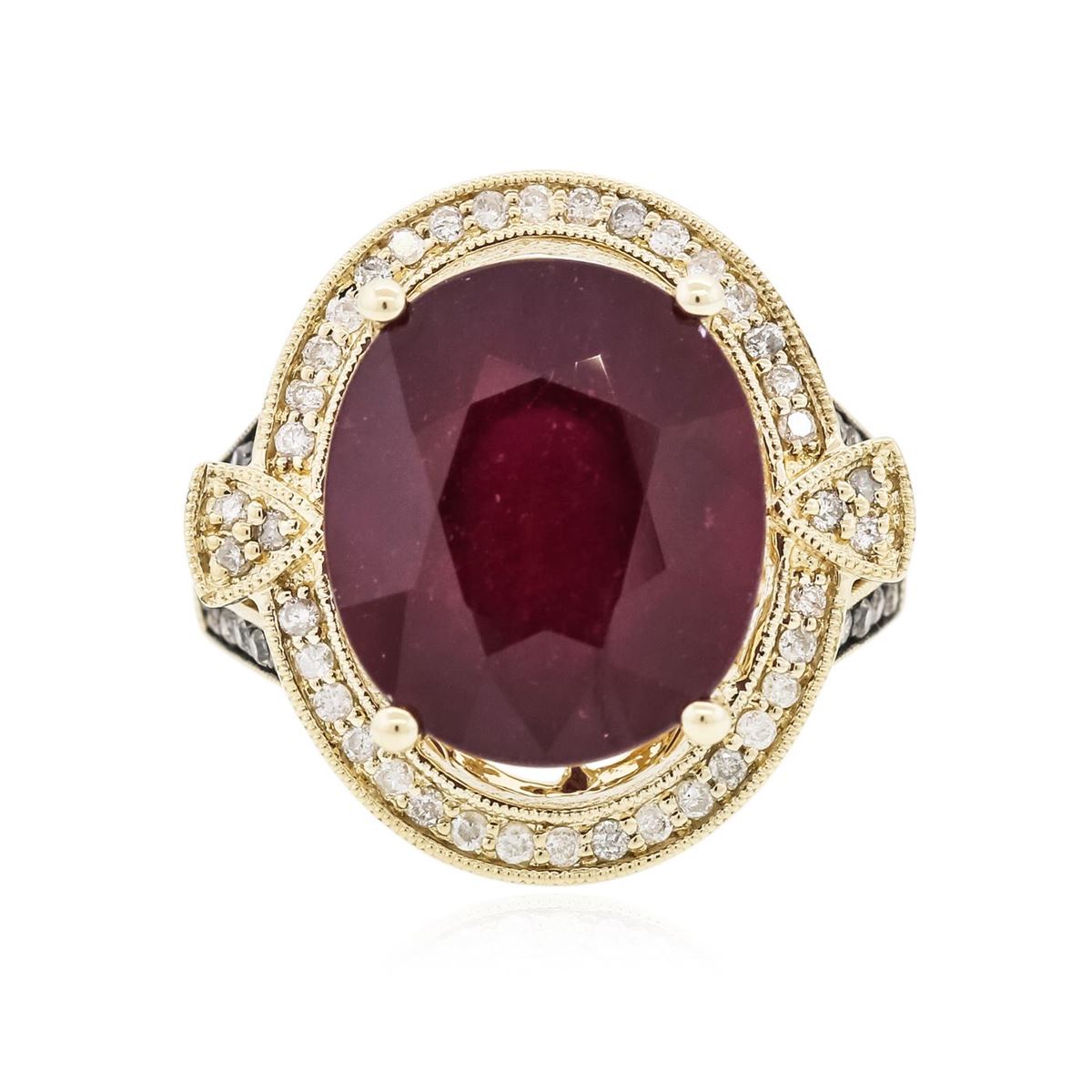 One electronically tested 14KT yellow gold ladies cast ruby and diamond ring. Condition is new, good workmanship. The featured ruby is set within a diamond bezel supported by diamond set split shoulders, completed by a one and one-half millimeter wide band. Bright and anodized finish with milgrain detailing throughout. Trademark is PMI. Identified with markings of "14K". Containing: One prong set oval mixed cut natural ruby, measuring 15.00 x 13.00 x 8.00mm, 10%. bulge factor, approximate weight of 13.80ct., clarity is heavily included, type II, dark, very slightly brownish, slightly purplish red color, (GIA slpR 7/3), cut is good. Transmitting light somewhat diffusely, transparent to translucent. Naturally occurring internal & external characteristics are present. Indications of laboratory high temperature heat treatment, with glass & flux additives. Graded in the setting. Ruby has a low tolerance to rhodium plating, repolishing the surface, & ultrasonic cleaning. Twenty prong set round brilliant cut diamonds, measuring 1.30 - 1.20 x 0.75mm (depth est.) approximate. Total Weight of 20 Stones = 0.24ct. Color grade is an average for the group. Graded in the setting. Clarity: SI-1 to I-1 Forty prong set round brilliant cut diamonds, measuring 1.30 - 1.20 x 0.75mm (depth est.) approximate. Total Weight of 40 Stones = 0.38ct. Graded in the setting. Clarity: I-1 to I-2. Color: G - I. Total Weight of Colored Stones 13.80ct. Total Weight of Diamonds 0.62ct. Total Weight of Ring 9.30 grams. AIG Appraised at $5,740.00.