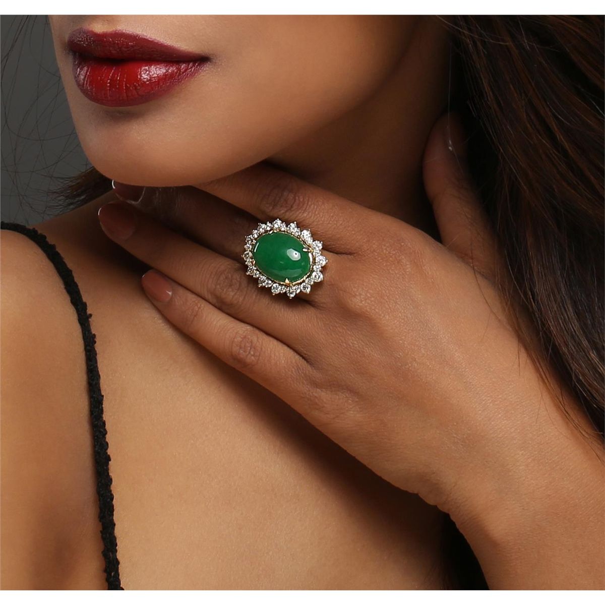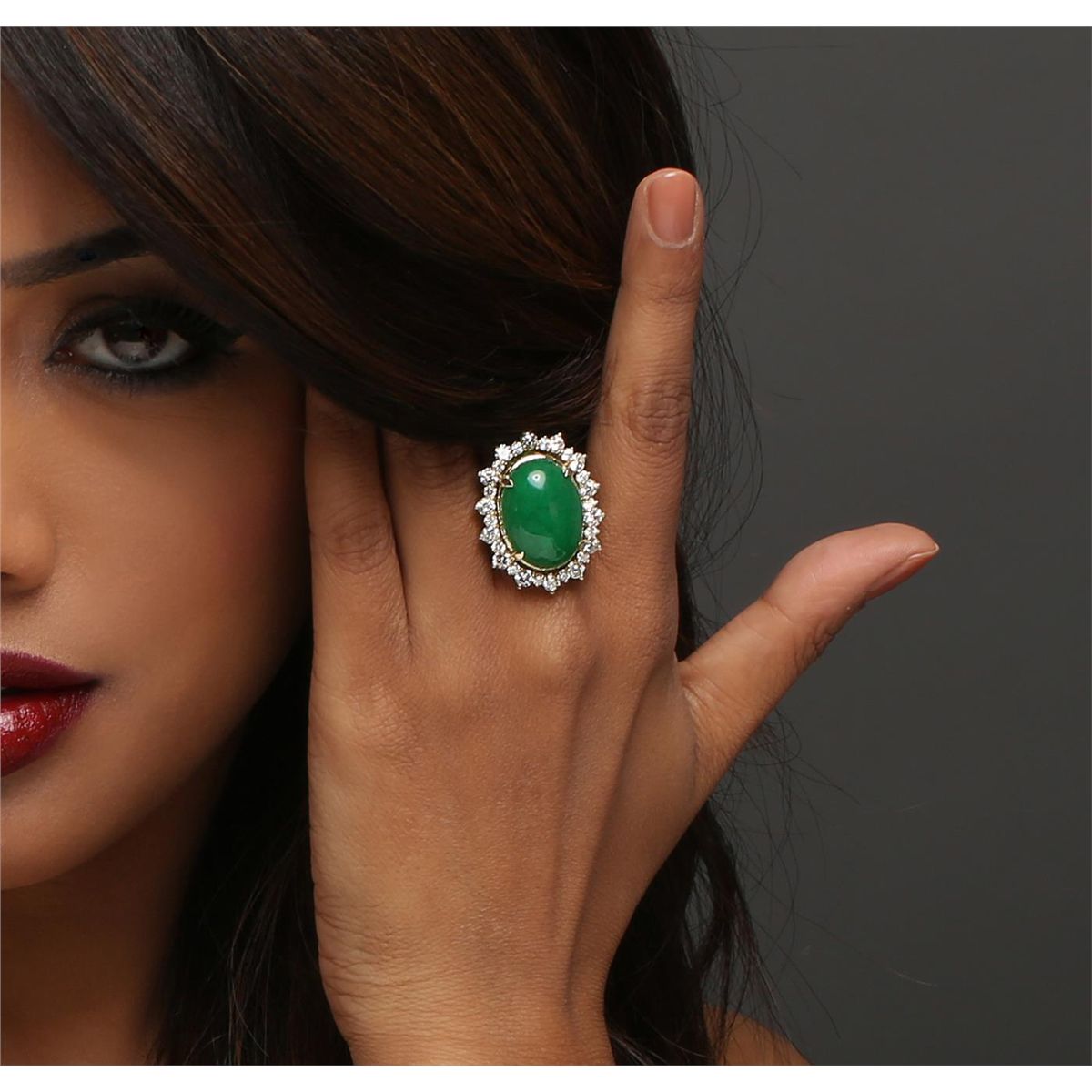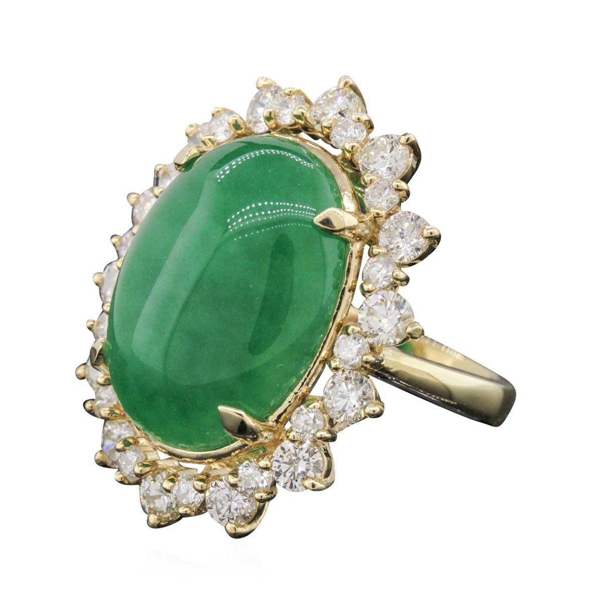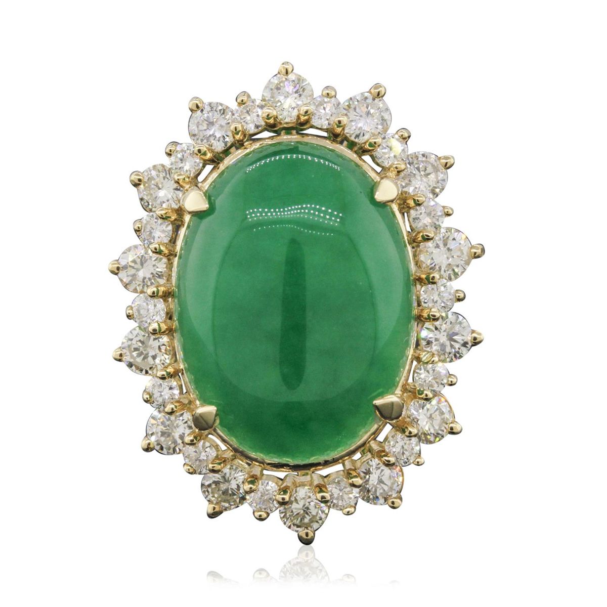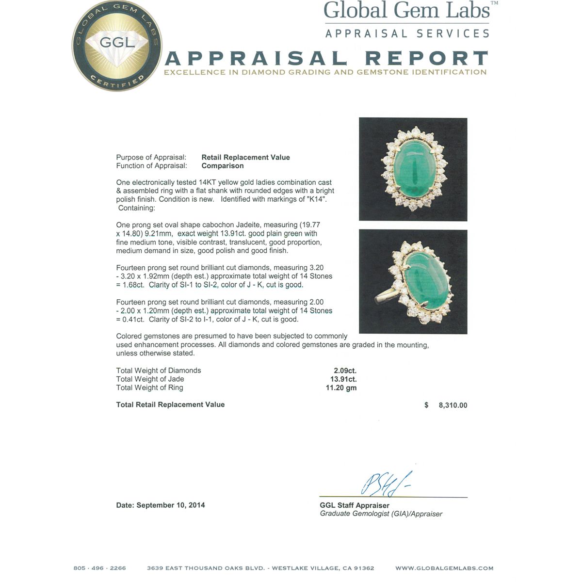 One electronically tested 14KT yellow gold ladies combination cast & assembled ring with a flat shank with rounded edges with a bright polish finish. Identified with markings of "K14". Condition is new. Containing: One prong set oval shape cabochon Jadeite, measuring (19.77 x 14.80) 9.21mm, exact weight 13.91ct. good plain green with fine medium tone, visible contrast, translucent, good proportion, medium demand in size, good polish and good finish. Fourteen prong set round brilliant cut diamonds, measuring 3.20 - 3.20 x 1.92mm (depth est.) approximate total weight of 14 Stones = 1.68ct. Clarity: SI-1 to SI-2. Color: J - K, Cut is Good. Fourteen prong set round brilliant cut diamonds, measuring 2.00 - 2.00 x 1.20mm (depth est.) approximate total weight of 14 Stones = 0.41ct. Clarity: SI-2 to I-1. Color: J - K, Cut is Good. Colored gemstones are presumed to have been subjected to commonly used enhancement processes. All diamonds and colored gemstones are graded in the mounting, unless otherwise stated. Total Weight of Diamonds 2.09ct. Total Weight of Jade 13.91ct. Total Weight of Ring 11.20 grams. GGL Appraised at $8,310.00.