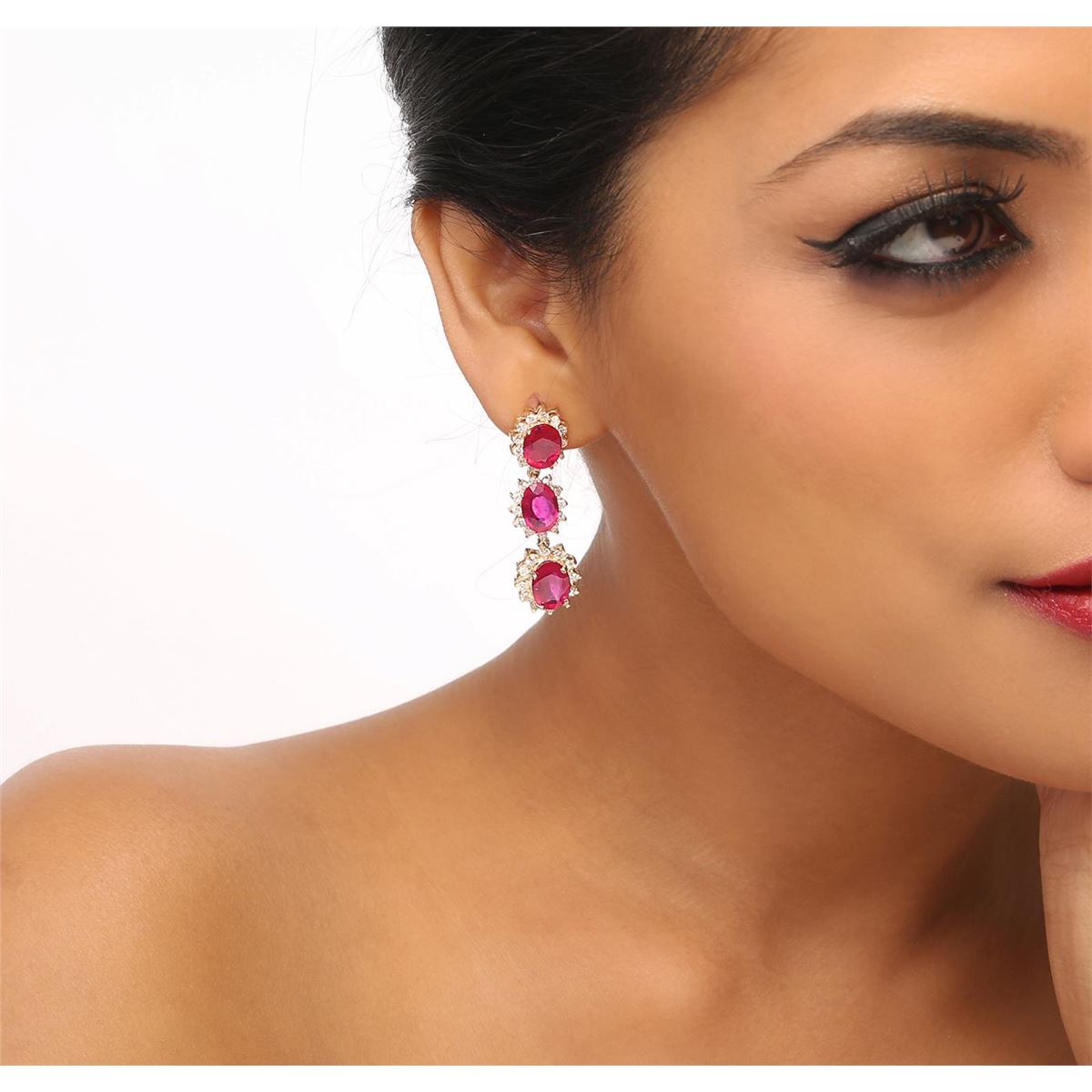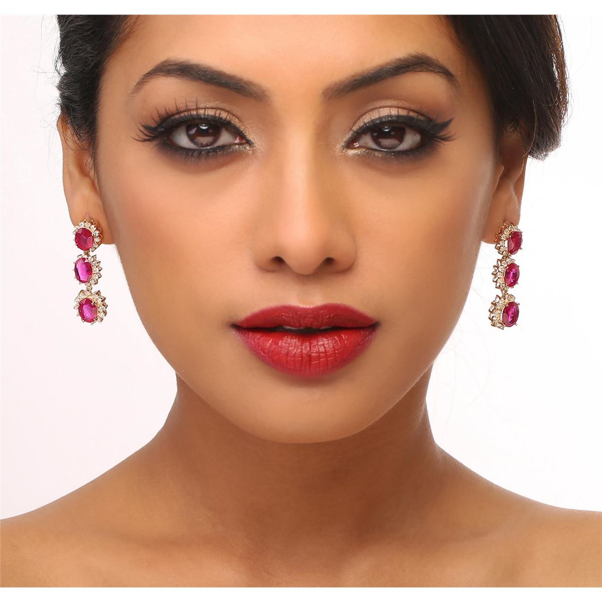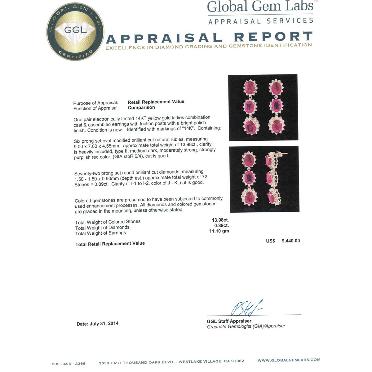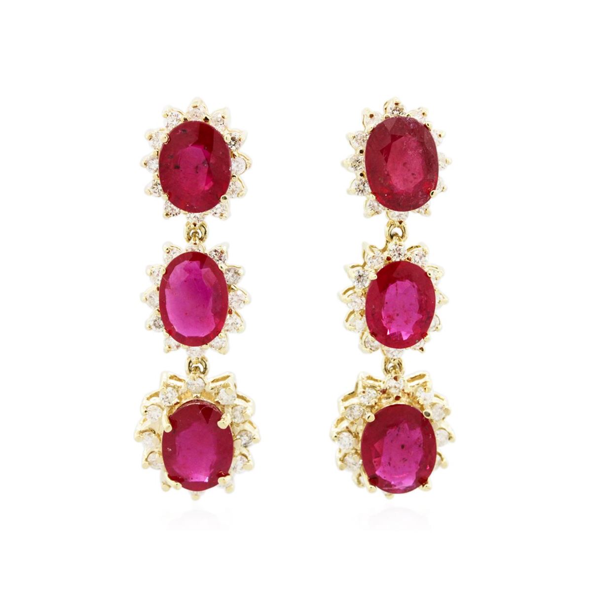 One pair electronically tested 14KT yellow gold ladies combination cast & assembled earrings with friction posts with a bright polish finish. Condition is new. Identified with markings of "14K". Containing: Six prong set oval modified brilliant cut natural rubies, measuring 9.00 x 7.00 x 4.55mm, approximate. Total Weight of 13.98ct., clarity is heavily included, type II, medium dark, moderately strong, strongly purplish red color, (GIA stpR 6/4), cut is good. Seventy-Two prong set round brilliant cut diamonds, measuring 1.50 - 1.50 x 0.90mm (depth est.) approximate. Total Weight of 72 Stones = 0.89ct. Clarity: I-1 to I-2. Color: J - K, Cut is Good. Colored gemstones are presumed to have been subjected to commonly used enhancement processes. All diamonds and colored gemstones are graded in the mounting, unless otherwise stated. Total Weight of Colored Stones 13.98ct. Total Weight of Diamonds 0.89ct. Total Weight of Earrings 11.10 grams. GGL Appraised at $9,440.00.