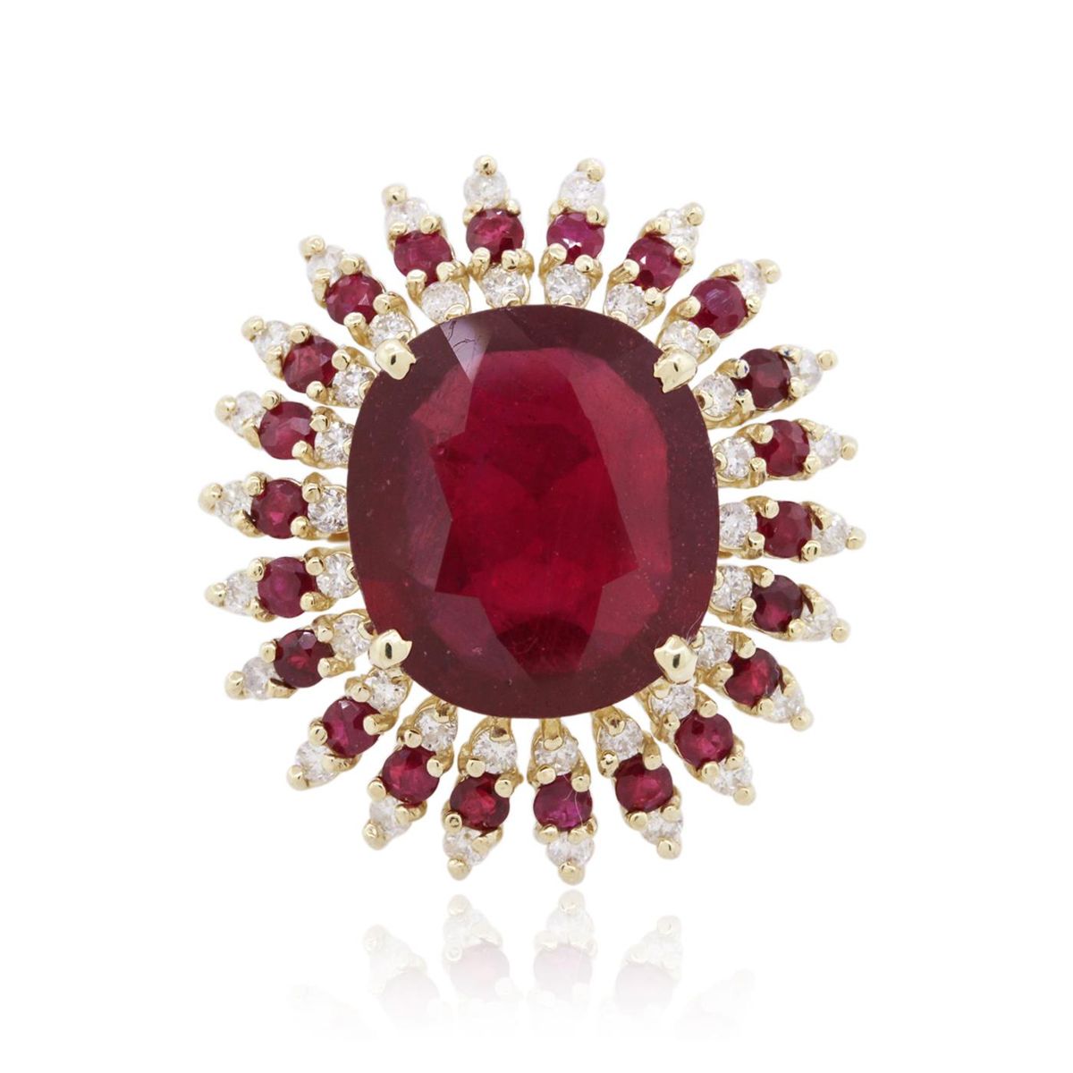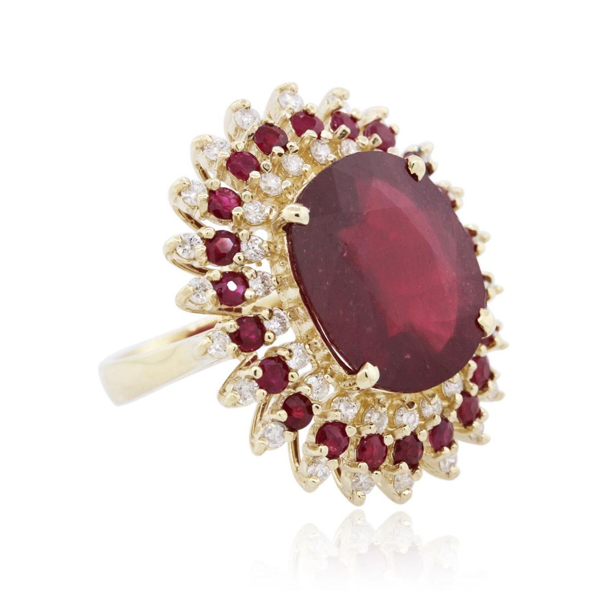 One electronically tested 14KT yellow gold ladies combination cast & assembled ruby and diamond ring with a bright polish finish. Identified with markings of "K14". Condition is new. Containing: One prong set oval modified brilliant cut natural ruby, measuring 16.50 x 14.20 x 6.50mm, approximate weight of 12.79ct., clarity is heavily included, type II, medium dark, very slightly brownish, strongly purplish red color, (GIA stpR 6/3), cut is good. Twenty-two prong set round modified brilliant cut natural rubies, measuring 2.20 - 2.20 x 1.43 mm, approximate total weight of 1.32ct., clarity is heavily included, type II, medium dark, very slightly brownish, strongly purplish red color, (GIA stpR 6/3), cut is good. Forty-Four prong set round brilliant cut diamonds, measuring 1.50 - 1.50 x 0.90mm (depth est.) approximate total weight of 44 Stones = 0.54ct. Clarity: I-1 to I-2. Color: K - L, Cut is Good. Colored gemstones are presumed to have been subjected to commonly used enhancement processes. All diamonds and colored gemstones are graded in the mounting, unless otherwise stated. Total Weight of Colored Stones 14.11ct. Total Weight of Diamonds 0.54ct. Total Weight of Ring 13.20 grams. GGL Appraised at $6,250.00.